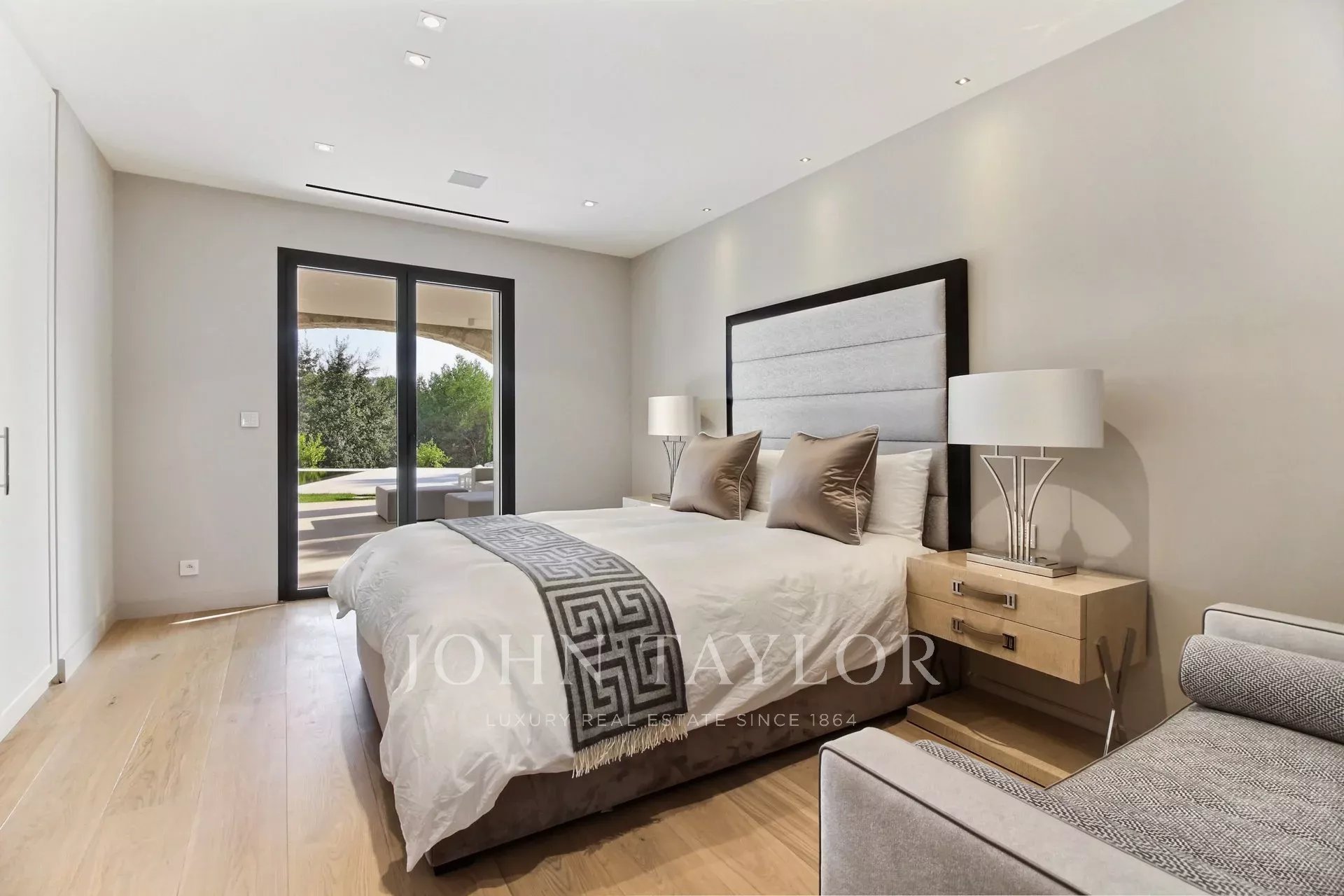 The property's exteriors and amenities include a heated mirror pool, a fully equipped poolhouse, a summer kitchen, a sheltered lounge area and a pétanque court.
