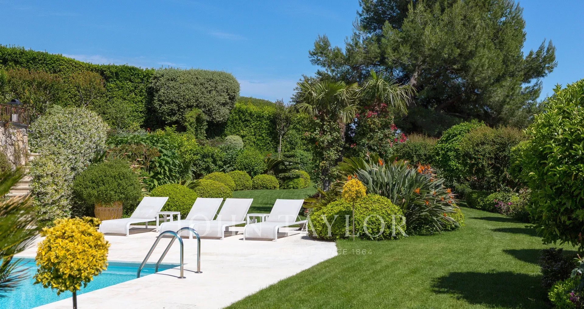 Nestled in a beautifully manicured landscaped garden, the villa is surrounded by Mediterranean trees and lush greenery.