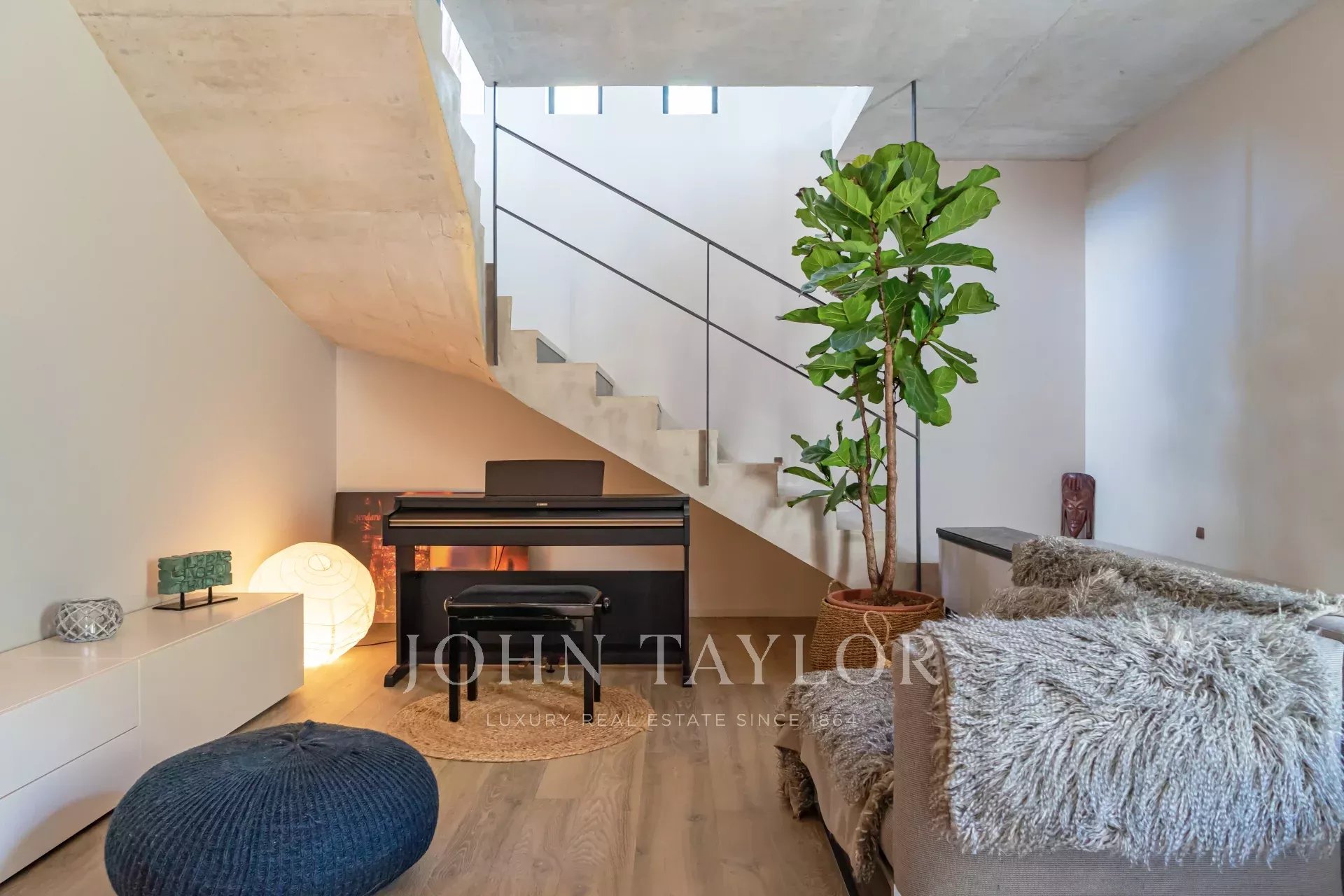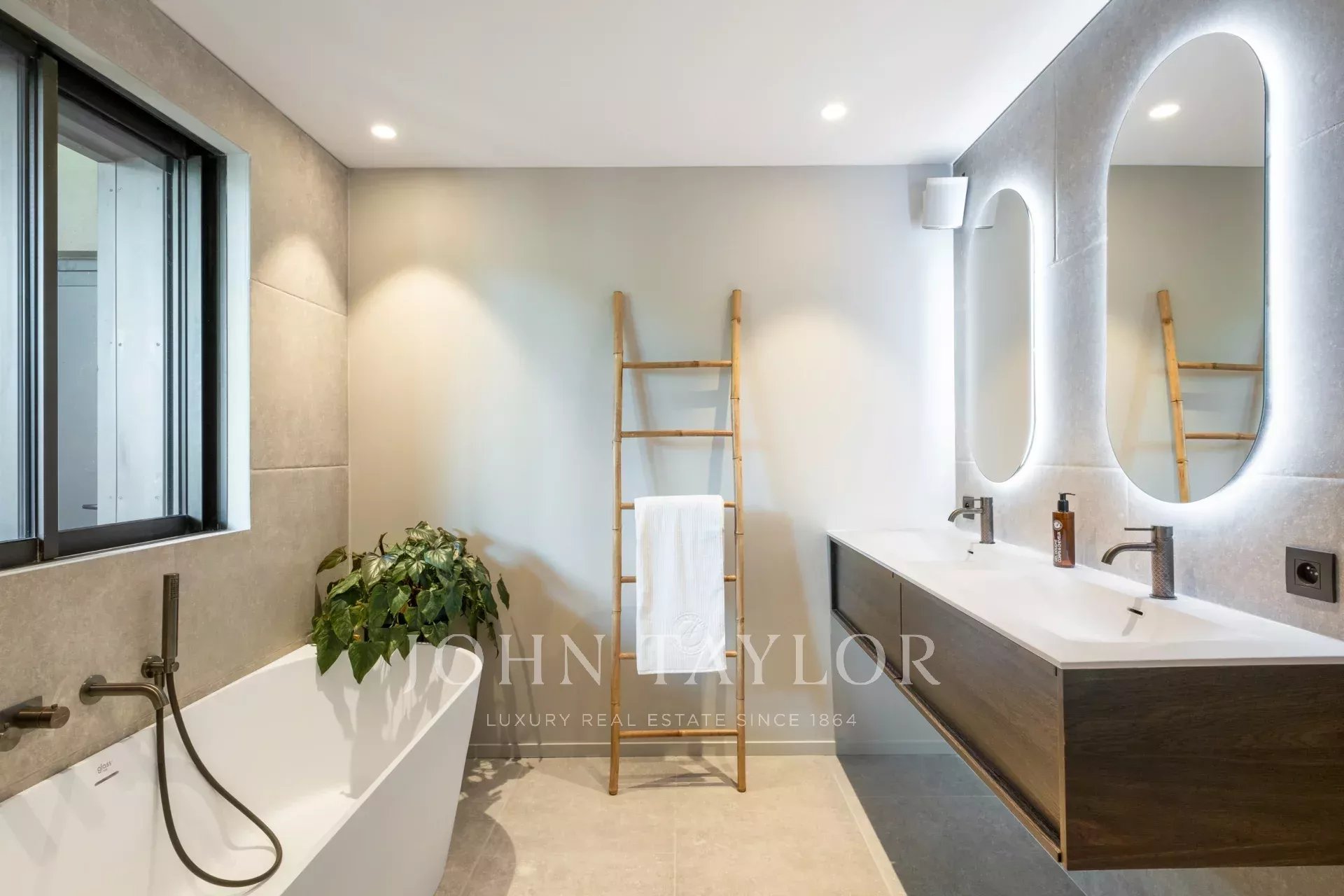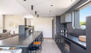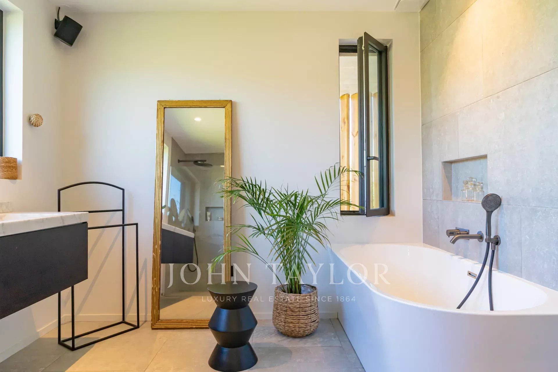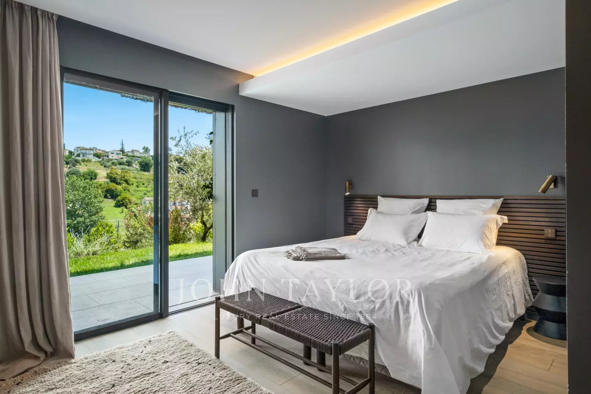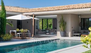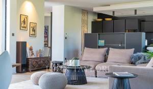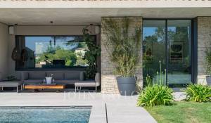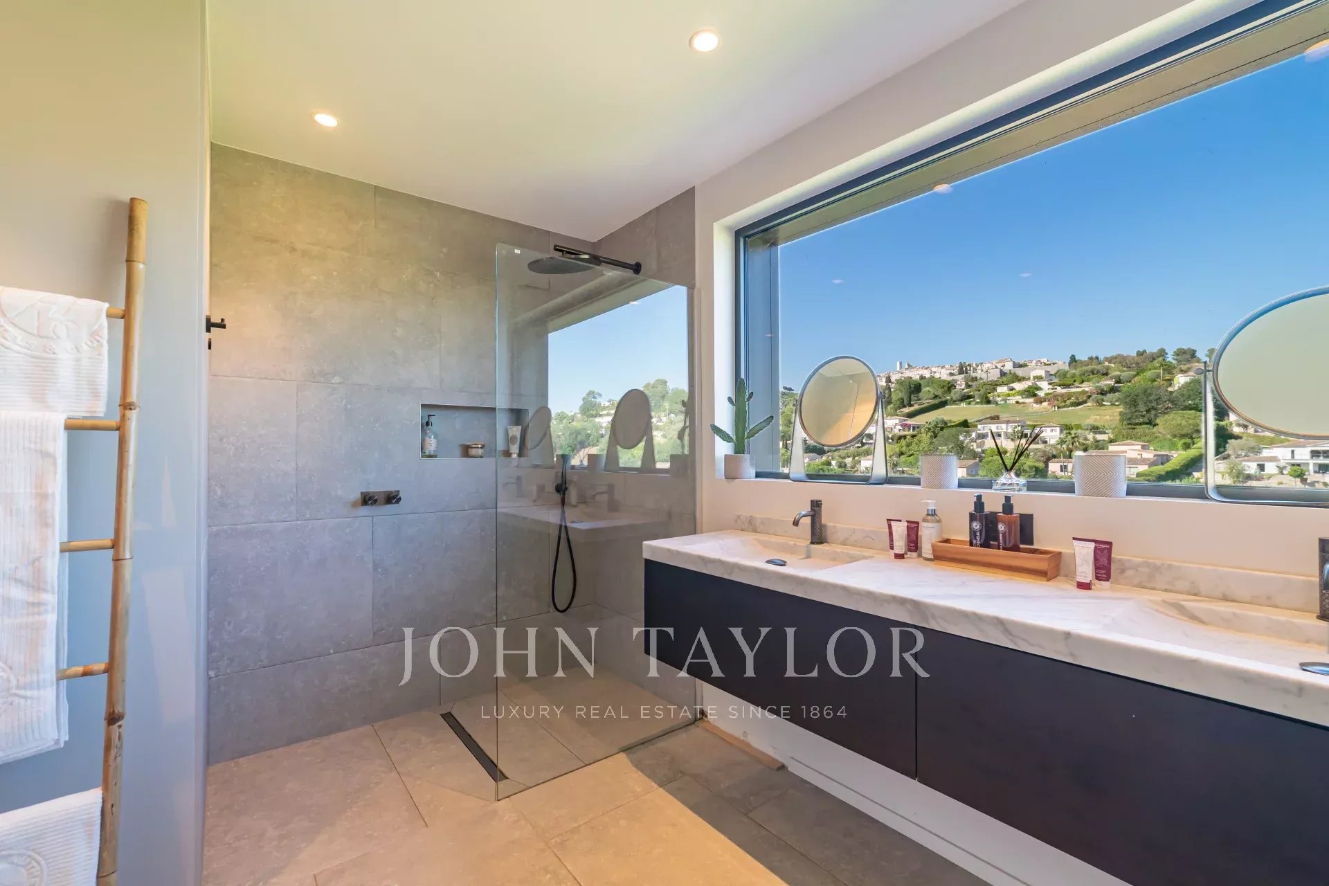 On the first floor, a spacious, light-filled living area with lounge, dining room and open kitchen invites you to relax and socialize. The view of Saint-Paul de Vence on one side and the pleasant terrace with swimming pool surrounded by a tropical garden on the other provide an idyllic setting. The master suite includes a study with a view, a dressing room, a bathroom with shower and bath, and direct access to one of the terraces.