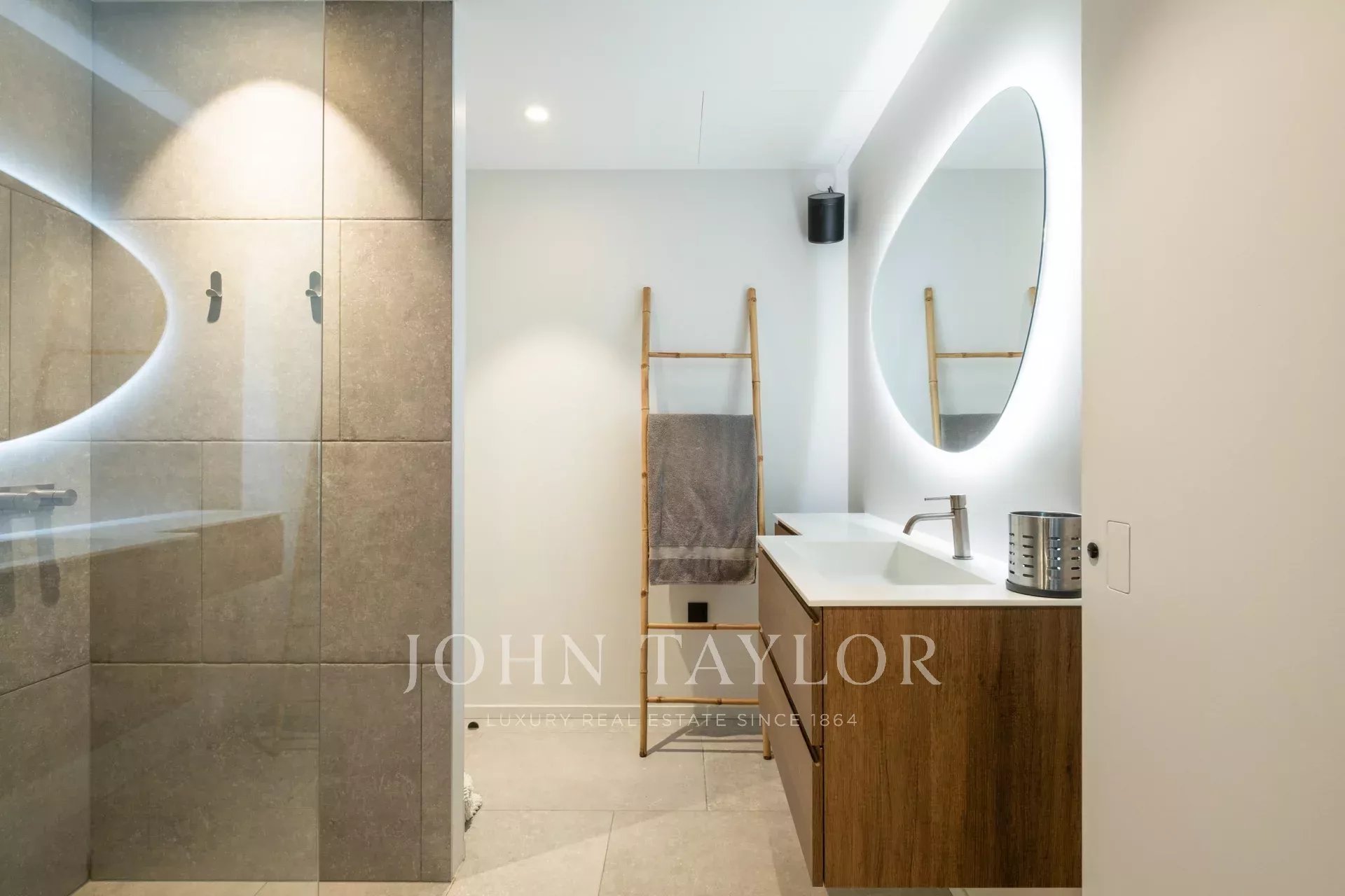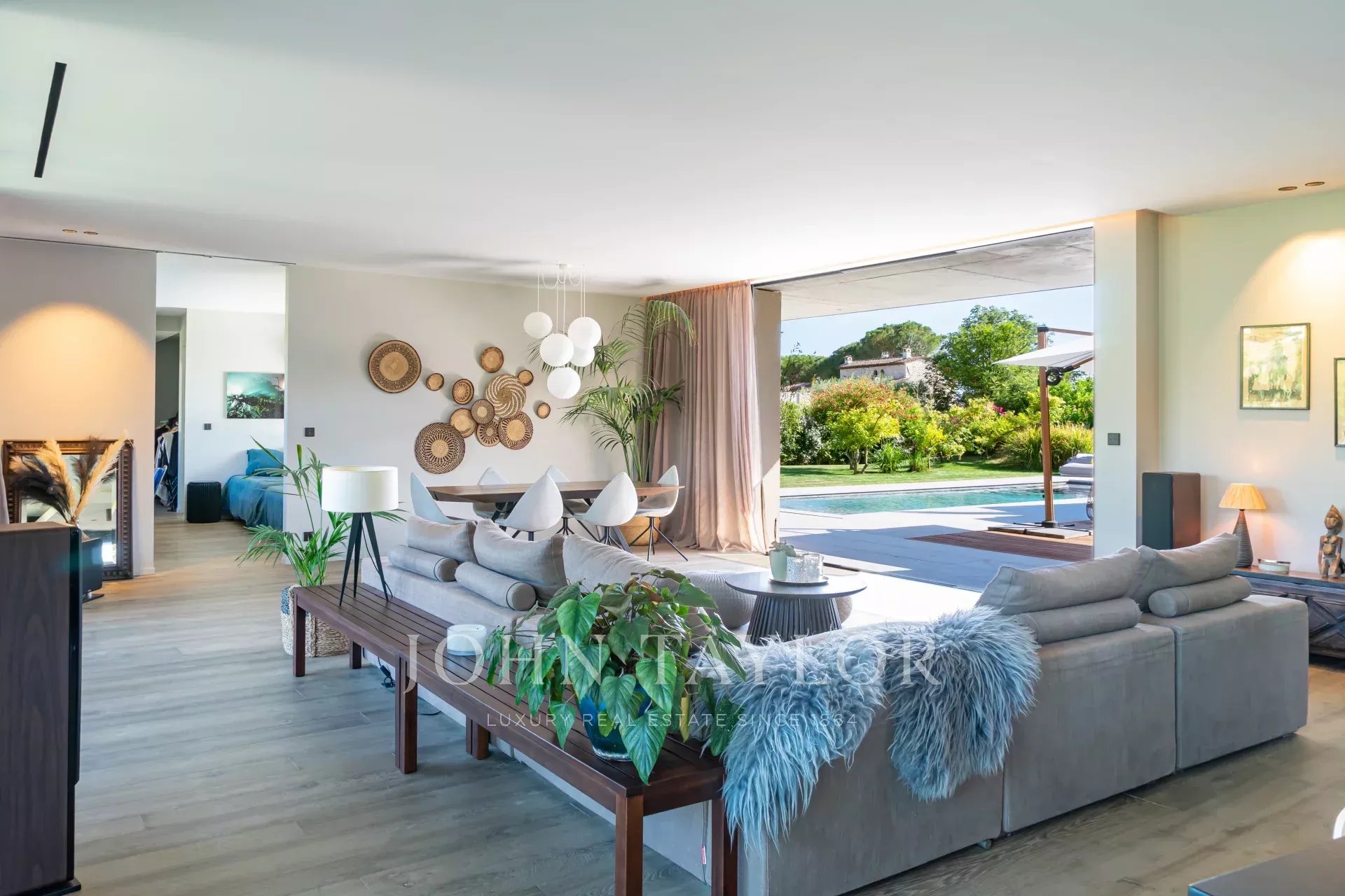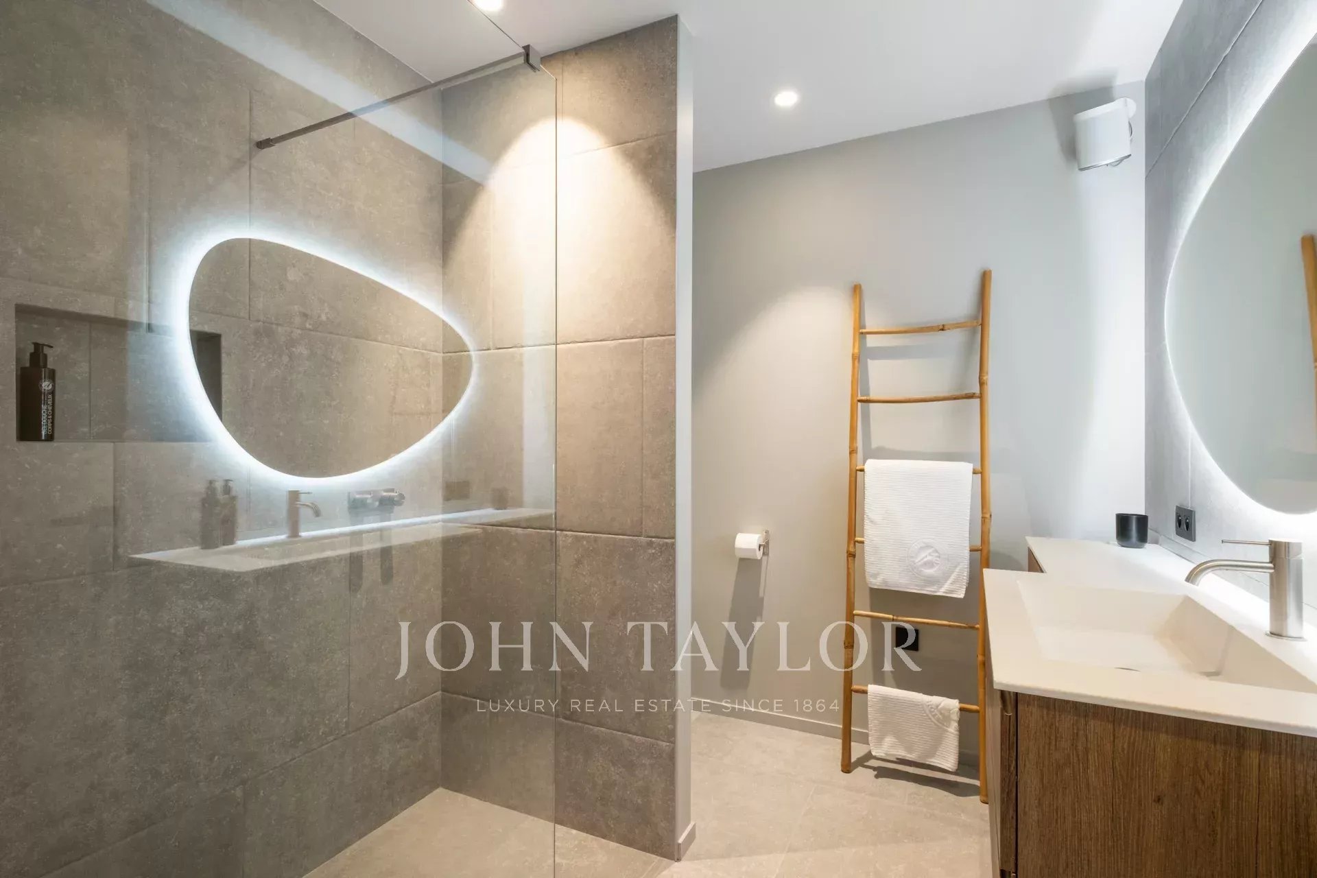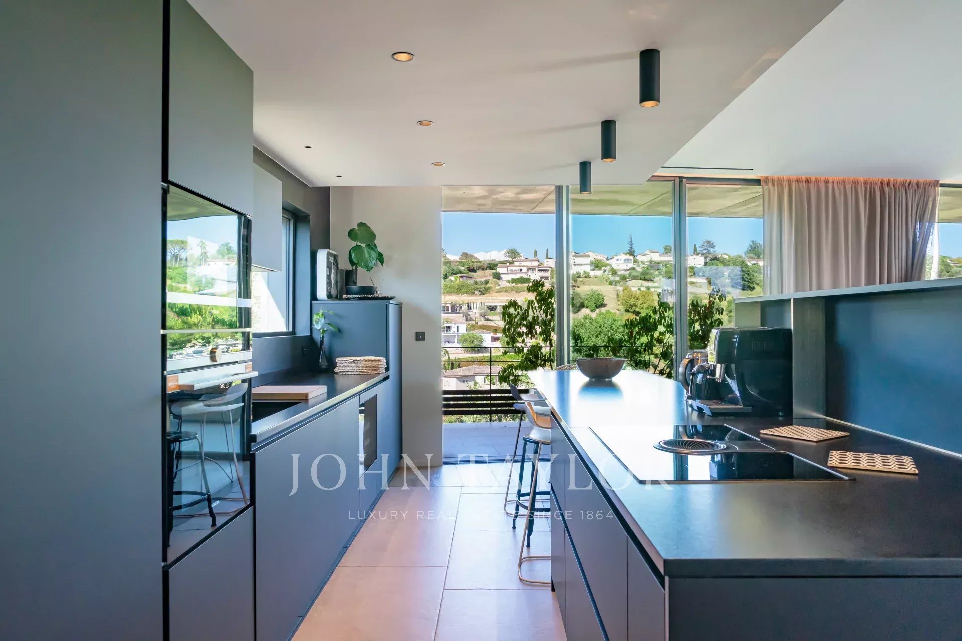 On the first floor, a spacious, light-filled living area with lounge, dining room and open kitchen invites you to relax and socialize. The view of Saint-Paul de Vence on one side and the pleasant terrace with swimming pool surrounded by a tropical garden on the other provide an idyllic setting. The master suite includes a study with a view, a dressing room, a bathroom with shower and bath, and direct access to one of the terraces.