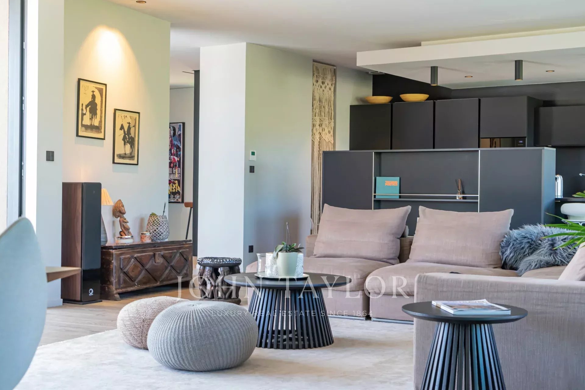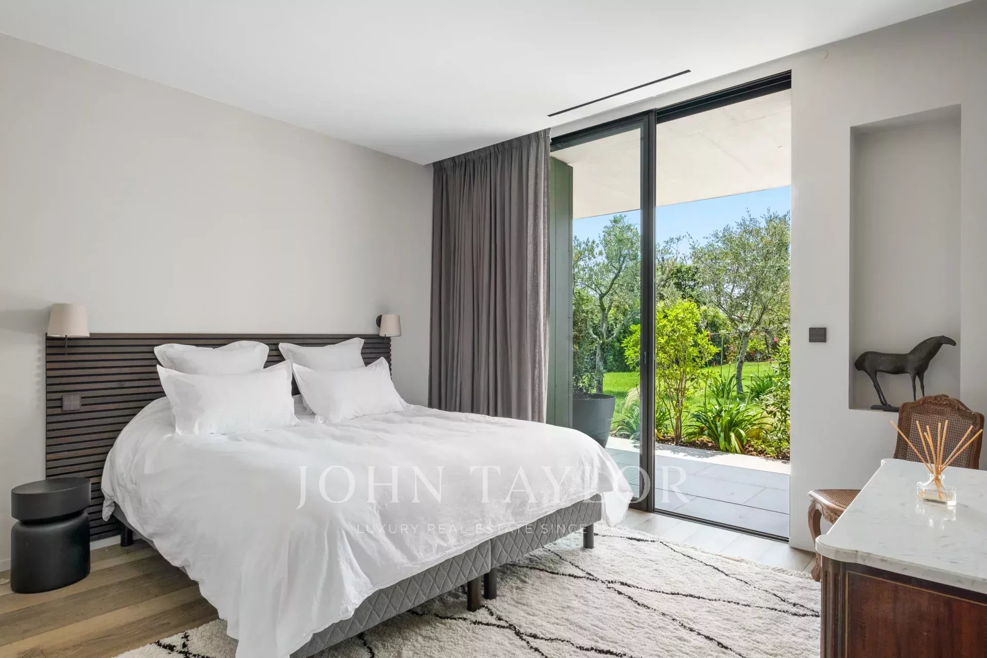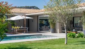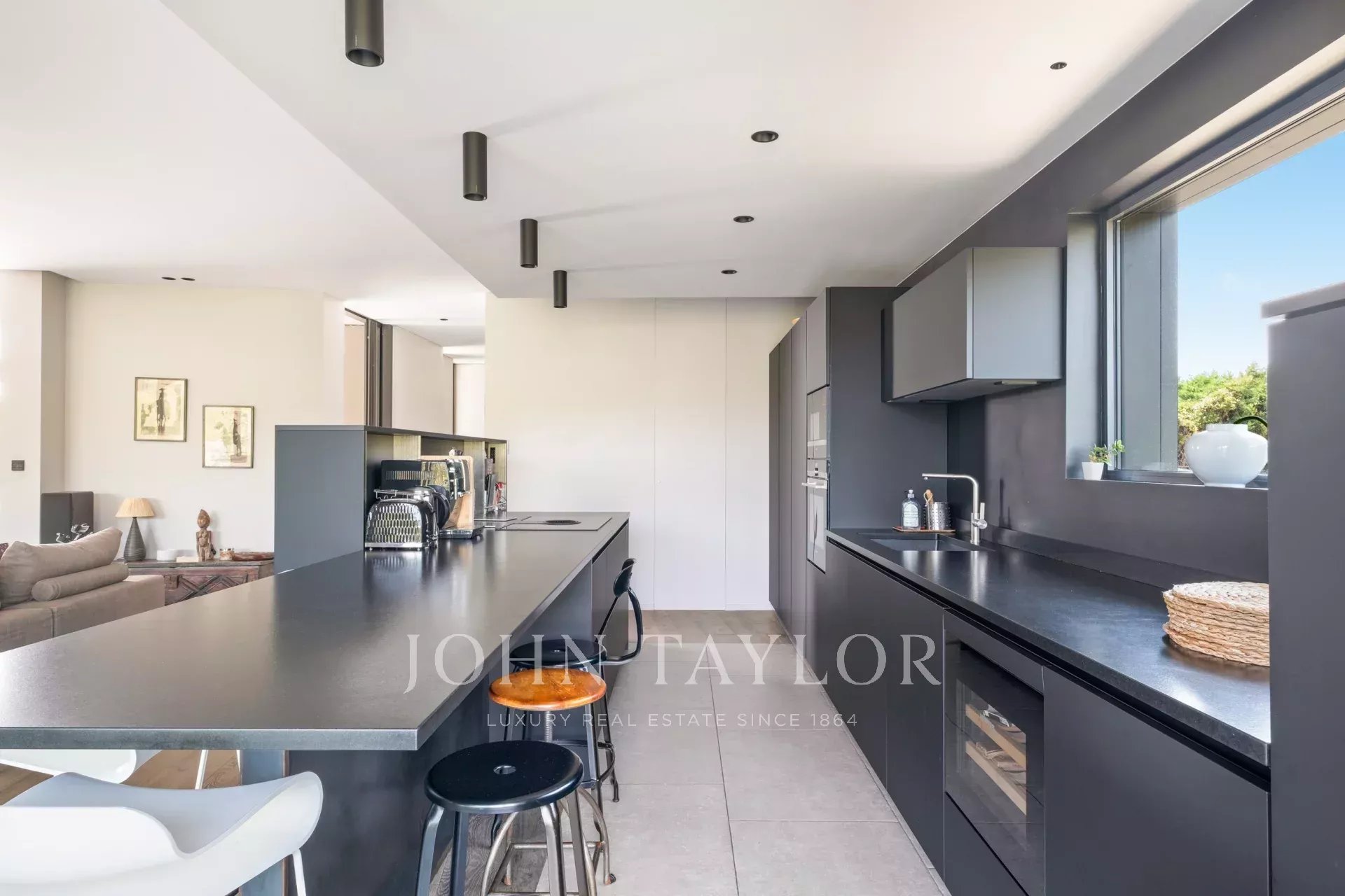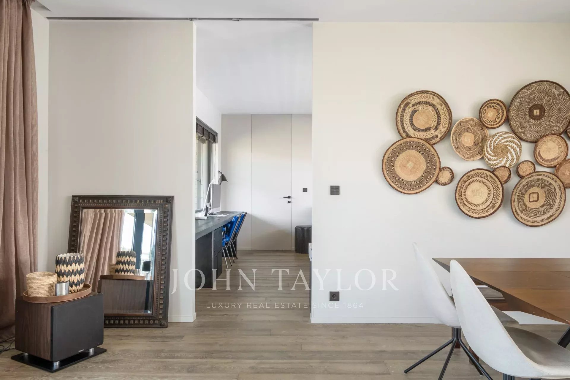 On the first floor, a spacious, light-filled living area with lounge, dining room and open kitchen invites you to relax and socialize. The view of Saint-Paul de Vence on one side and the pleasant terrace with swimming pool surrounded by a tropical garden on the other provide an idyllic setting. The master suite includes a study with a view, a dressing room, a bathroom with shower and bath, and direct access to one of the terraces.