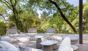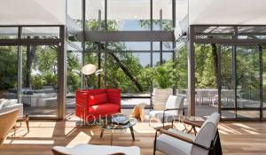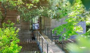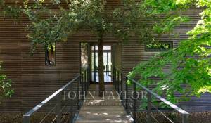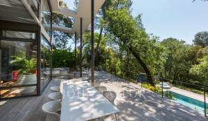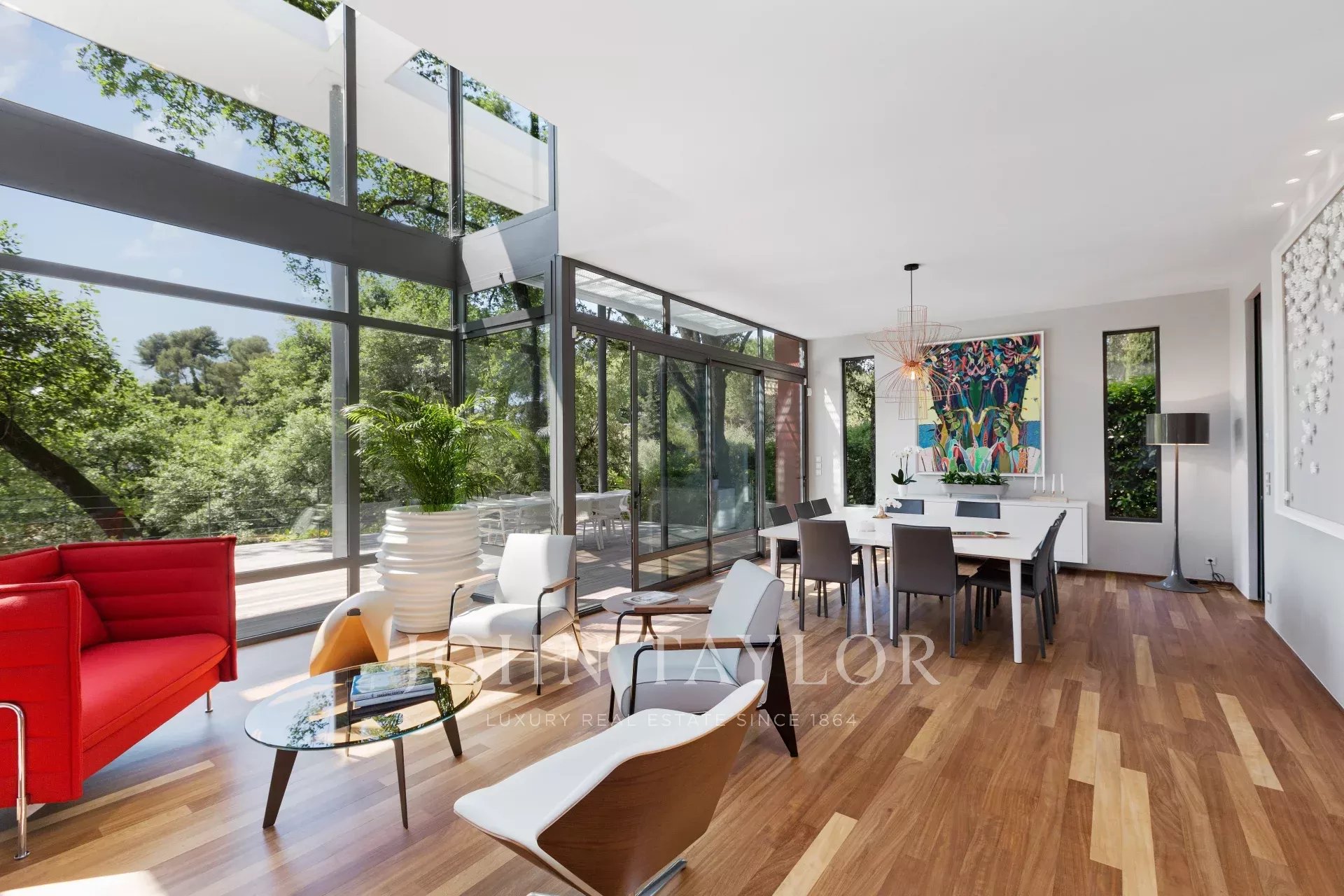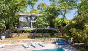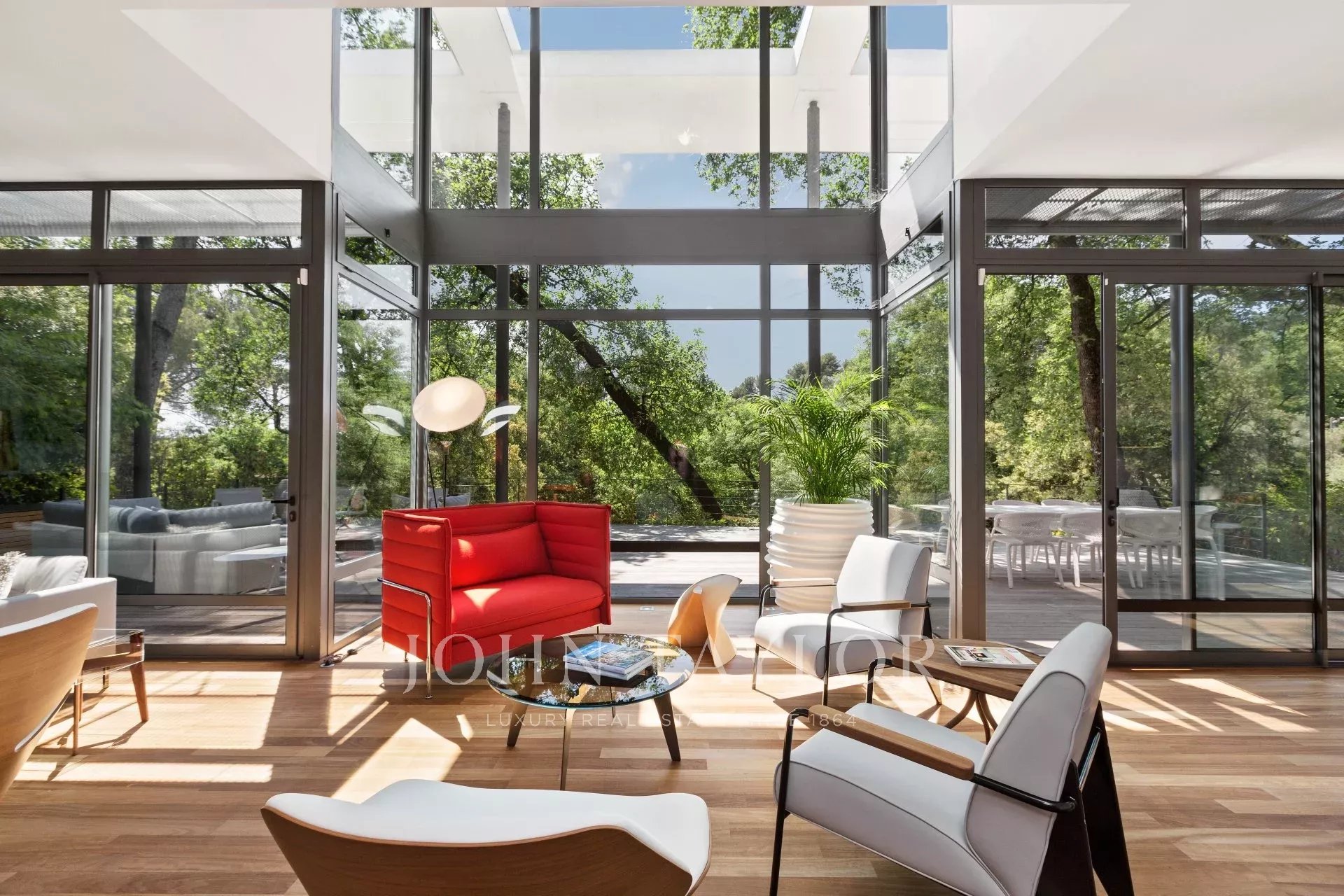 Modern 350 m² property nestled in wooded grounds with magnificent oak and pine trees, just a few meters from the Fondation Maeght. Designed in 2002 by Italian architect Antonino Cascio, this villa is a benchmark of modern architecture, particularly for its innovative bio-climatic features.