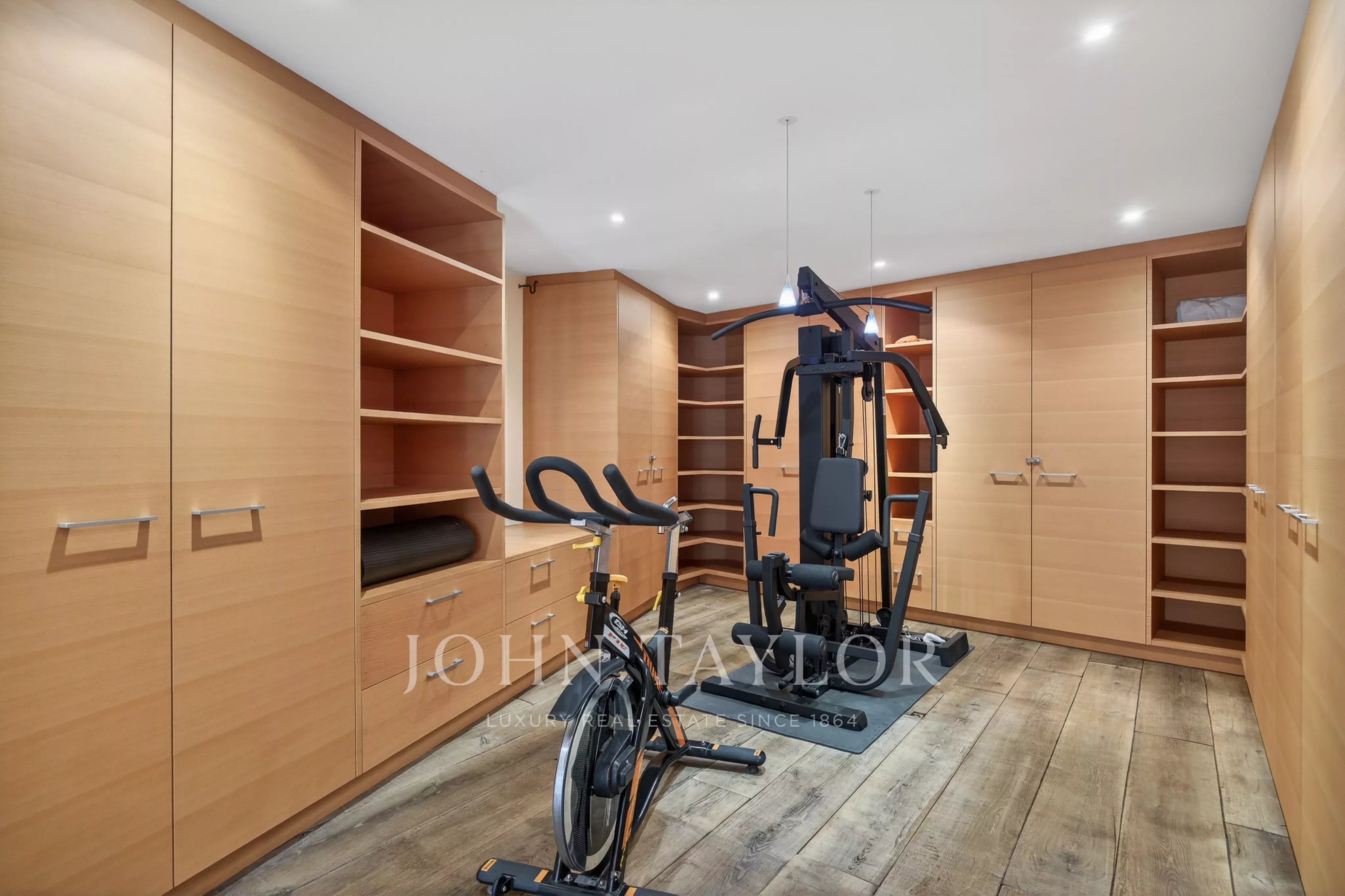 The main property consists of a large living room open to the dining room with large bay windows offering an unobstructed view, a fully equipped open kitchen that can be closed, and a gym.