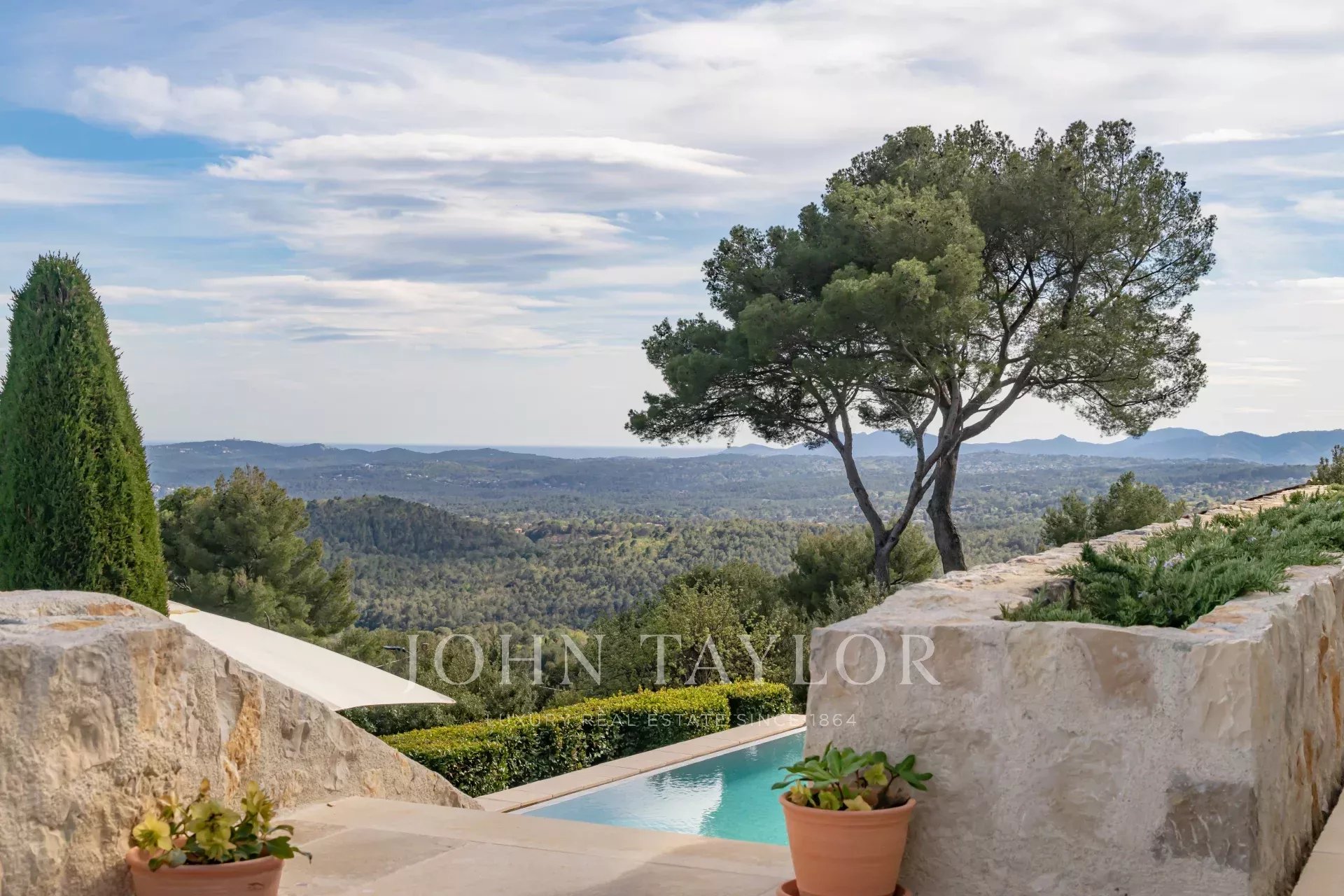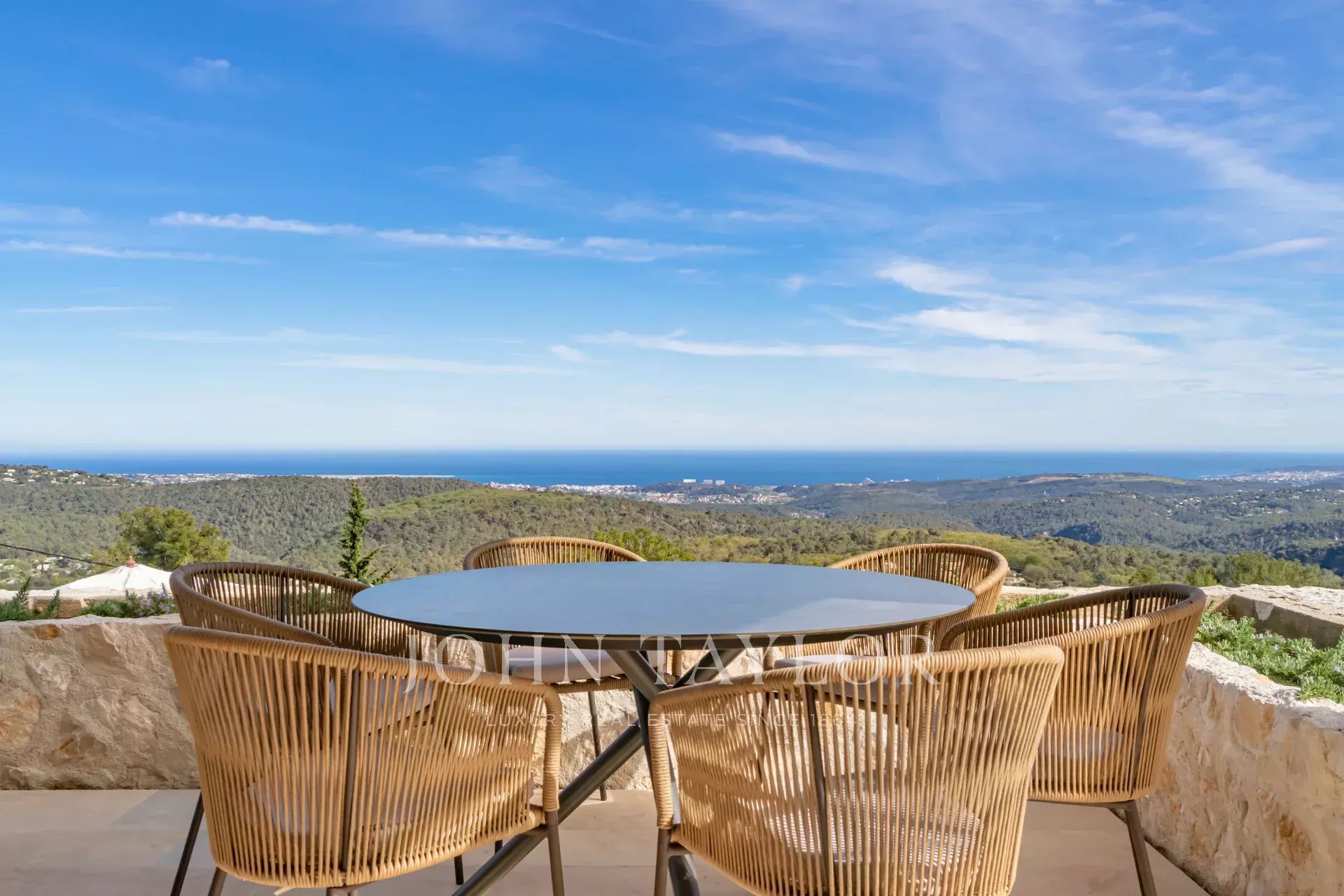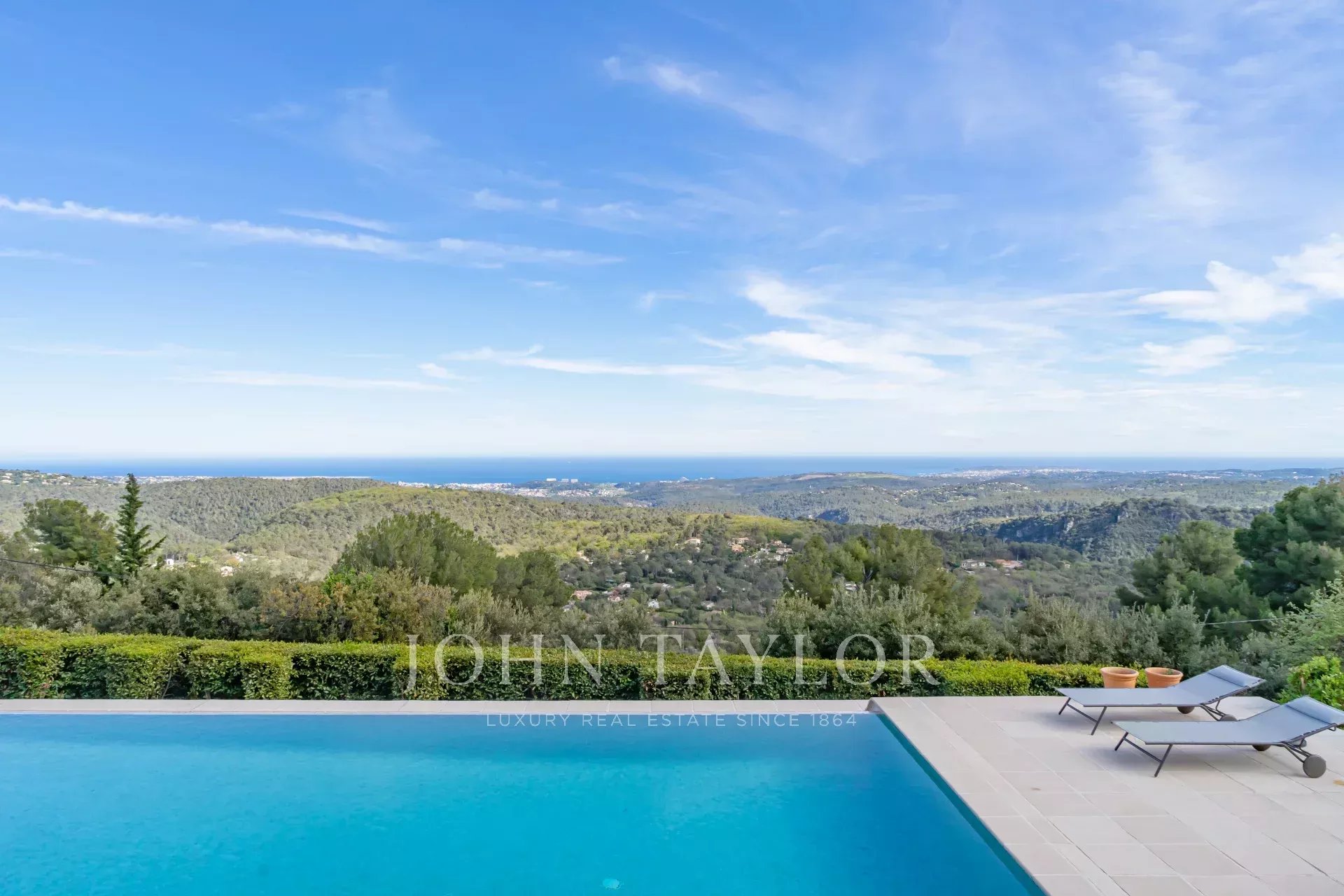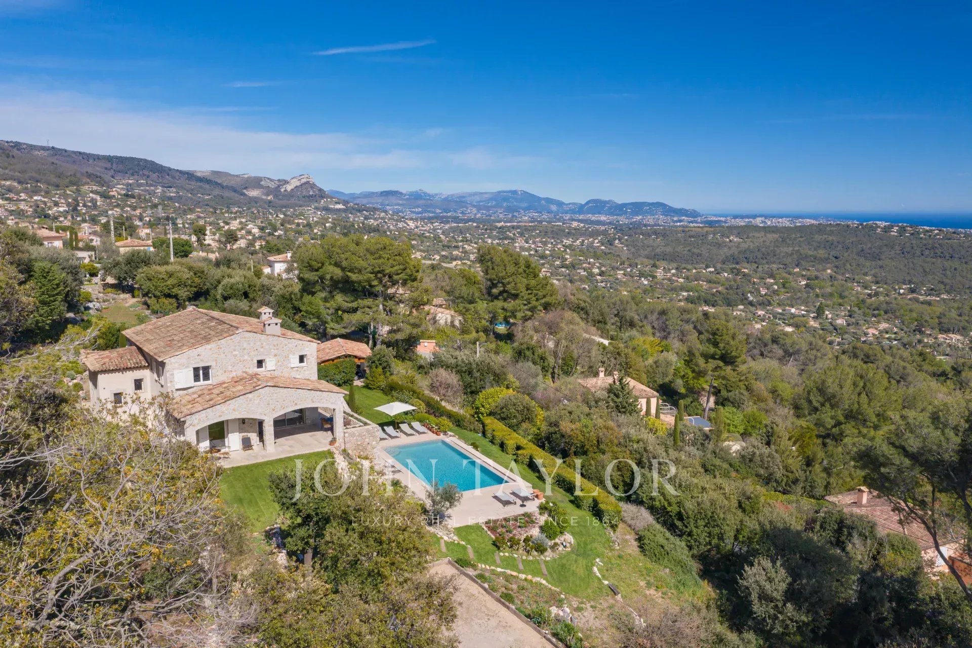 In Tourrettes sur Loup, with magnificent views of the sea and surrounding countryside, beautiful recently-built property offering 320 m² of living space on 4,000 m² of land with infinity pool.