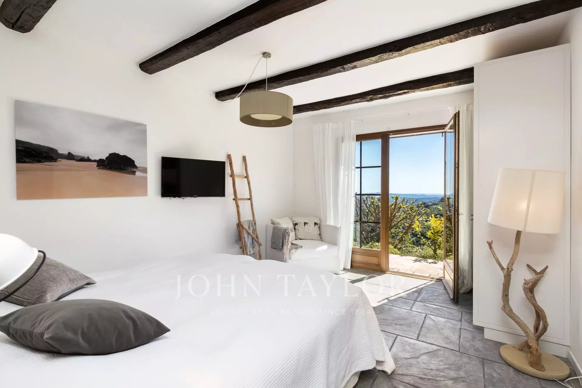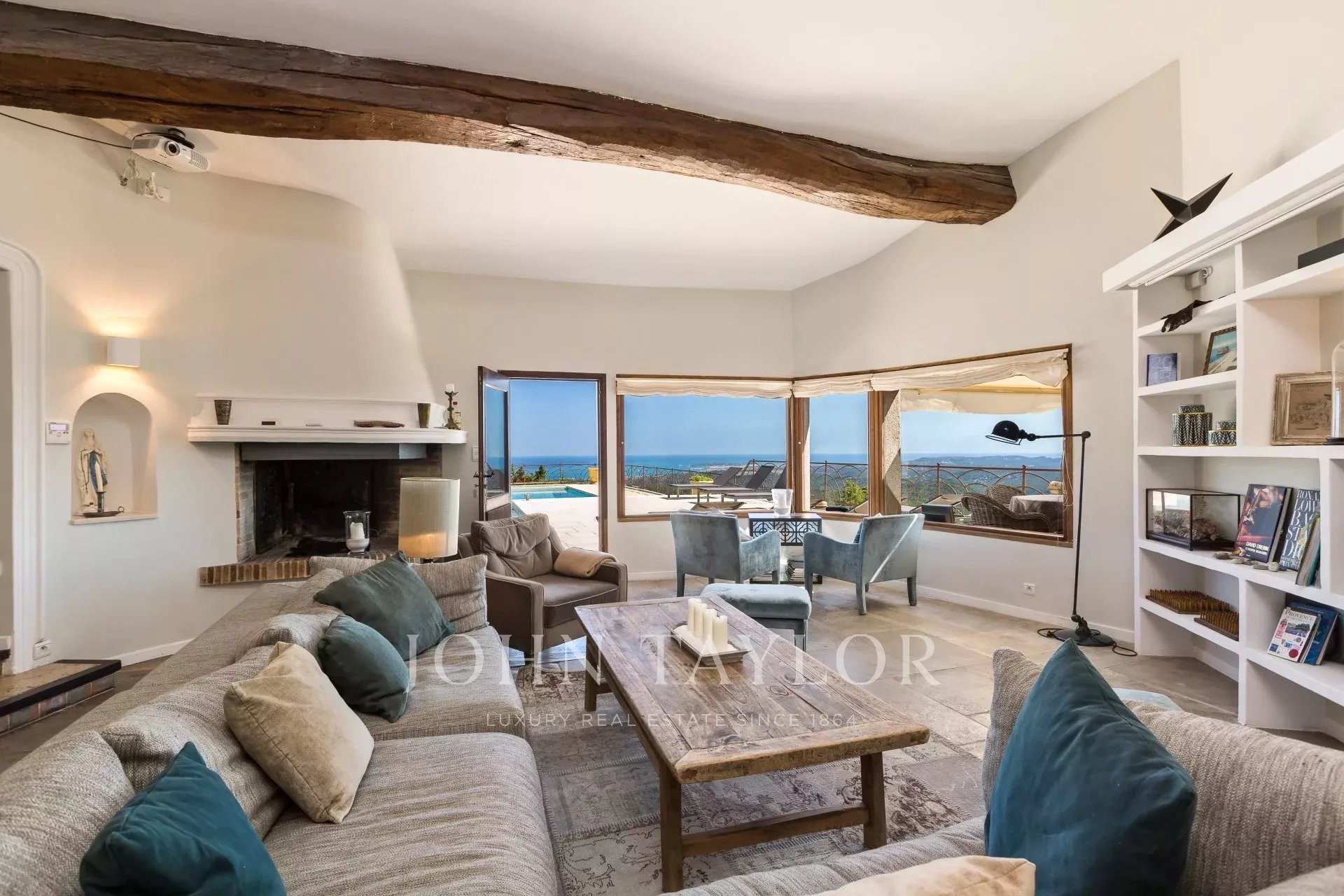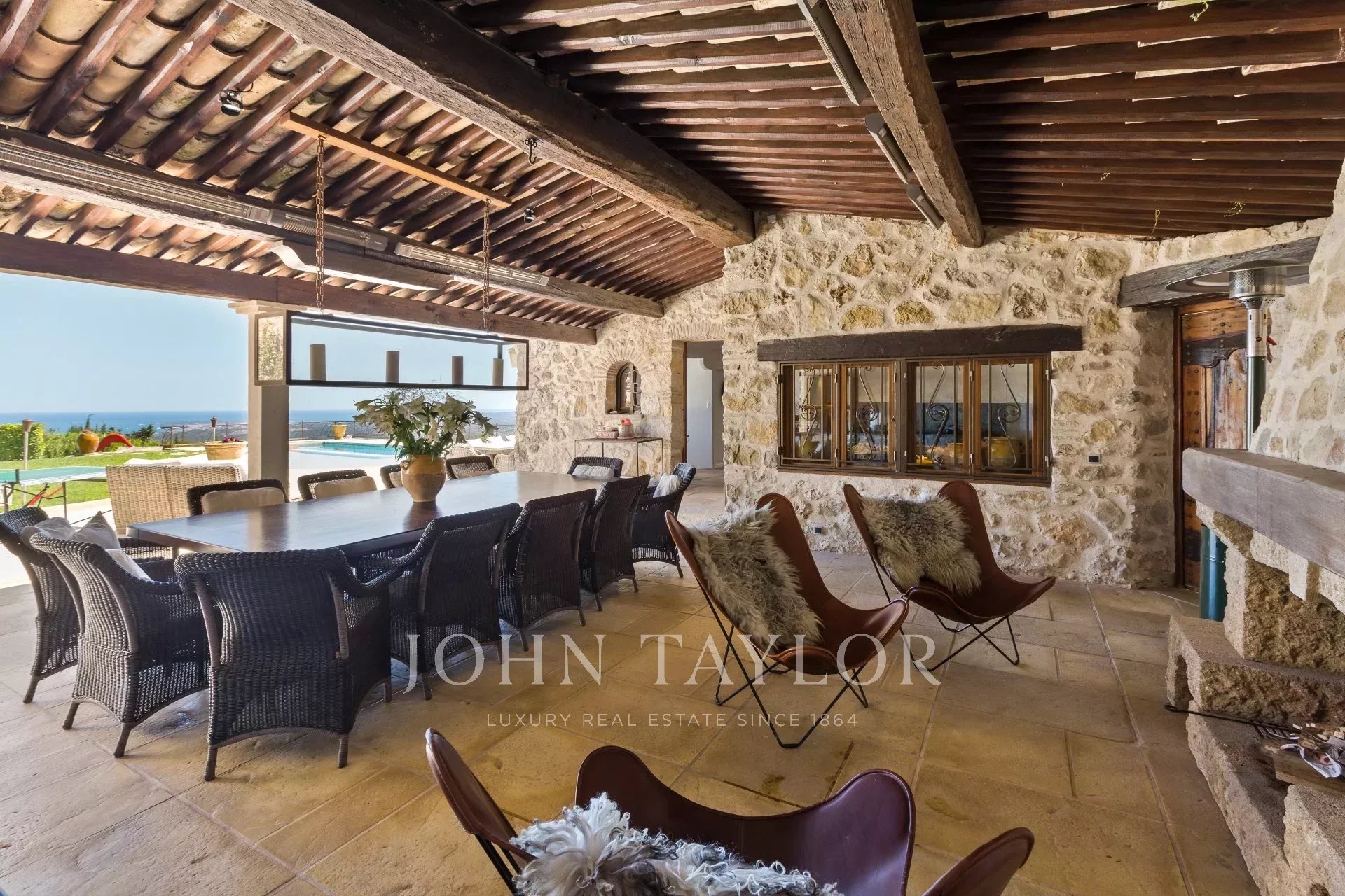 Outside, the stone pool house with its pizza oven, fireplace and large solid wood table opens onto the infinity pool and its enchanting sea view, which can be admired while swimming. Nearby, there's a splendid Moroccan salon for relaxing and a gym.