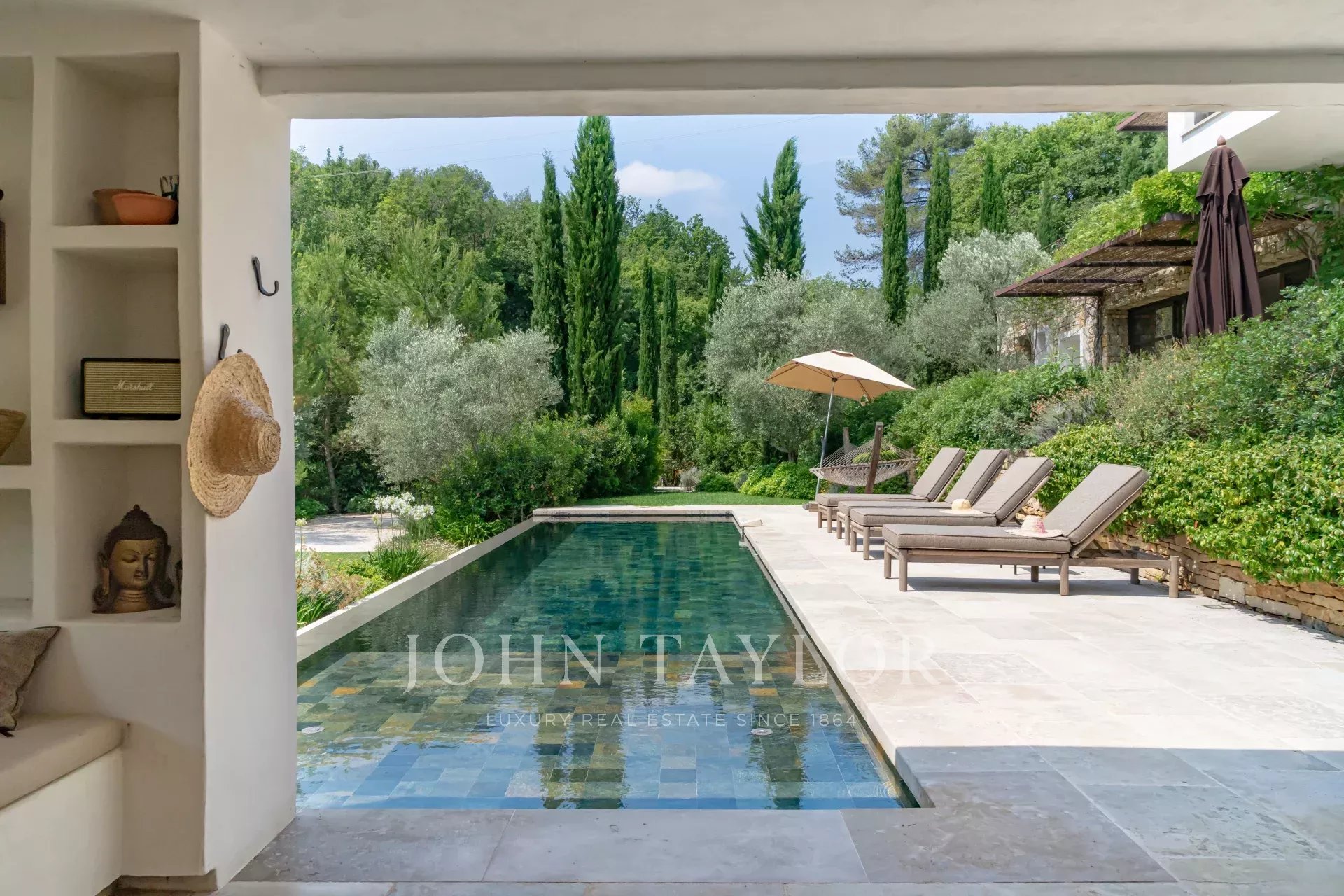 The flat, landscaped garden is ideal for enjoying the Mediterranean lifestyle, featuring a swimming pool with pool house, a hammock, and a trampoline.