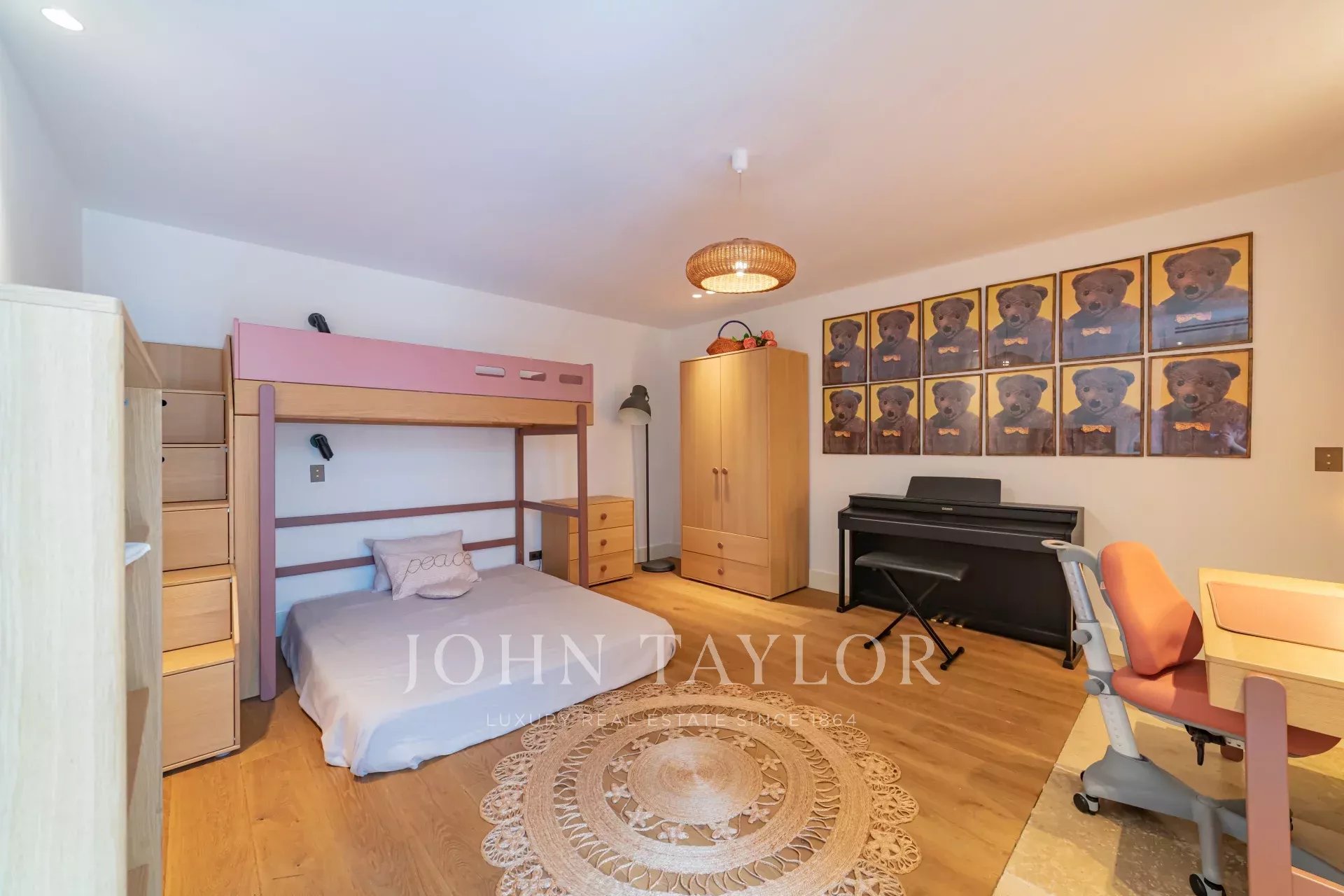The entrance opens onto a spacious master suite featuring a king-size bed, a dedicated study area, a large walk-in dressing room, and an en-suite bathroom. The bedroom enjoys direct access to a private terrace, ideal for quiet mornings or evening relaxation.