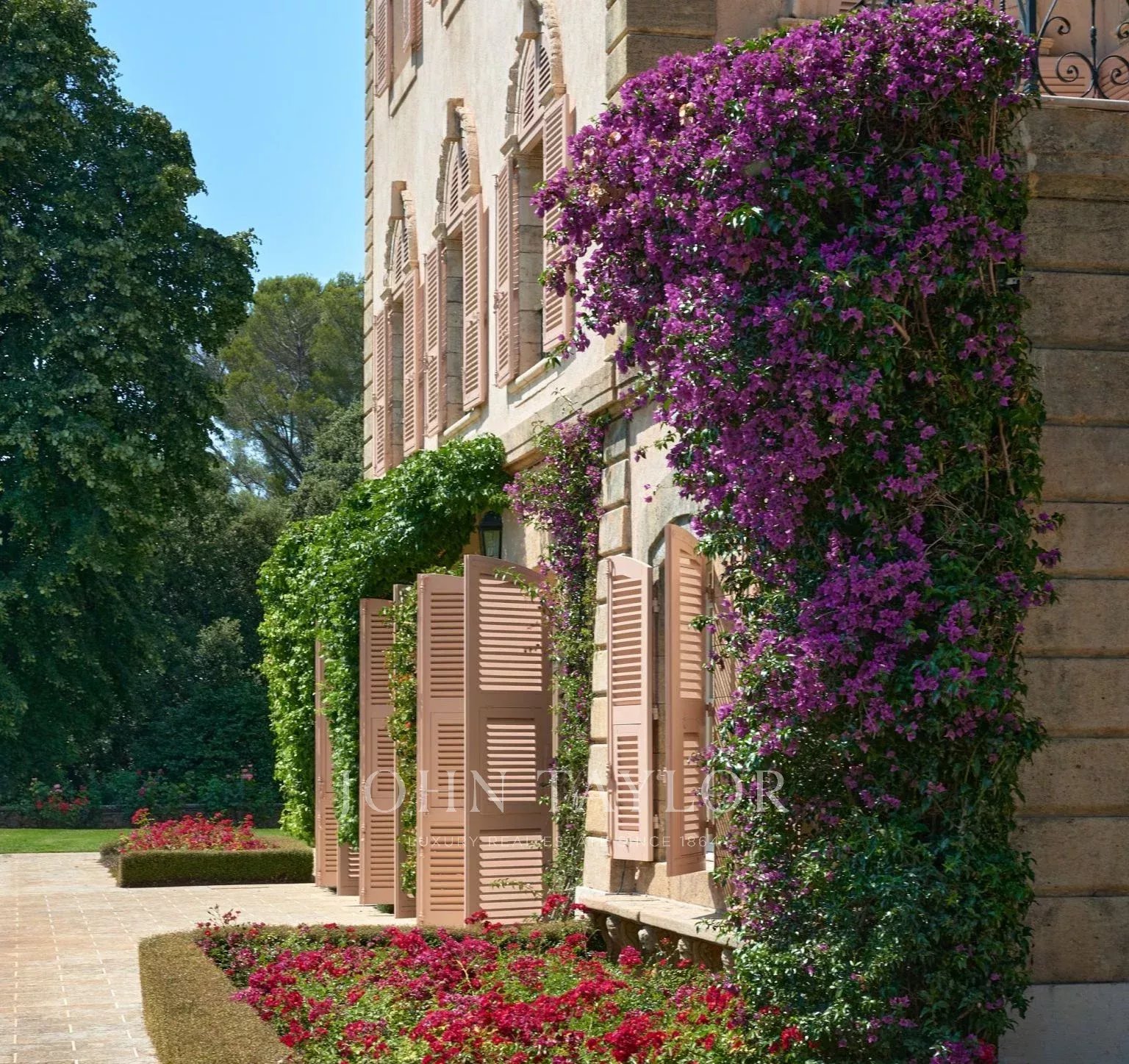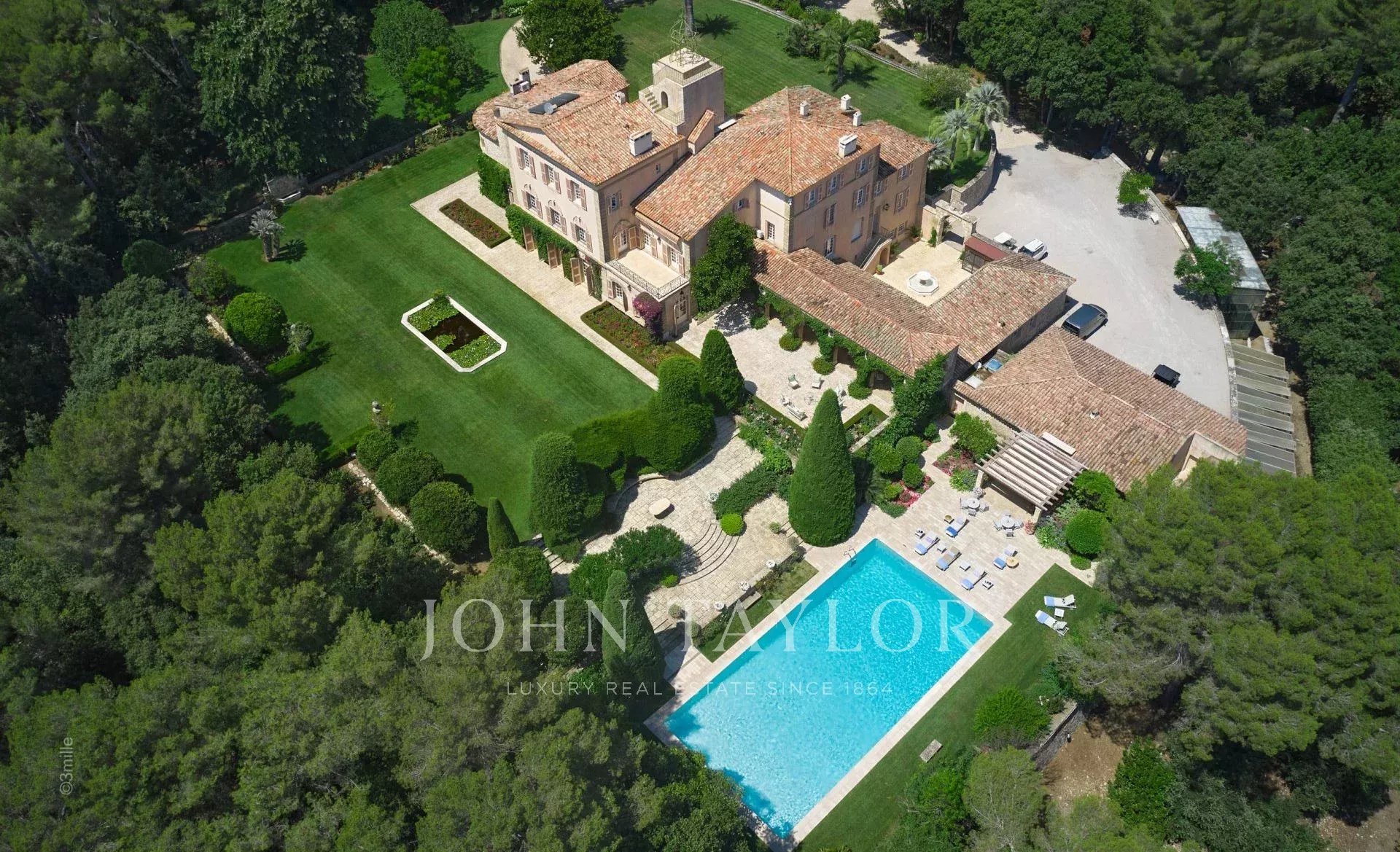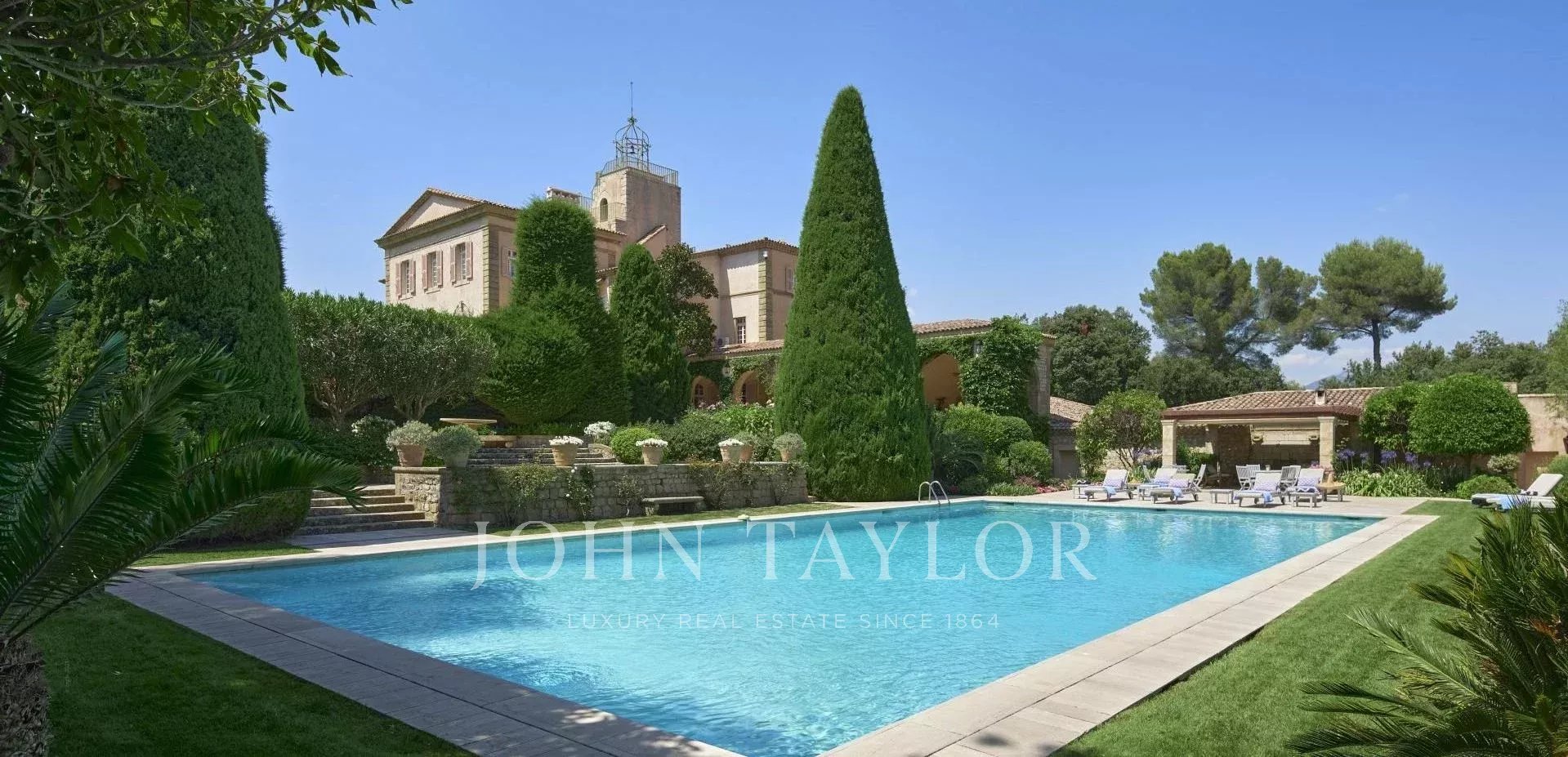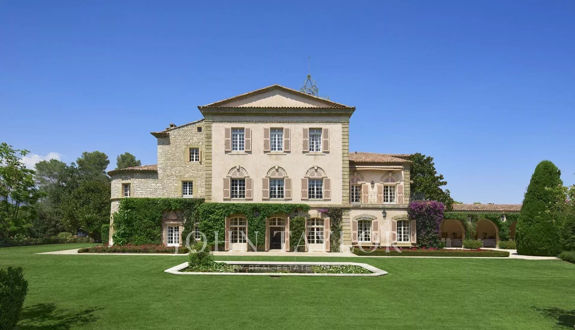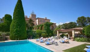 Atop its private hill, with uninterrupted views all the way to the sea, this sumptuous Chateau, built of ashlar in 1920, was the setting for JFK's childhood vacations; JFK's summer vacations as a child, when his father, Joseph Kennedy, served as British Ambassador to London between 1938 and 1940. Ideally situated between the villages of Valbonne and Mougins, 20 minutes from Cannes and its beaches. The property is surrounded by eighteen hectares of parkland.