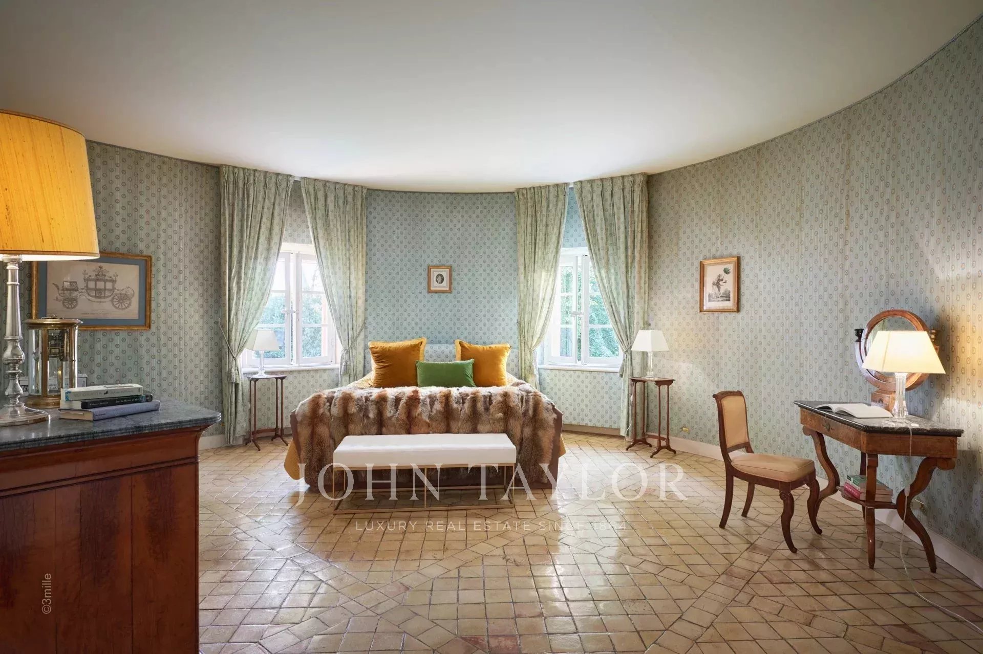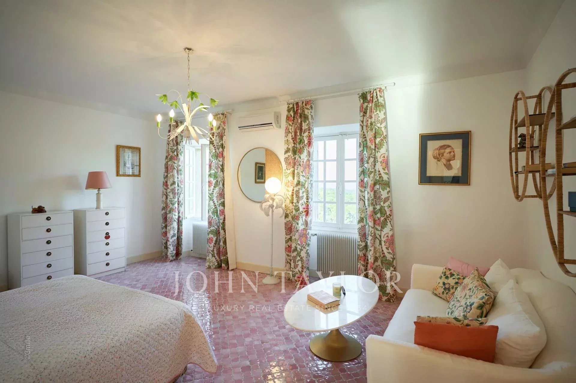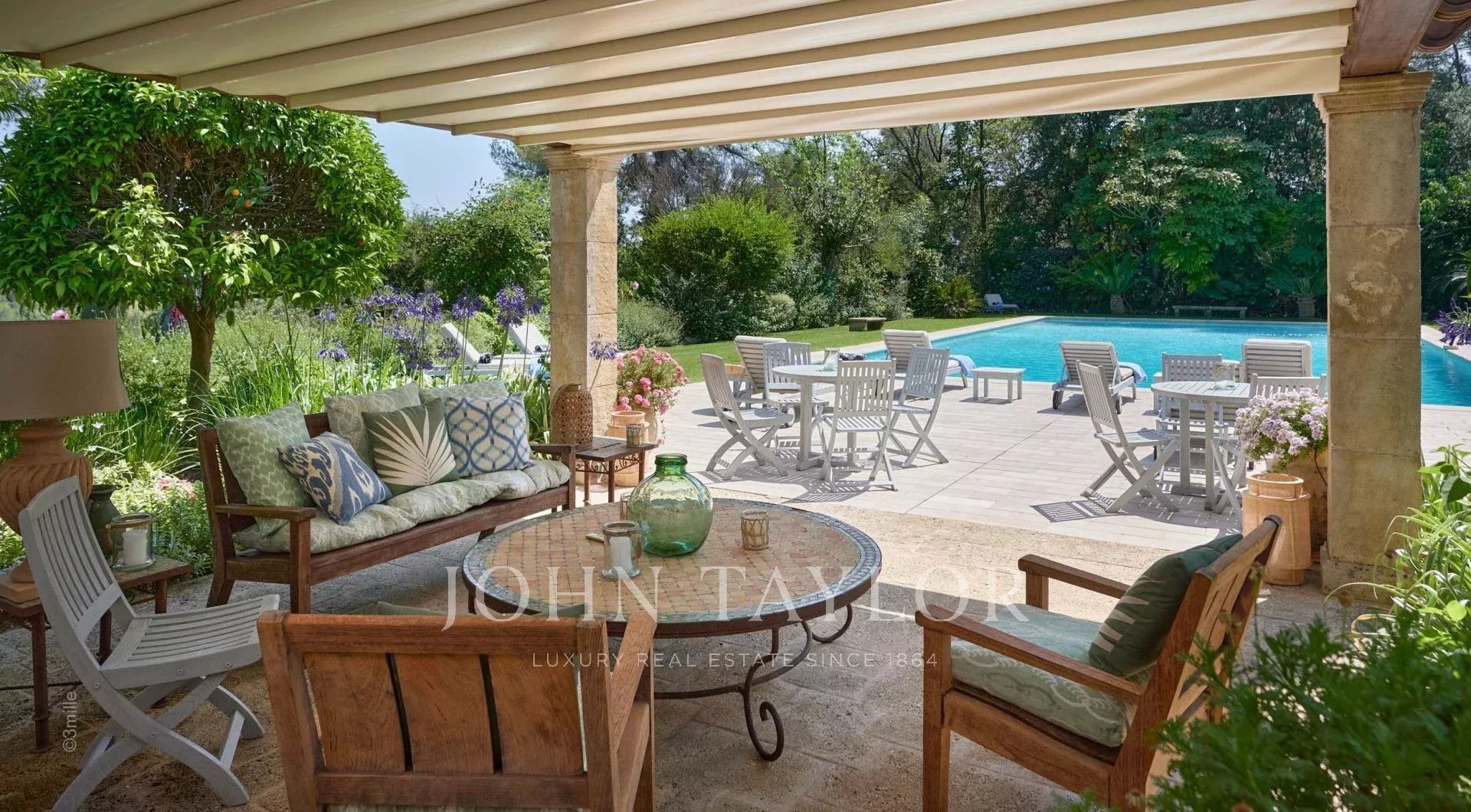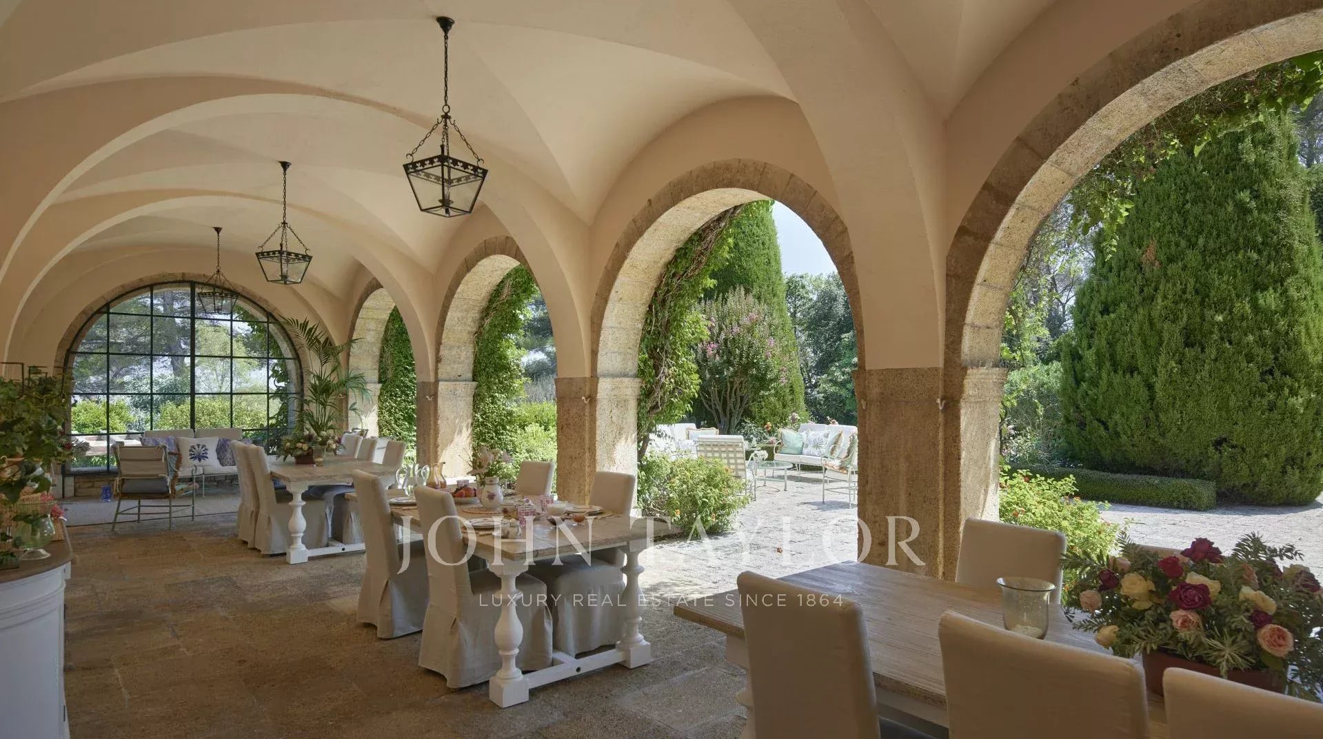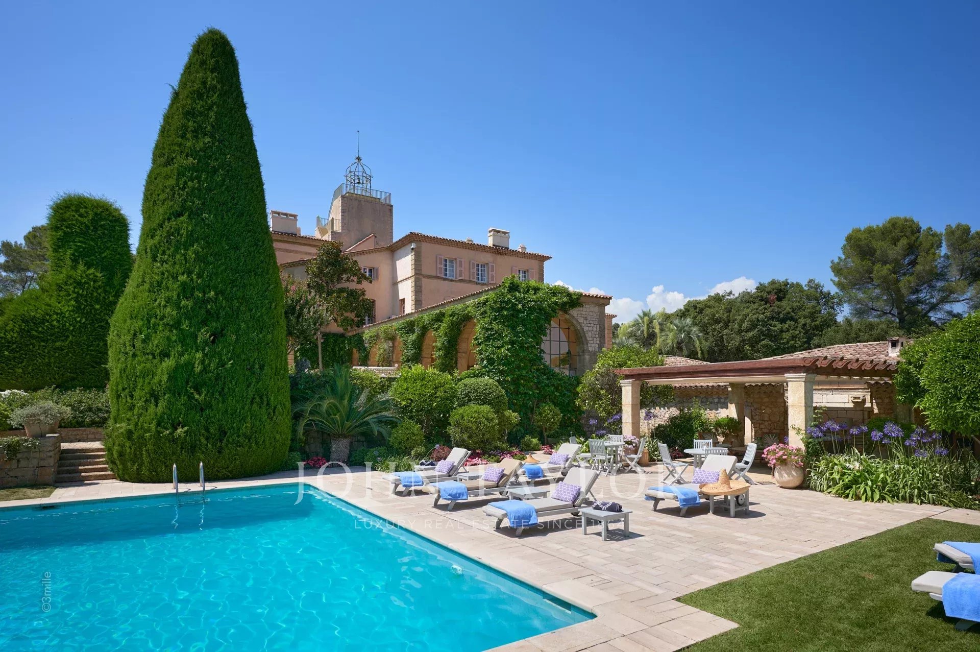Atop its private hill, with uninterrupted views all the way to the sea, this sumptuous Chateau, built of ashlar in 1920, was the setting for JFK's childhood vacations; JFK's summer vacations as a child, when his father, Joseph Kennedy, served as British Ambassador to London between 1938 and 1940. Ideally situated between the villages of Valbonne and Mougins, 20 minutes from Cannes and its beaches. The property is surrounded by eighteen hectares of parkland.