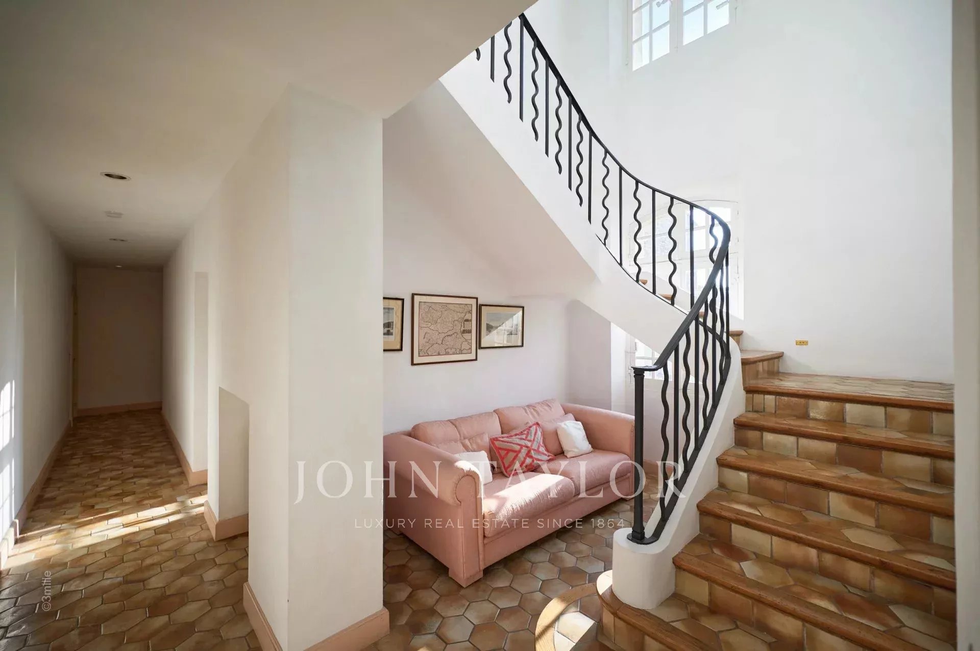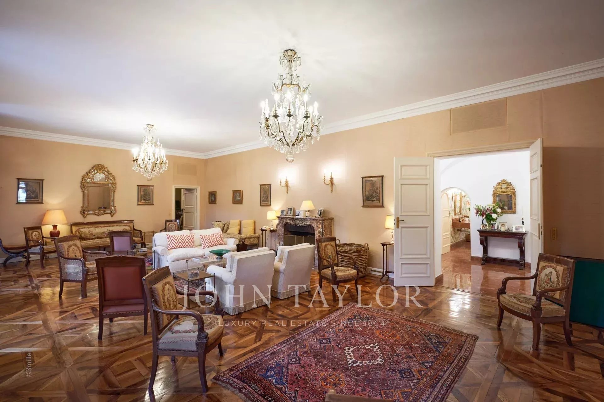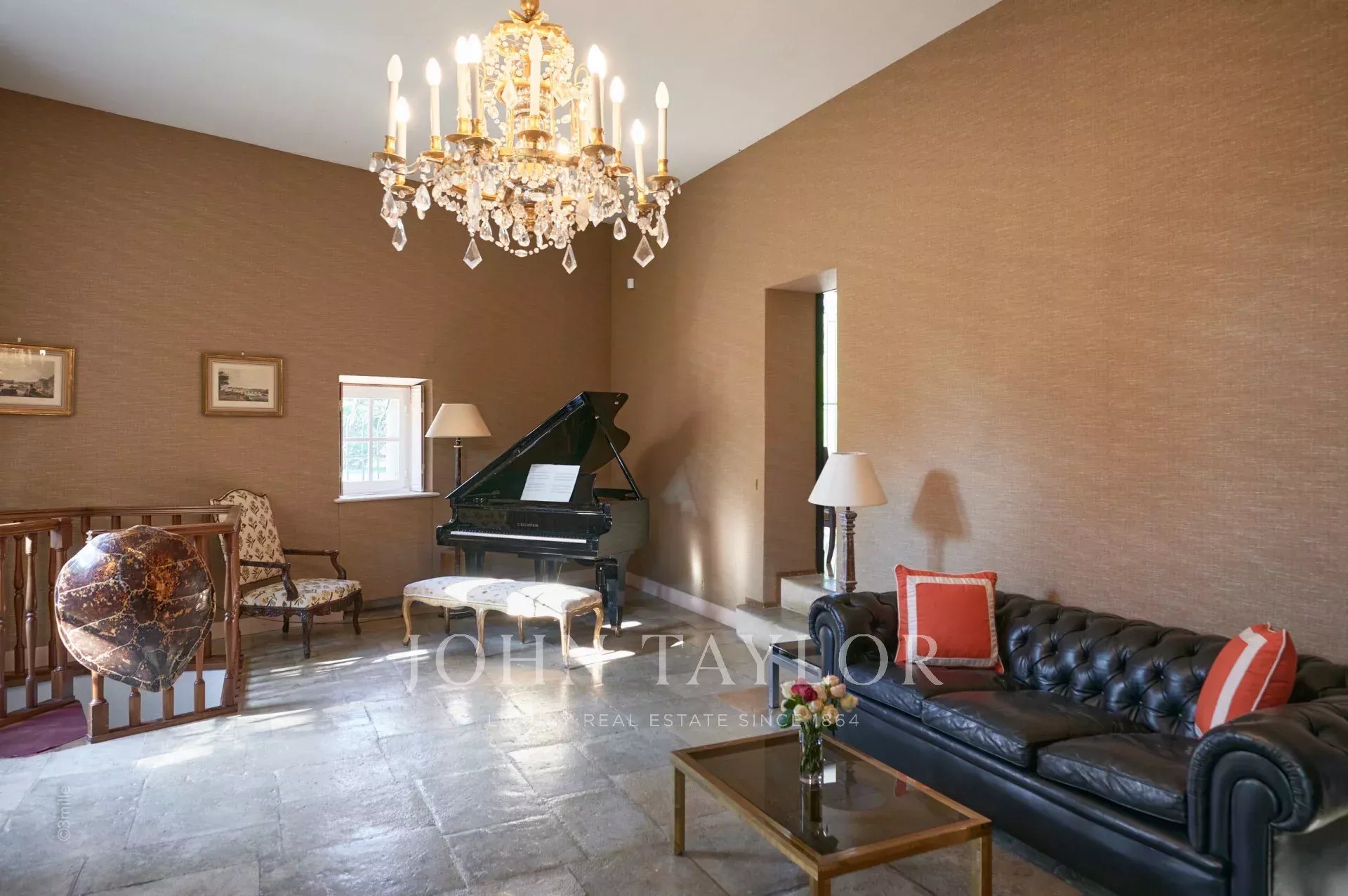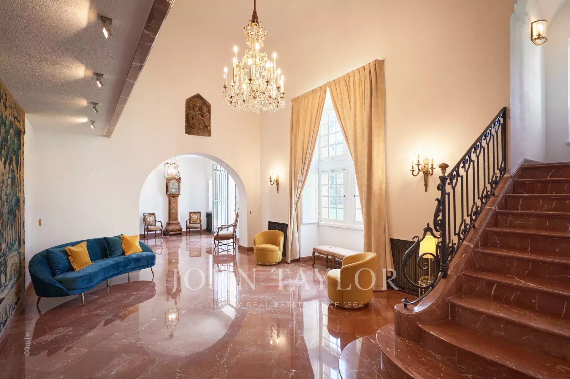 Atop its private hill, with uninterrupted views all the way to the sea, this sumptuous Chateau, built of ashlar in 1920, was the setting for JFK's childhood vacations; JFK's summer vacations as a child, when his father, Joseph Kennedy, served as British Ambassador to London between 1938 and 1940. Ideally situated between the villages of Valbonne and Mougins, 20 minutes from Cannes and its beaches. The property is surrounded by eighteen hectares of parkland.