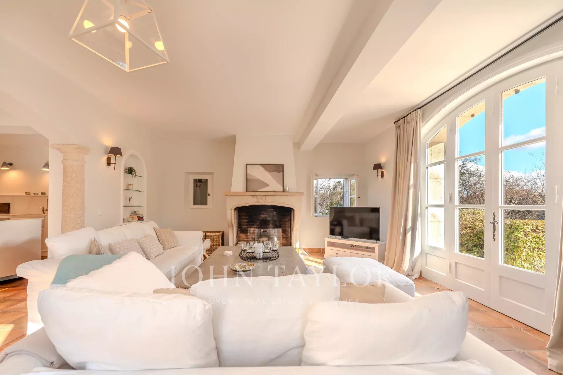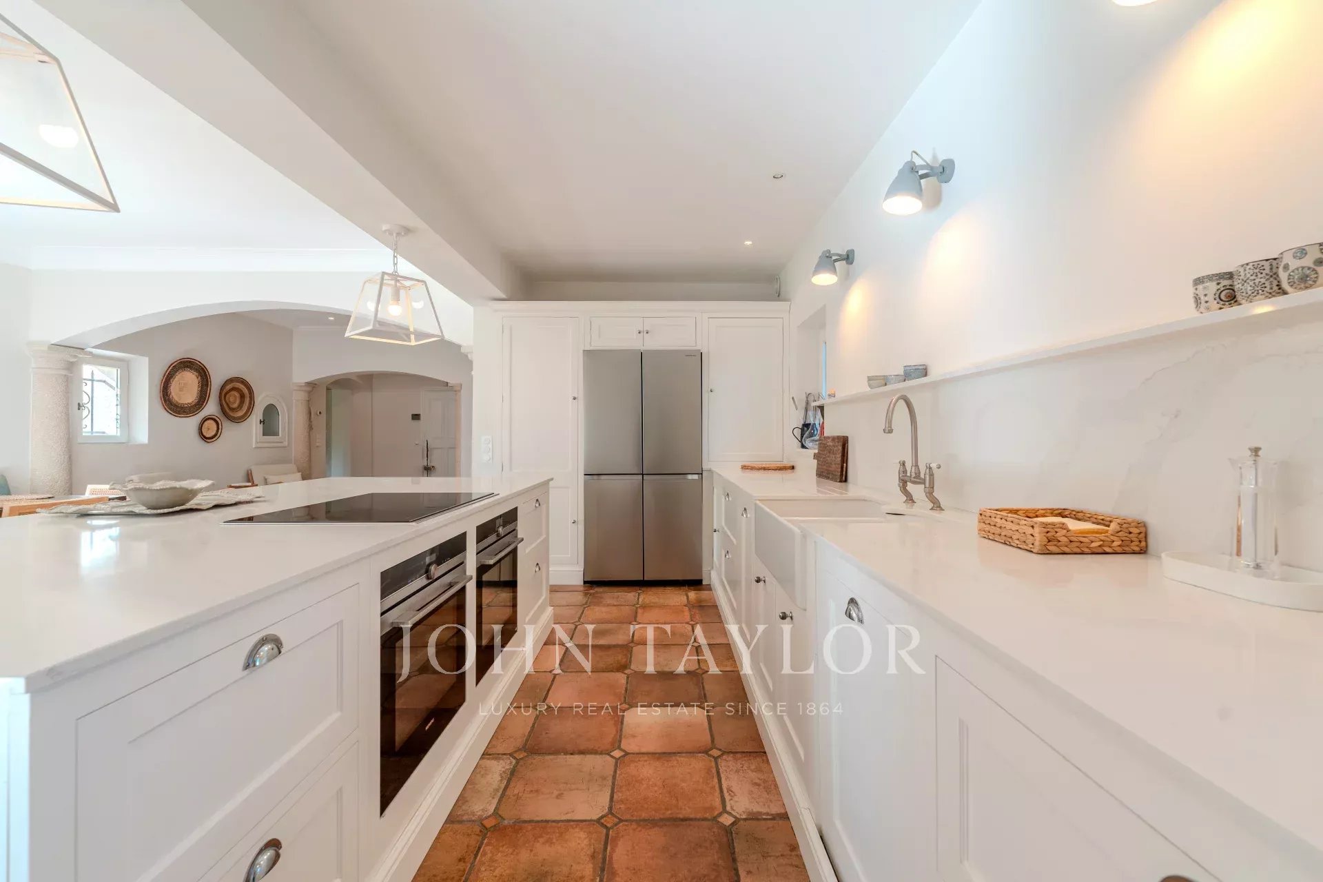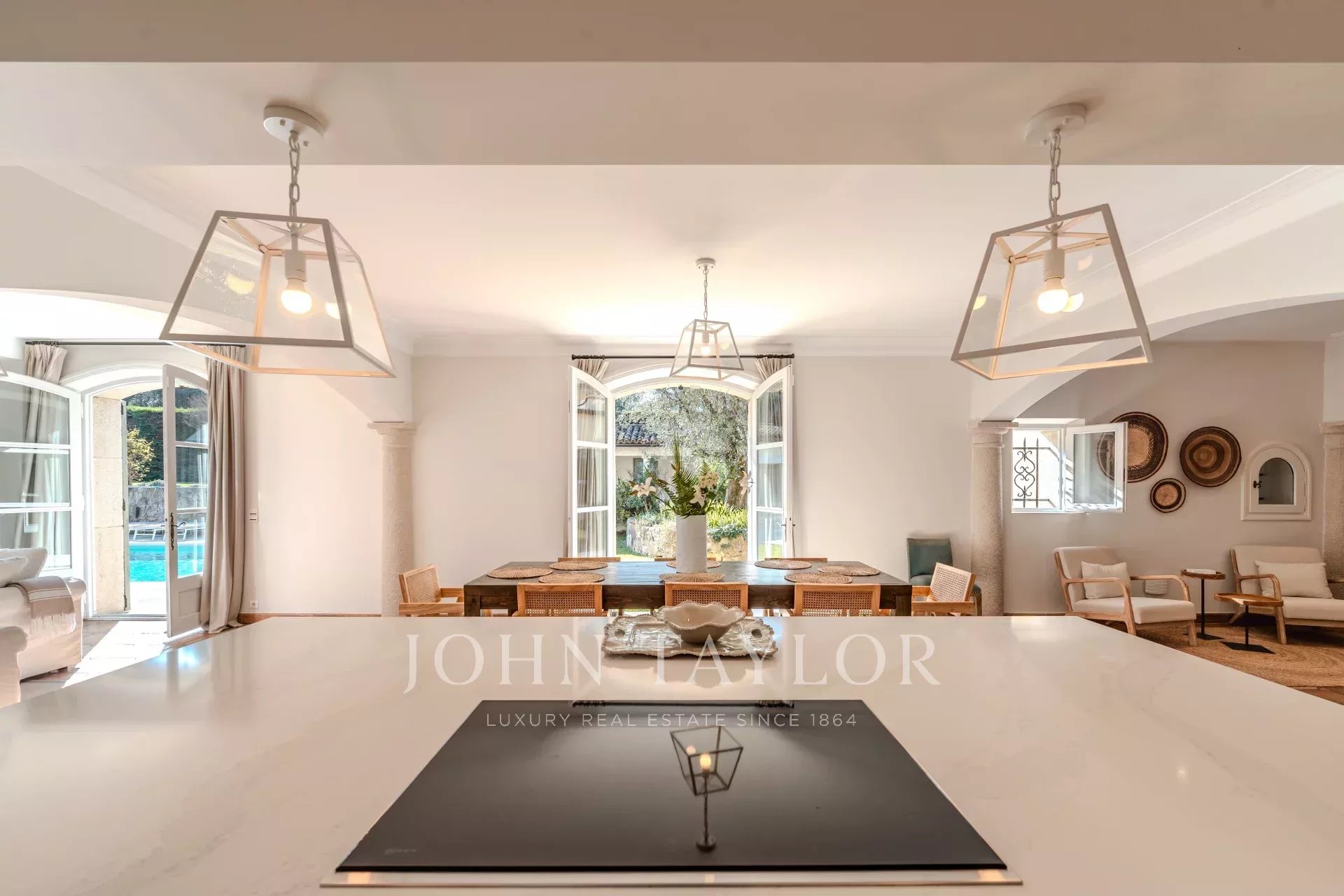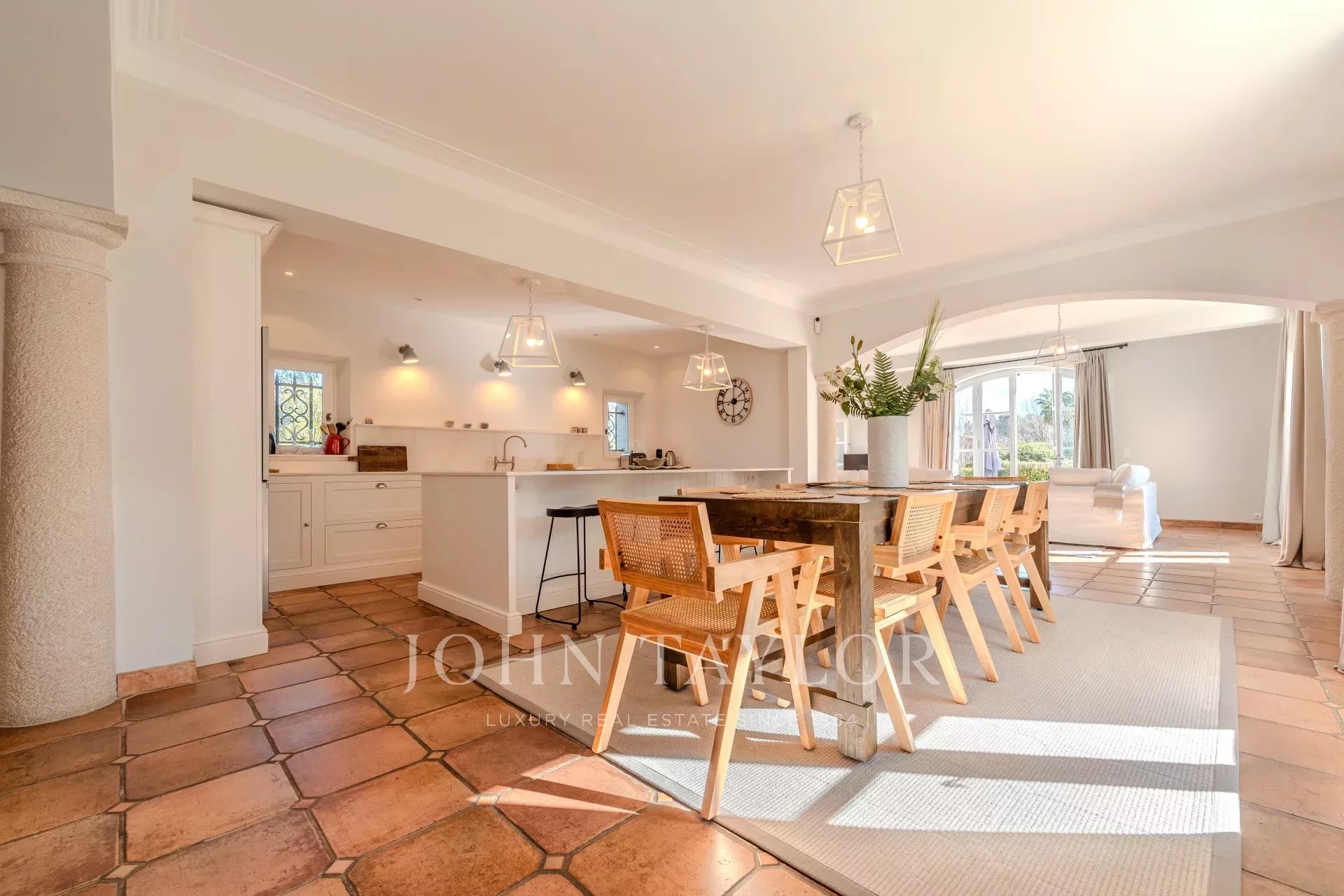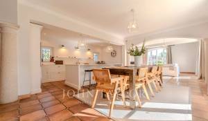 The villa features a magnificent fitted kitchen with a central island and opens onto a spacious living room, creating an ideal setting for family gatherings and entertaining guests.
