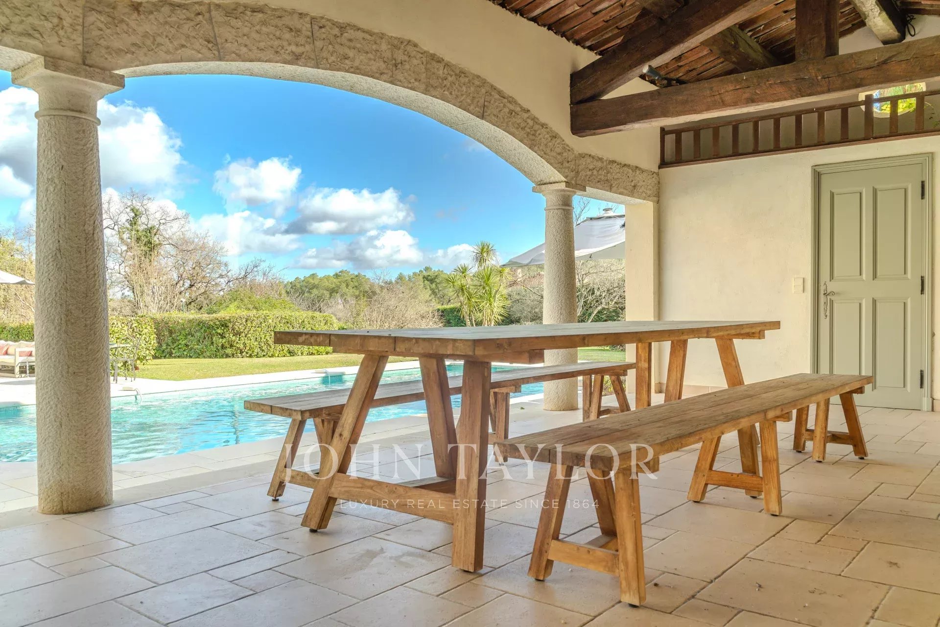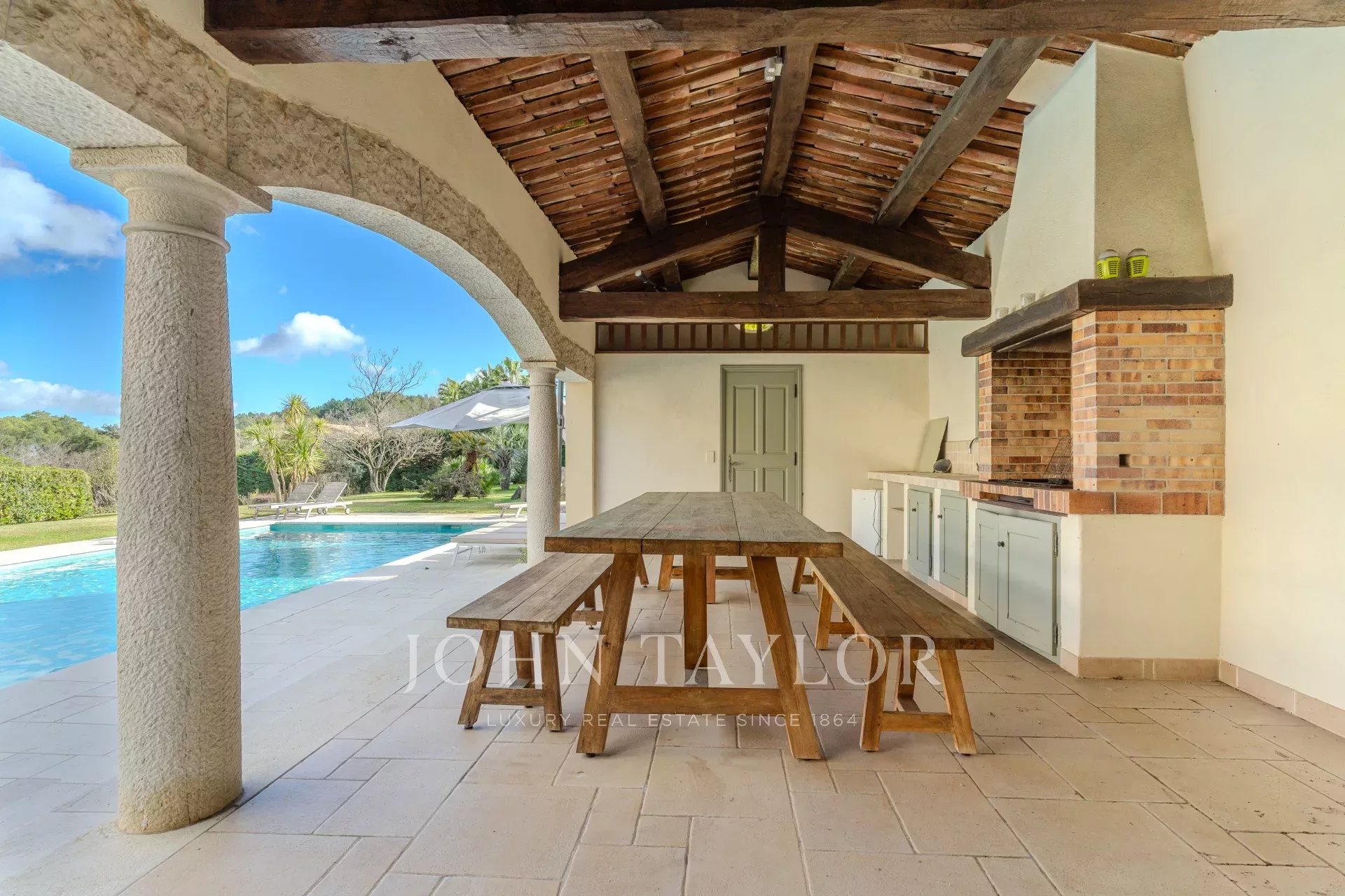 The outdoor area is equally impressive, with a magnificent swimming pool with summer kitchen and covered terrace for dining and barbecuing.