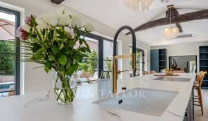 Fully equipped independent large kitchen, connecting the 2 wings of the house, with very large windows offering a view on the swimming pool area and the mountains.