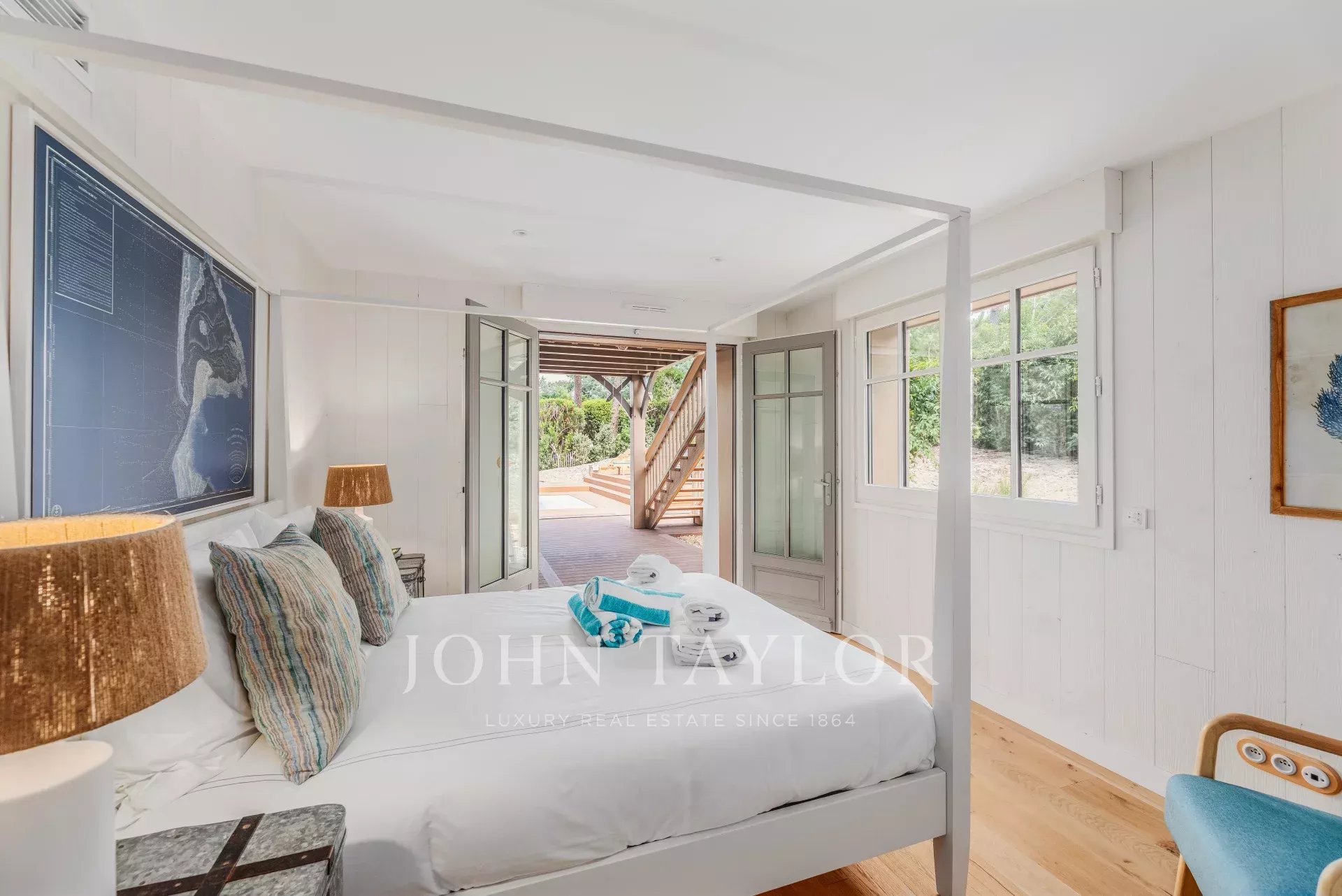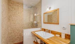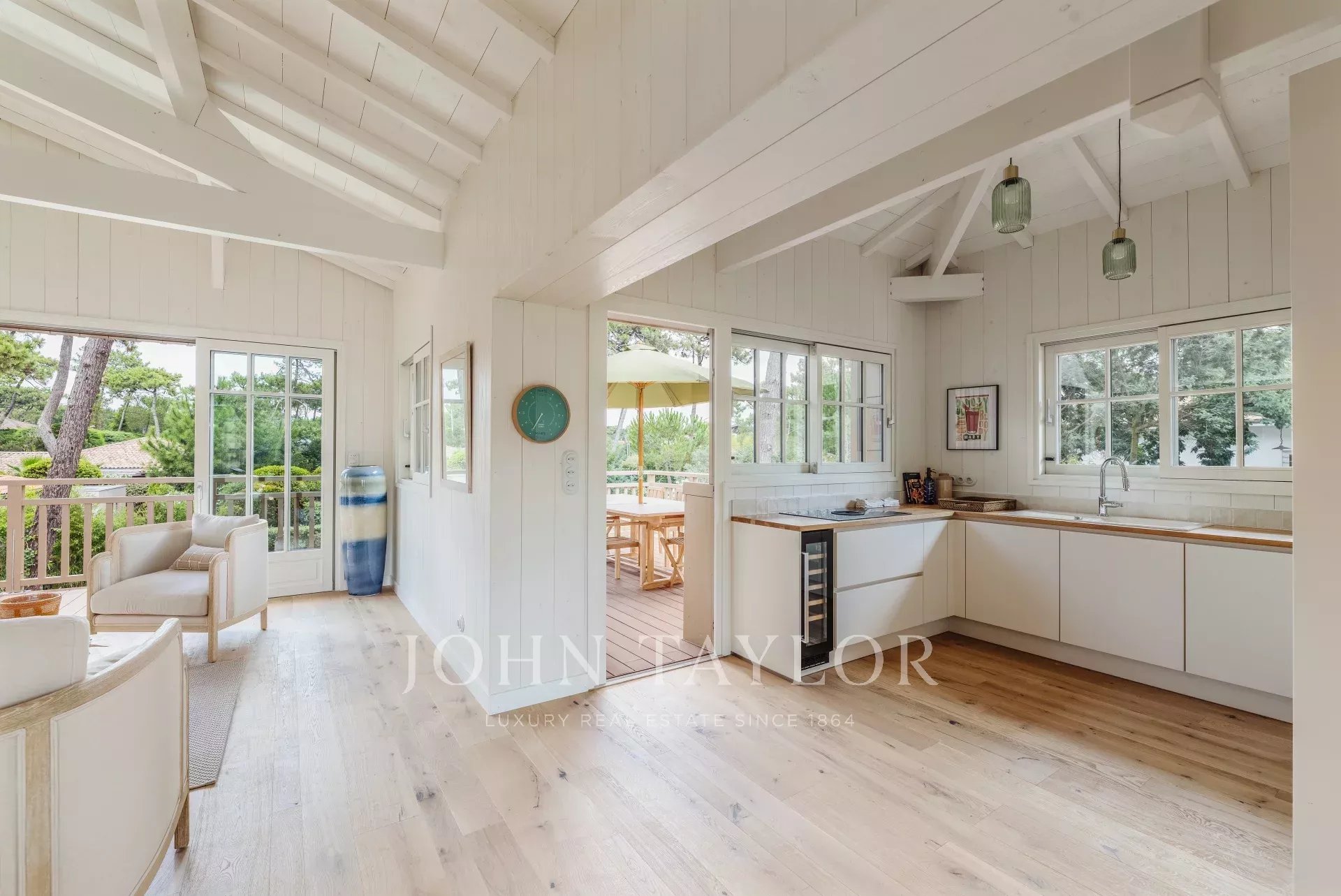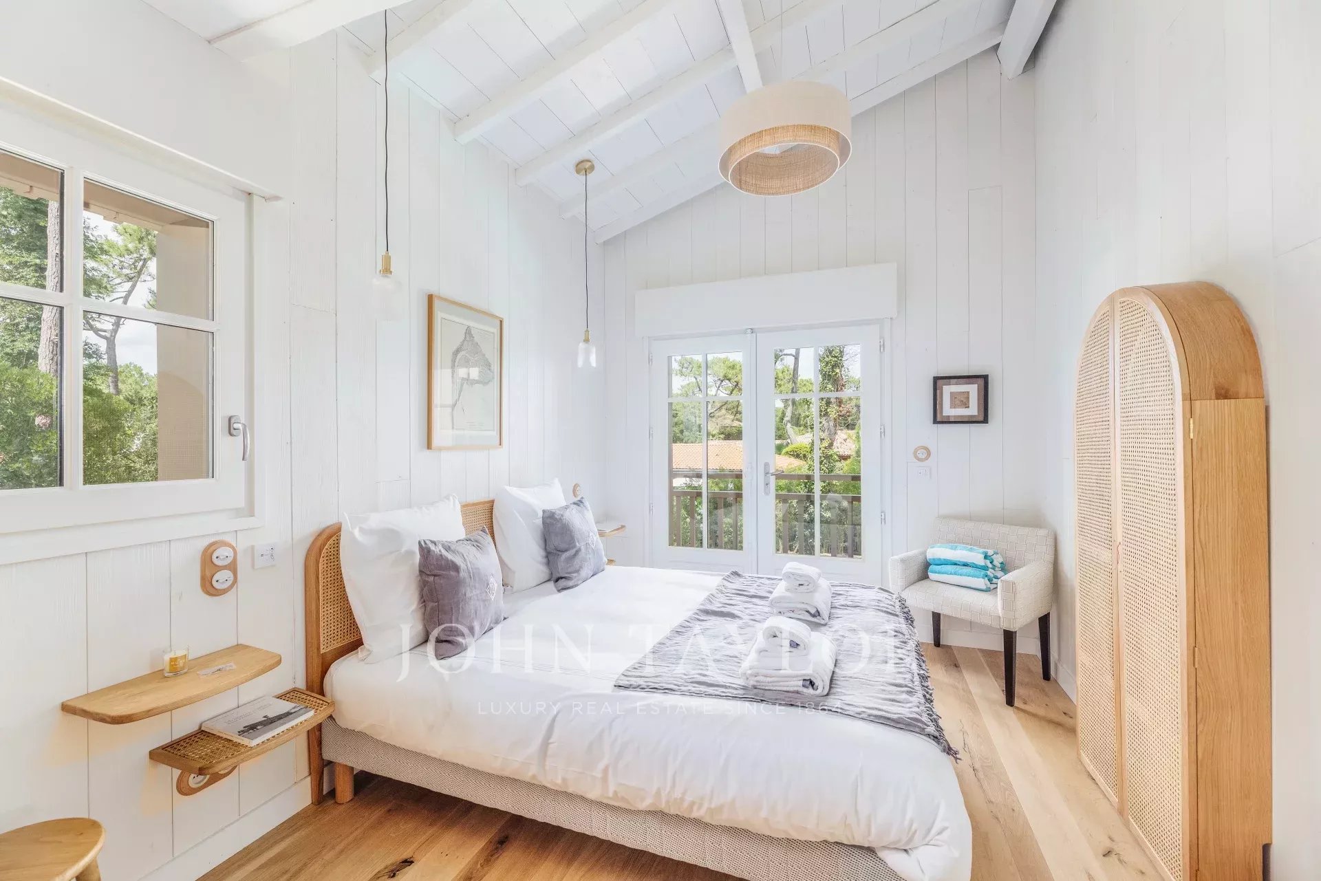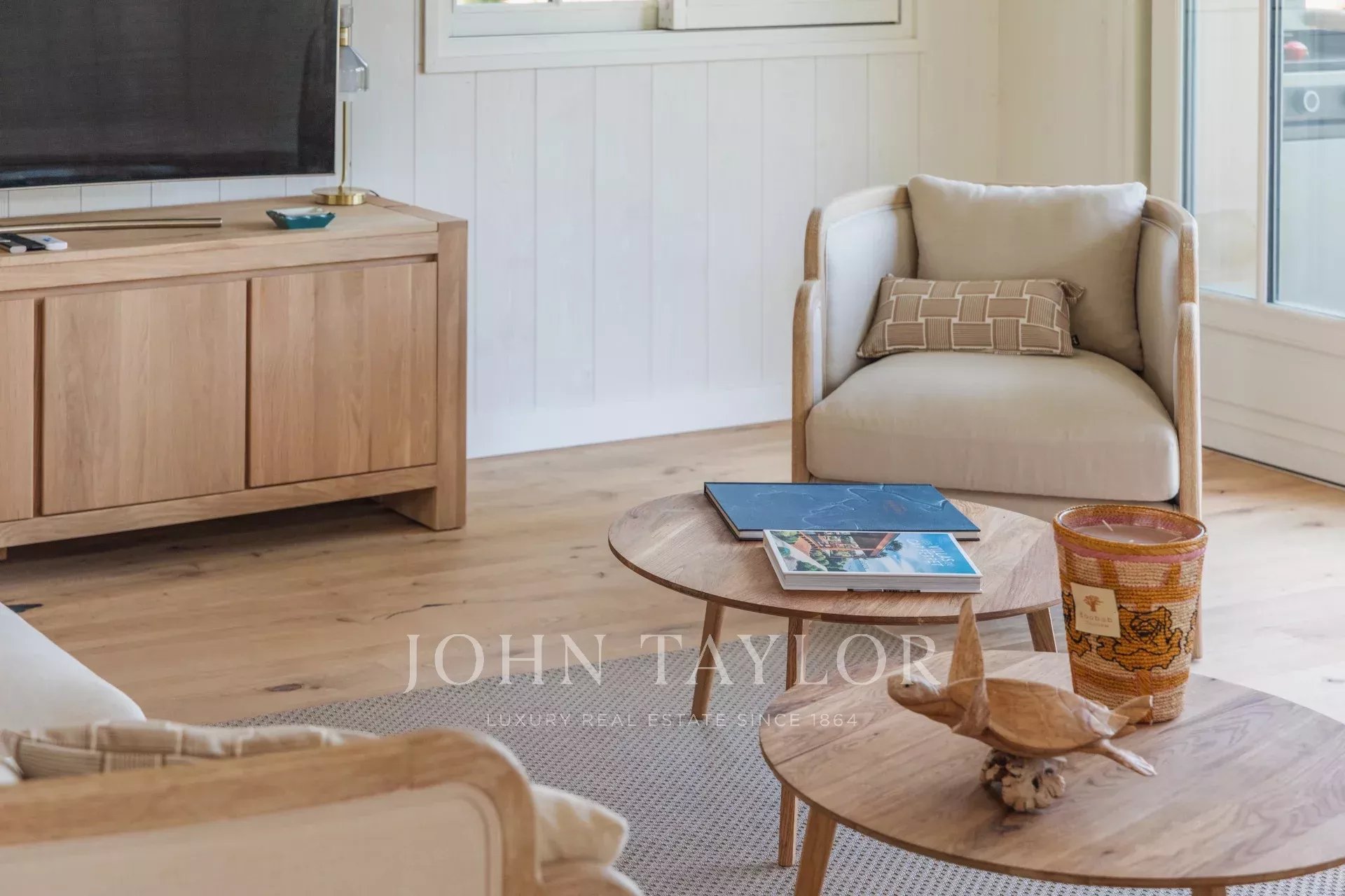 The living spaces are flooded with natural light thanks to large bay windows opening onto the landscaped garden. The living room provides a serene setting for moments of relaxation, while the terrace overlooking the garden, complete with a plancha, is perfect for convivial meals.