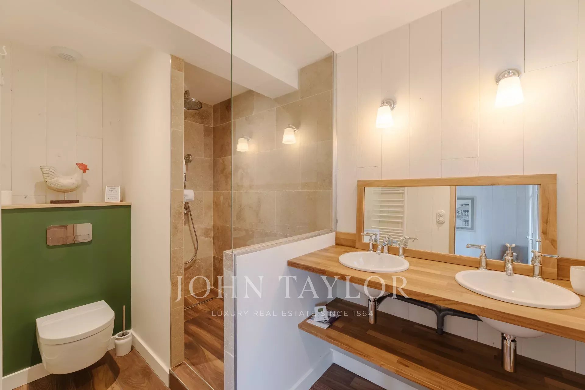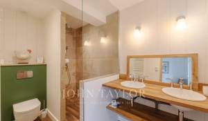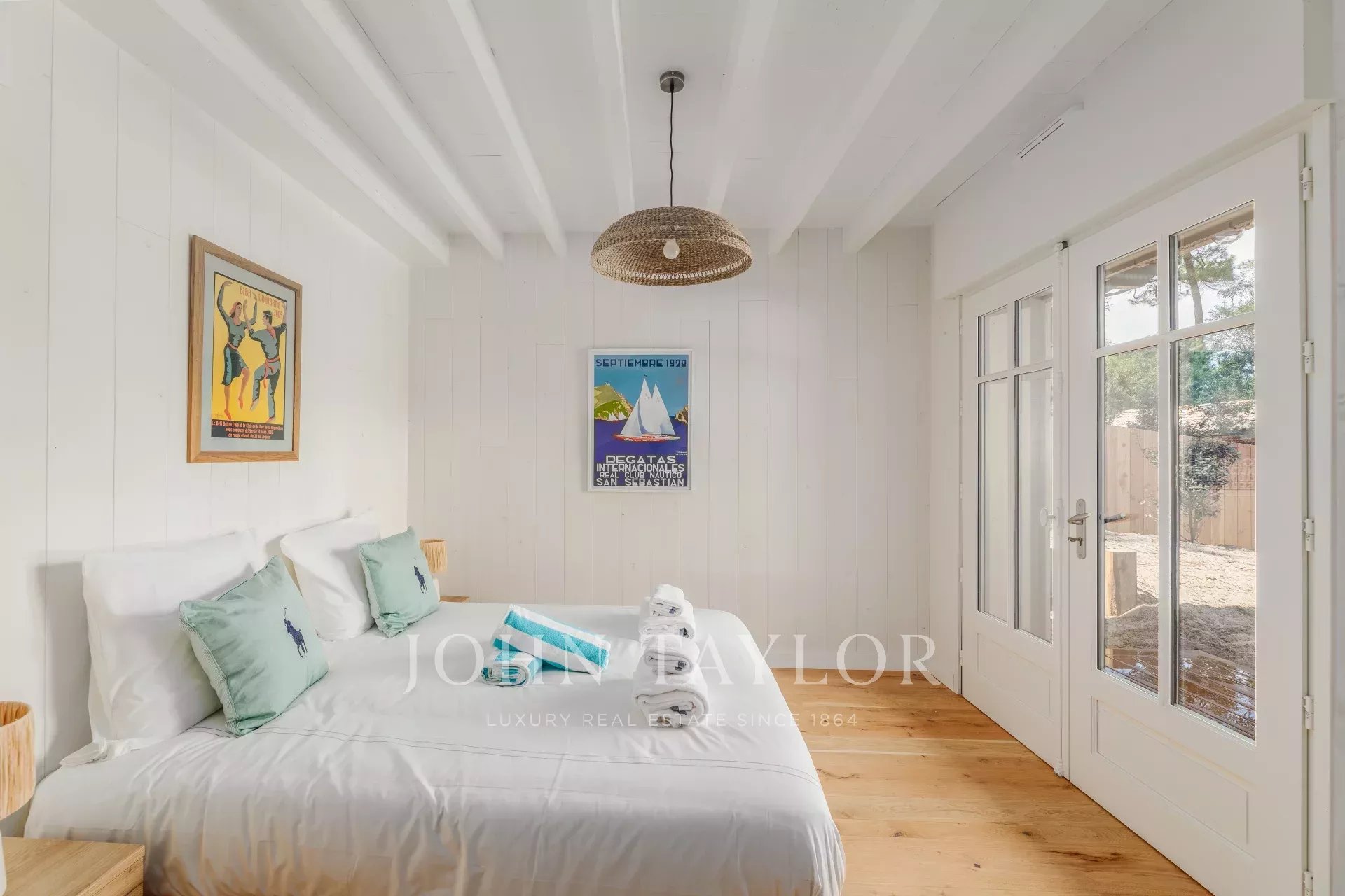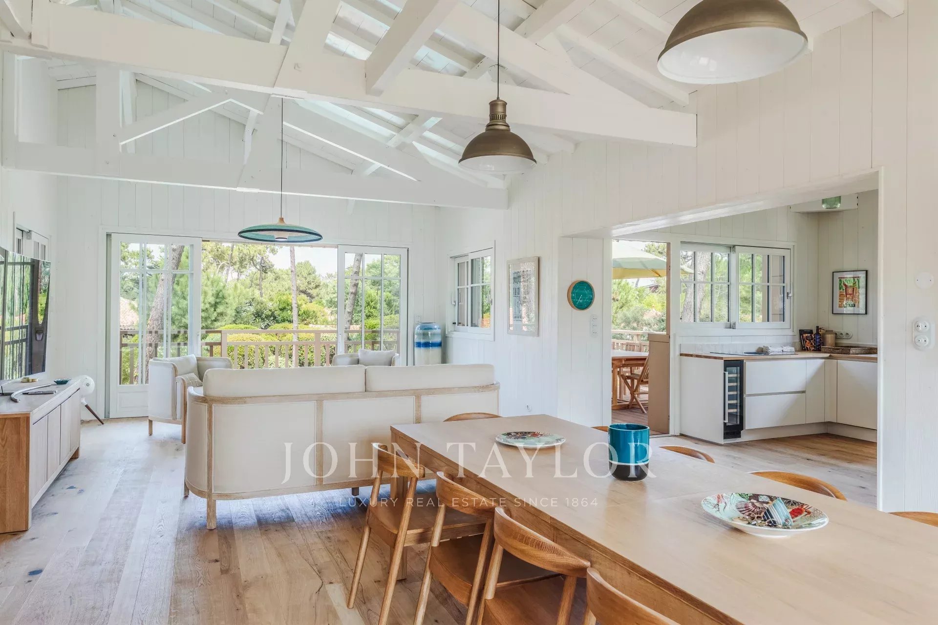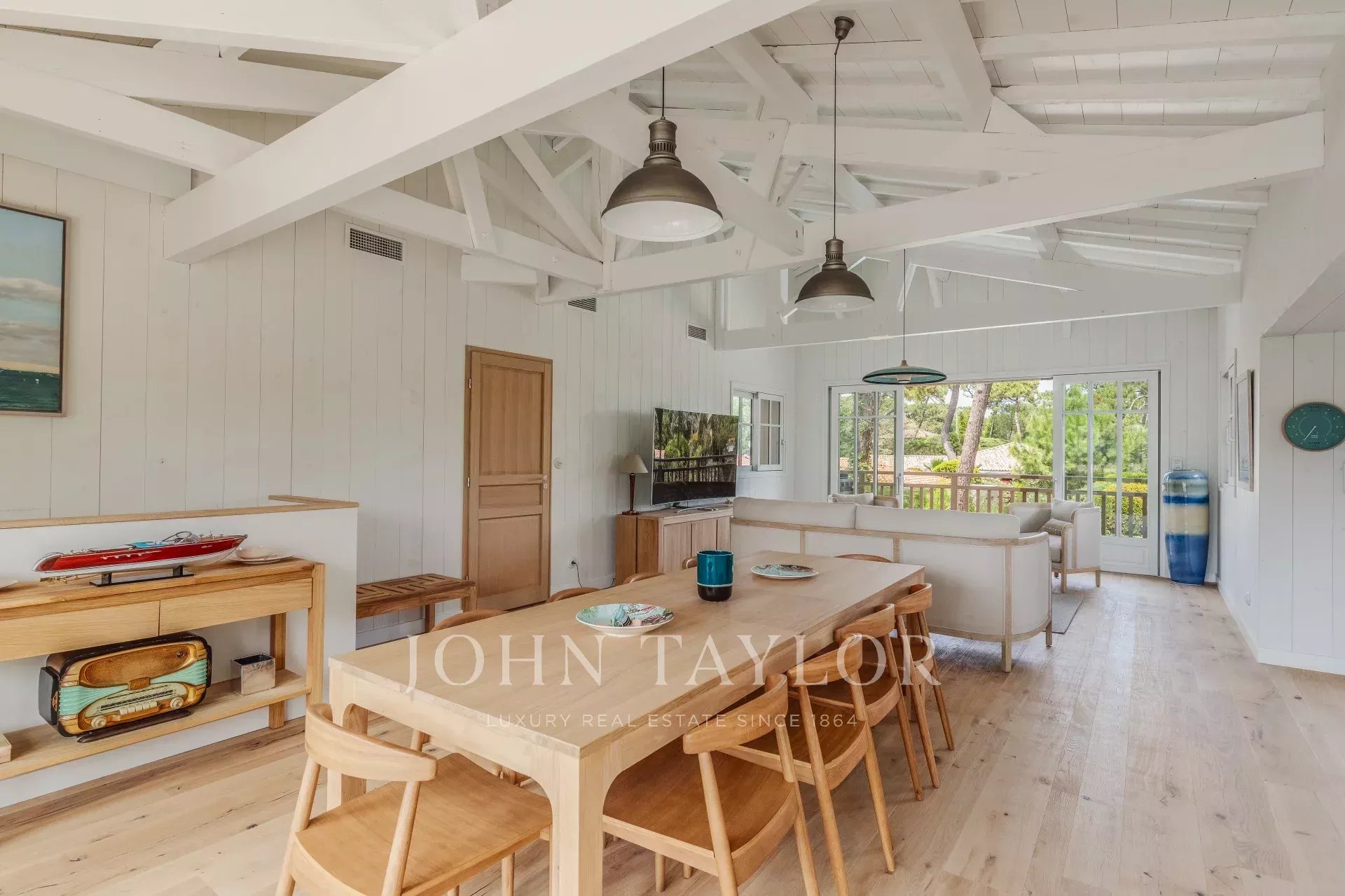 The living spaces are flooded with natural light thanks to large bay windows opening onto the landscaped garden. The living room provides a serene setting for moments of relaxation, while the terrace overlooking the garden, complete with a plancha, is perfect for convivial meals.