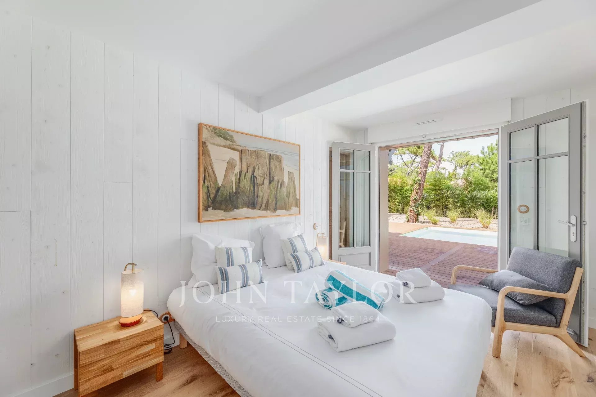 Outside, the garden, typical of Cap Ferret, is a true haven of greenery where Mediterranean plants and local trees blend harmoniously. At the center, a sun-drenched heated pool surrounded by loungers and a garden lounge creates the ideal space to enjoy warm summer days.