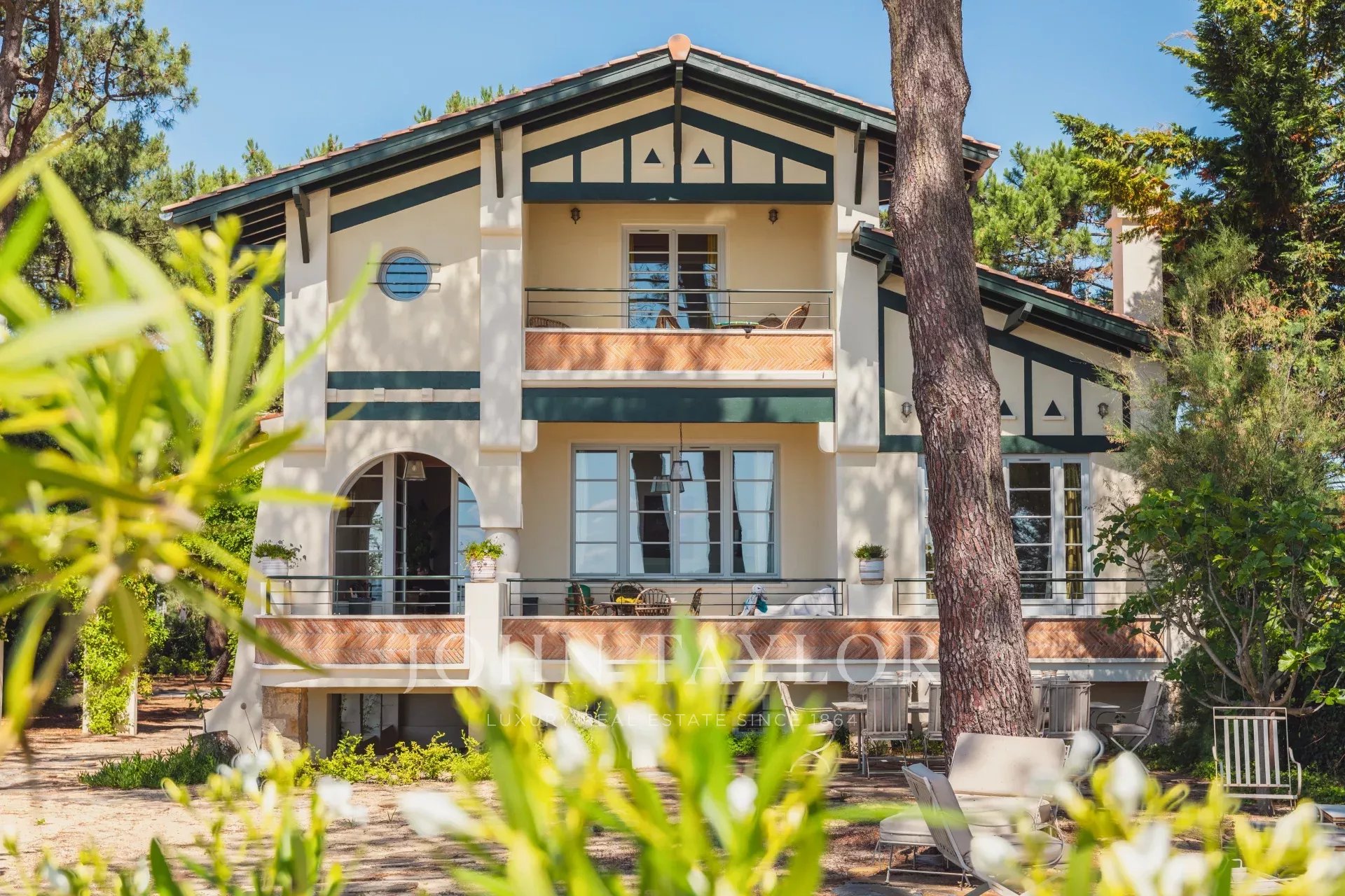 Nestled in the heart of a landscaped garden and facing the basin, it offers a rare interlude: the changing light of the Dune du Pilat as a backdrop, direct access to the beach below, and the enveloping calm of a timeless setting.