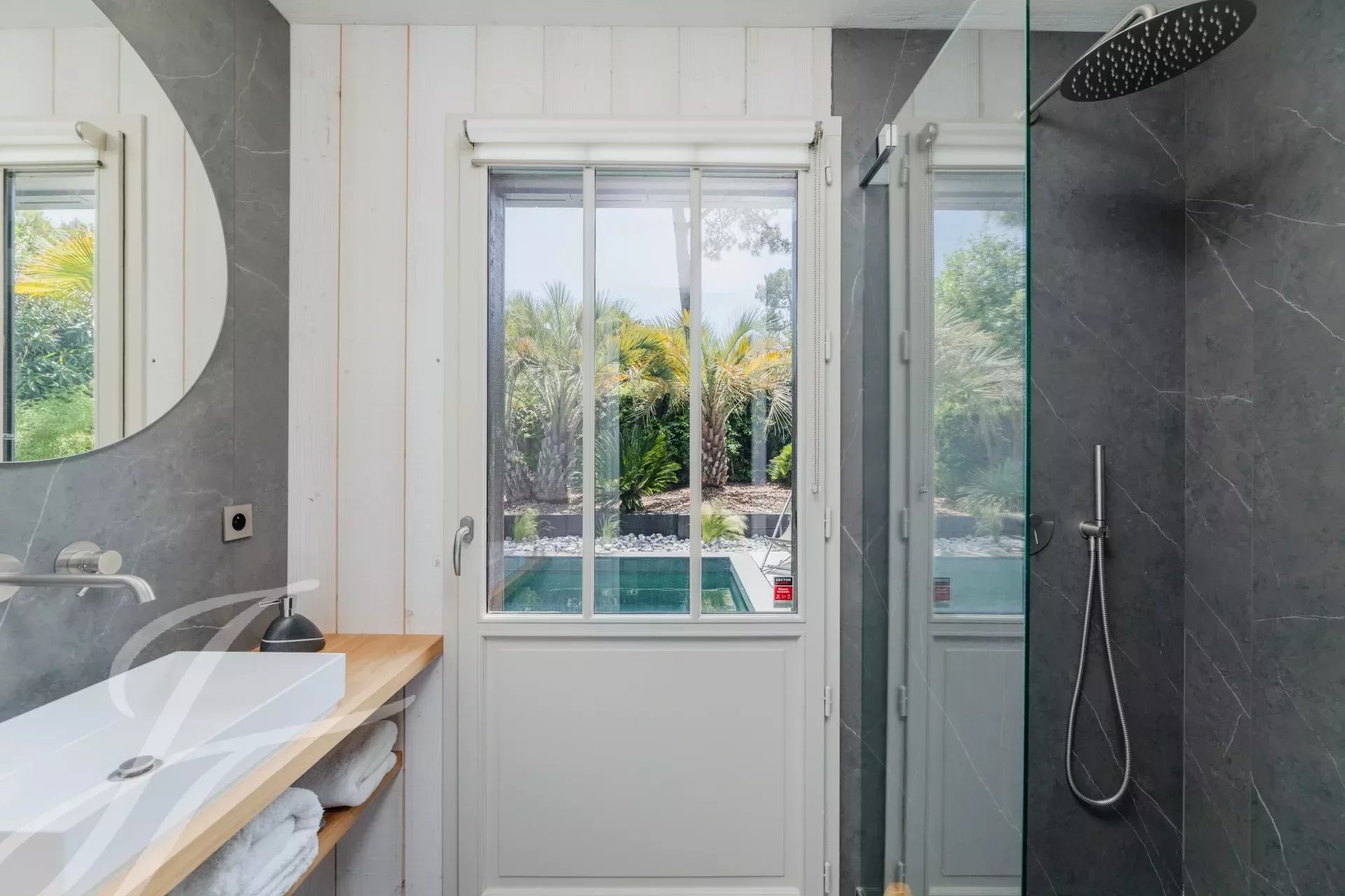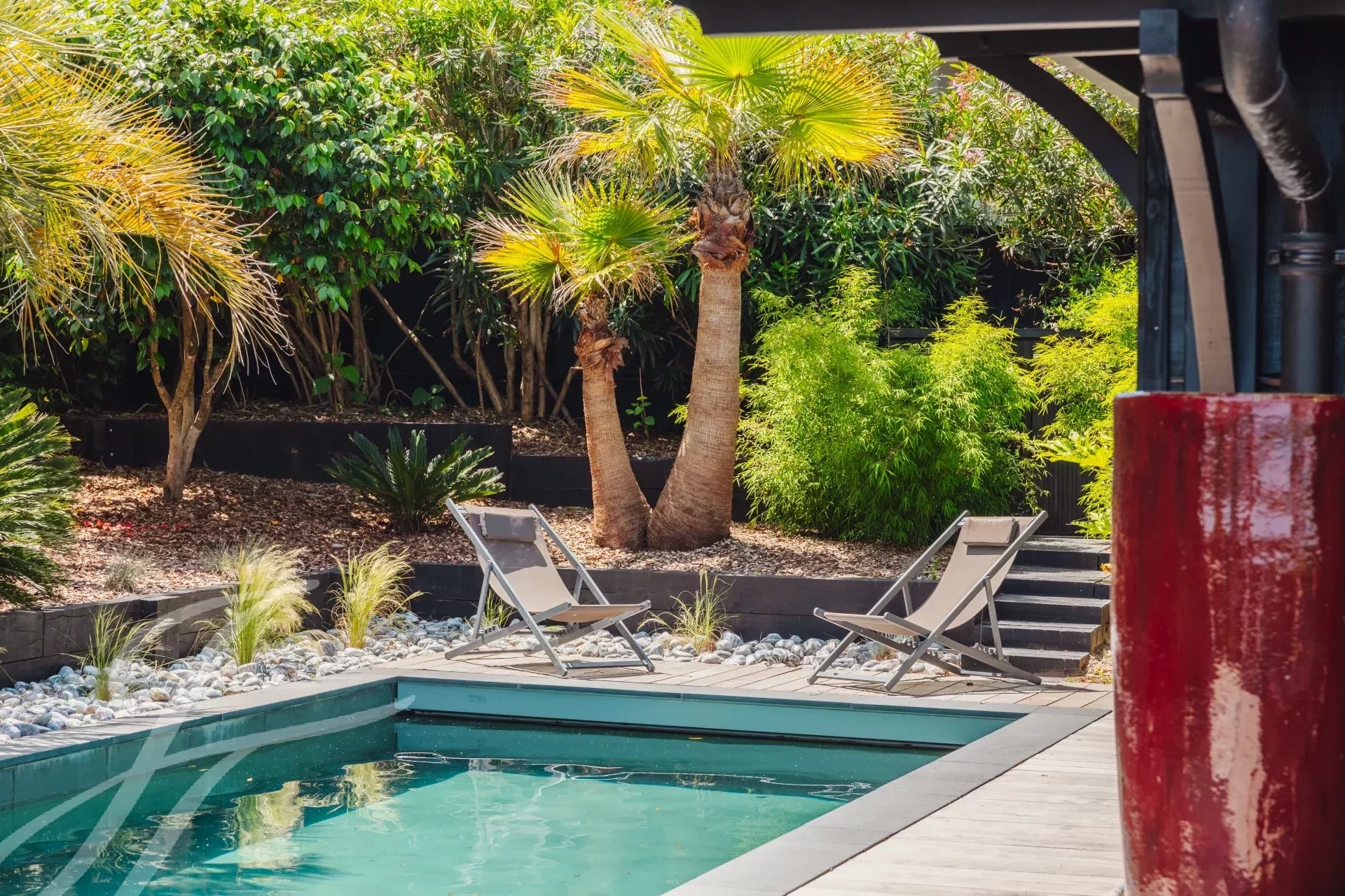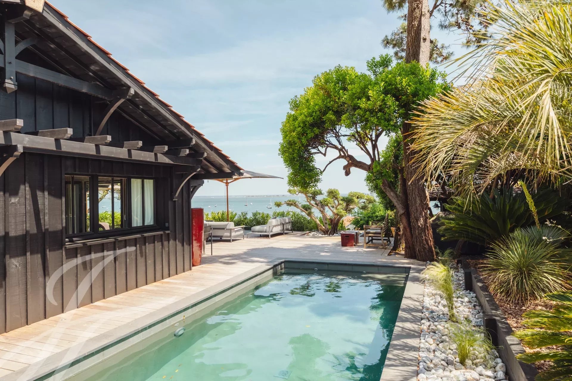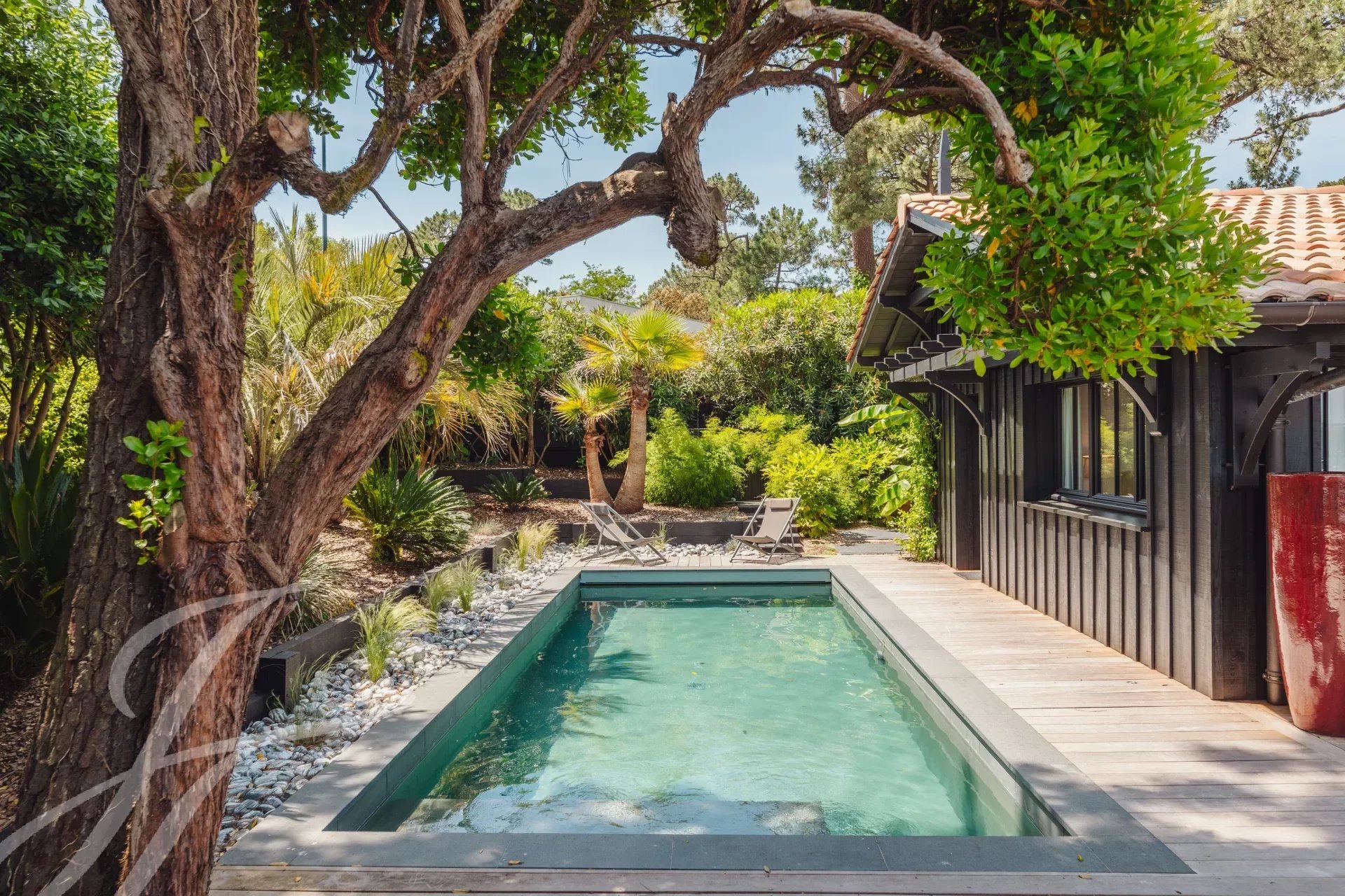 Relax in complete privacy, hidden from view in this lush setting. A spacious exotic wood terrace awaits you, perfect for enjoying meals, aperitifs, or an afternoon by the heated pool, all while never losing sight of the shimmering waters of the basin.