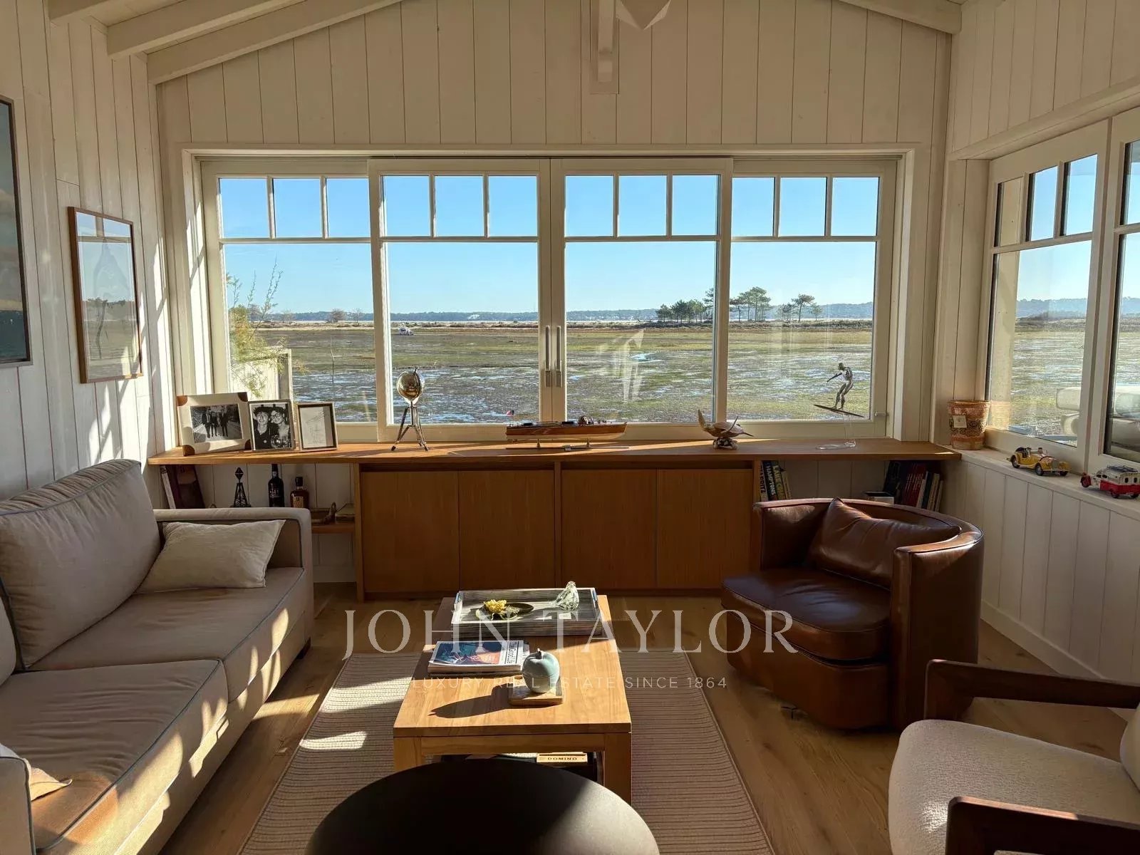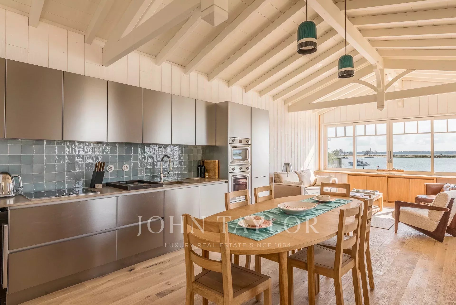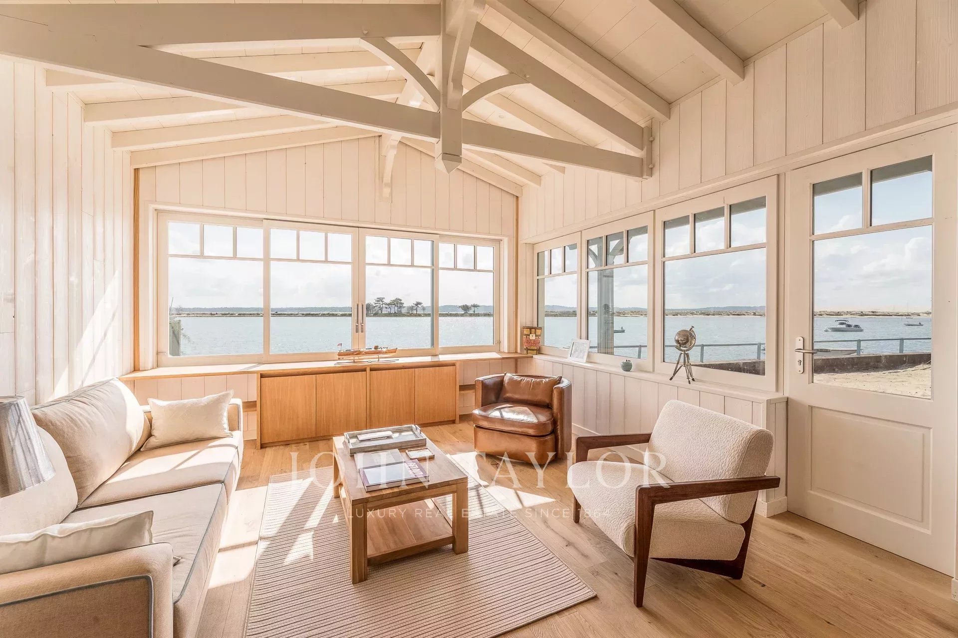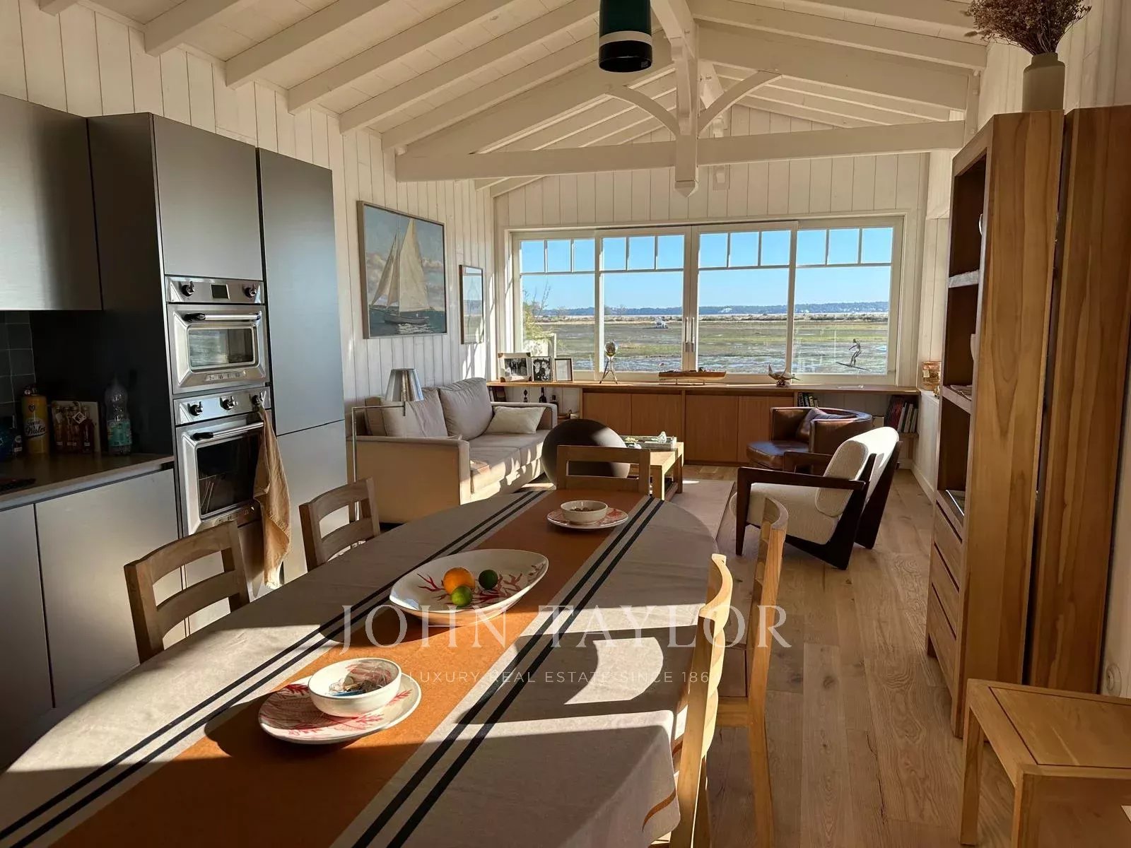 The main house features a bright living room opening onto the Bassin, a fully-equipped open kitchen, an ethanol stove and a discreet video projector for cosy evenings without ever taking your eyes off the landscape.