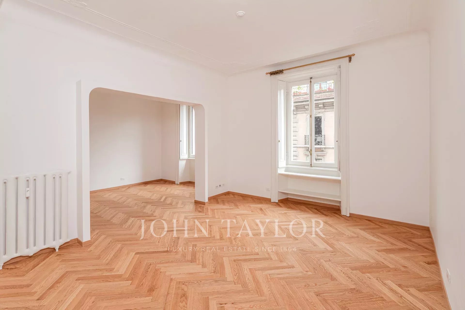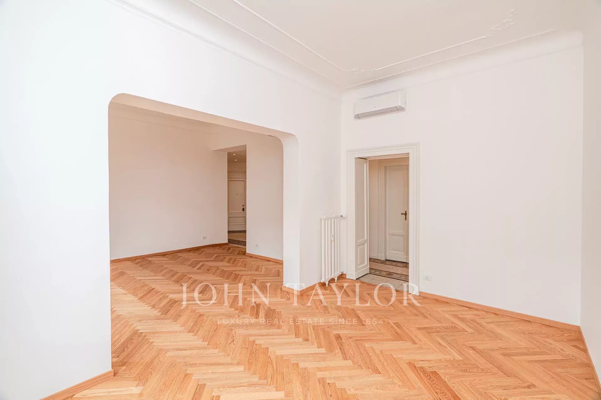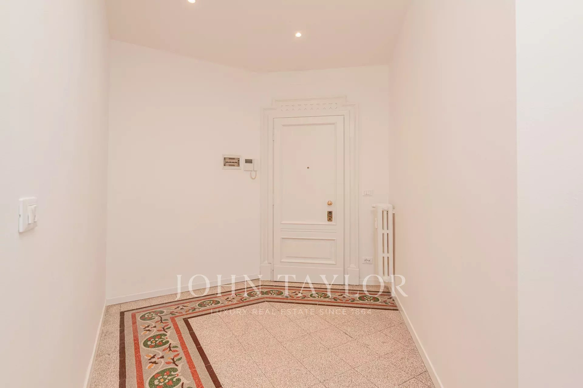 The property is very bright and quiet, located on a high floor of a prestigious historic building, equipped with full-day security and concierge service. Residence of approx. 110 sqm, an apartment of great charm, featuring a large entrance hall, splendid and spacious double living room, large eat-in kitchen with elegant new custom-made furnishings, 2 bedrooms, 2 bathrooms. Balcony. This splendid home, recently renovated, stands out for its precious period finishes and its views. The apartment is available fully renovated and partially furnished with custom-made furniture, with the possibility to furnish the interiors according to personal taste and needs. This property represents a unique opportunity in a privileged location, perfect for those seeking an elegant home in the oldest and most residential neighborhood of Milan.