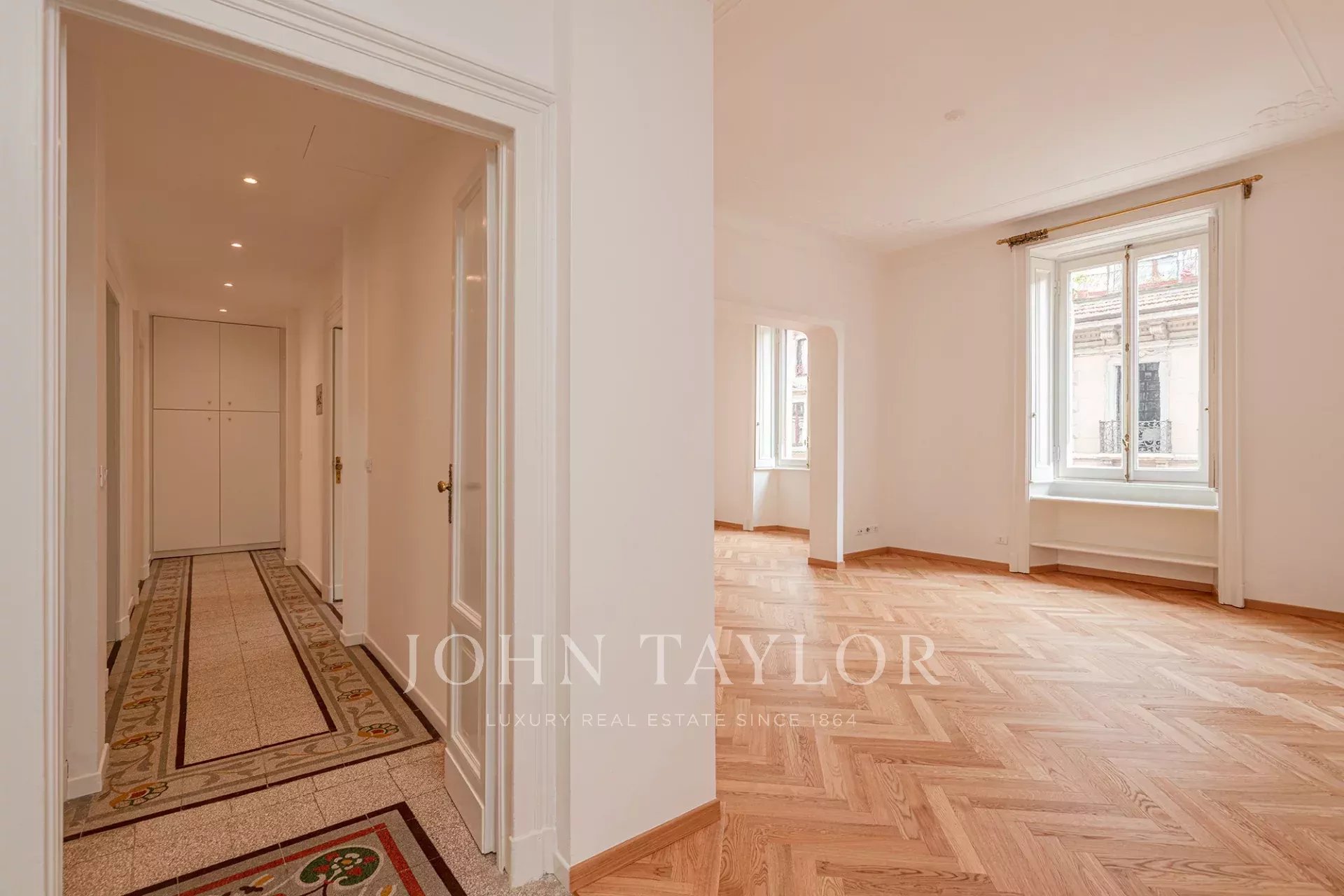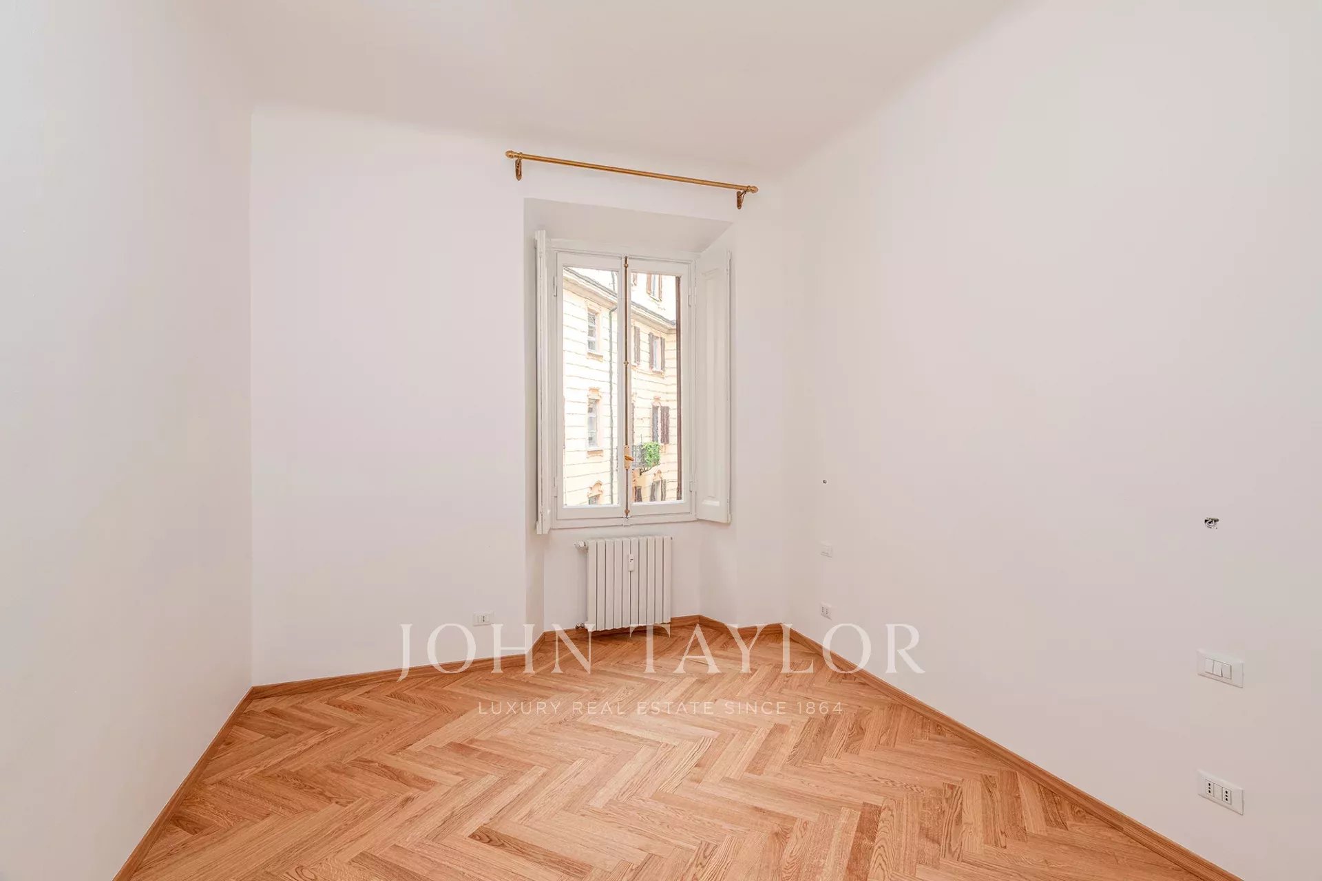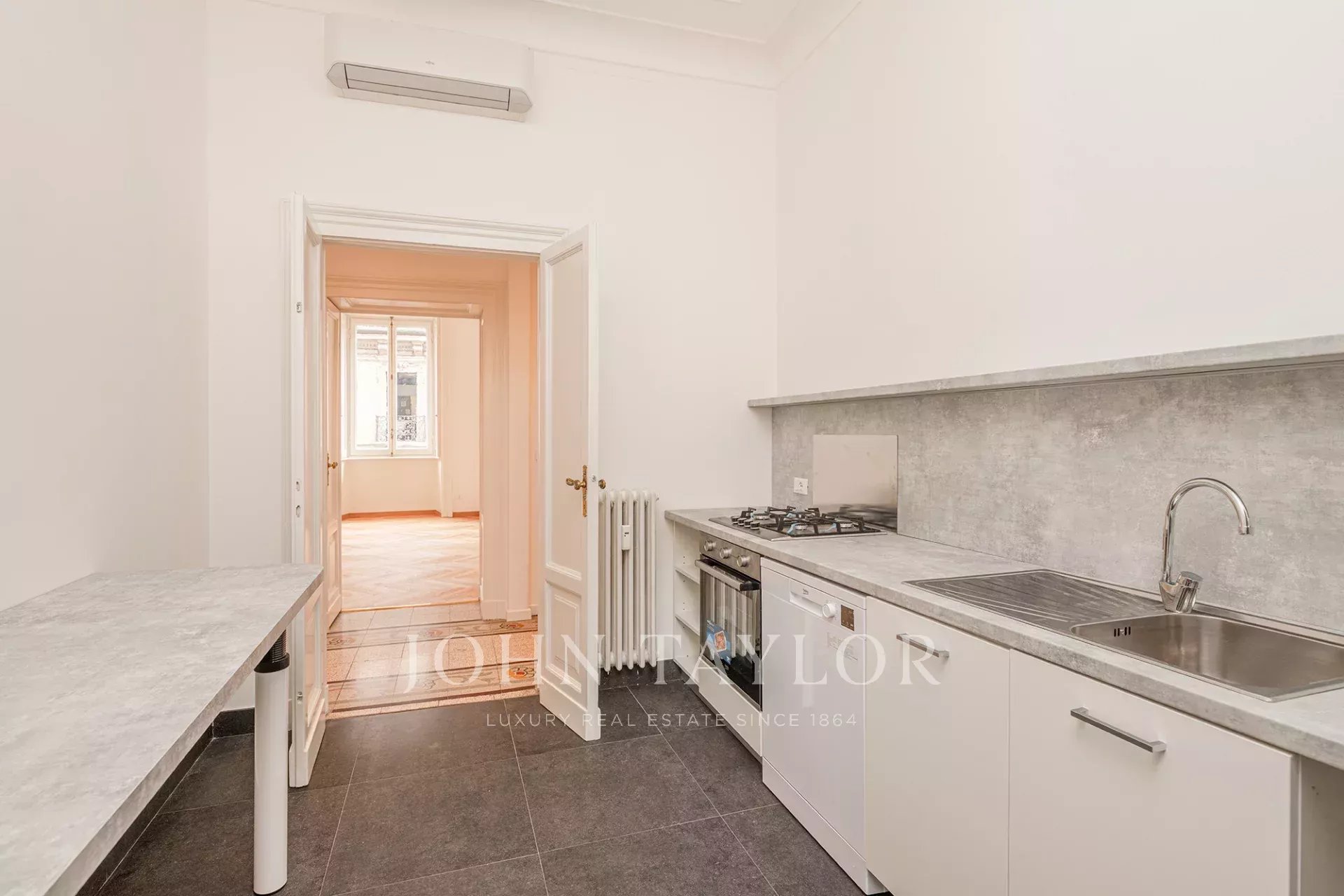 The property is very bright and quiet, located on a high floor of a prestigious historic building, equipped with full-day security and concierge service. Residence of approx. 110 sqm, an apartment of great charm, featuring a large entrance hall, splendid and spacious double living room, large eat-in kitchen with elegant new custom-made furnishings, 2 bedrooms, 2 bathrooms. Balcony. This splendid home, recently renovated, stands out for its precious period finishes and its views. The apartment is available fully renovated and partially furnished with custom-made furniture, with the possibility to furnish the interiors according to personal taste and needs. This property represents a unique opportunity in a privileged location, perfect for those seeking an elegant home in the oldest and most residential neighborhood of Milan.