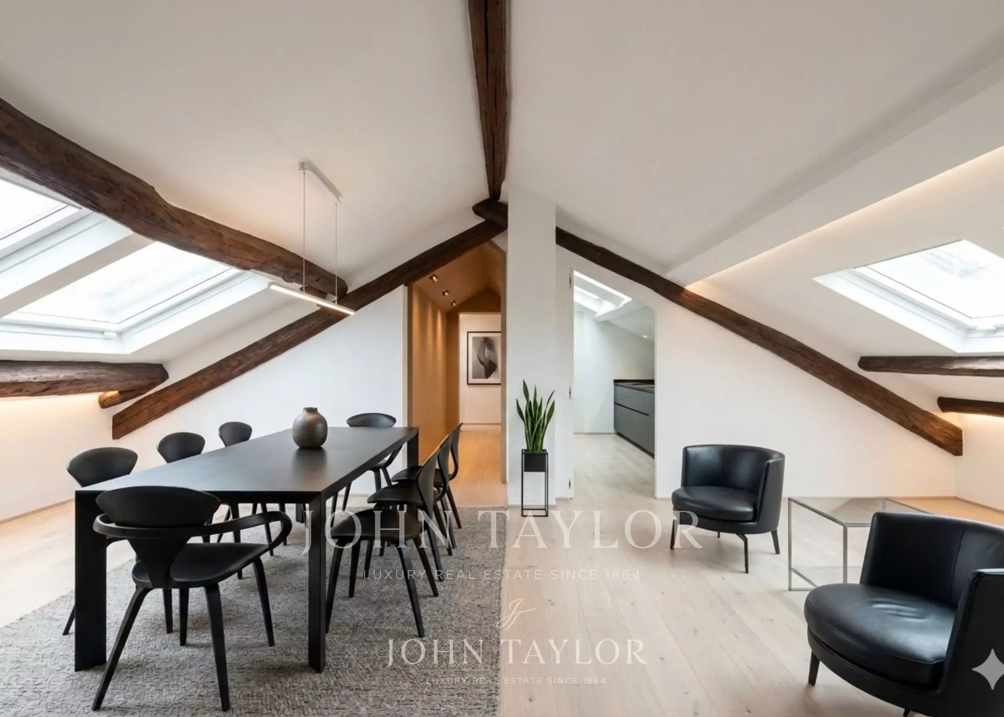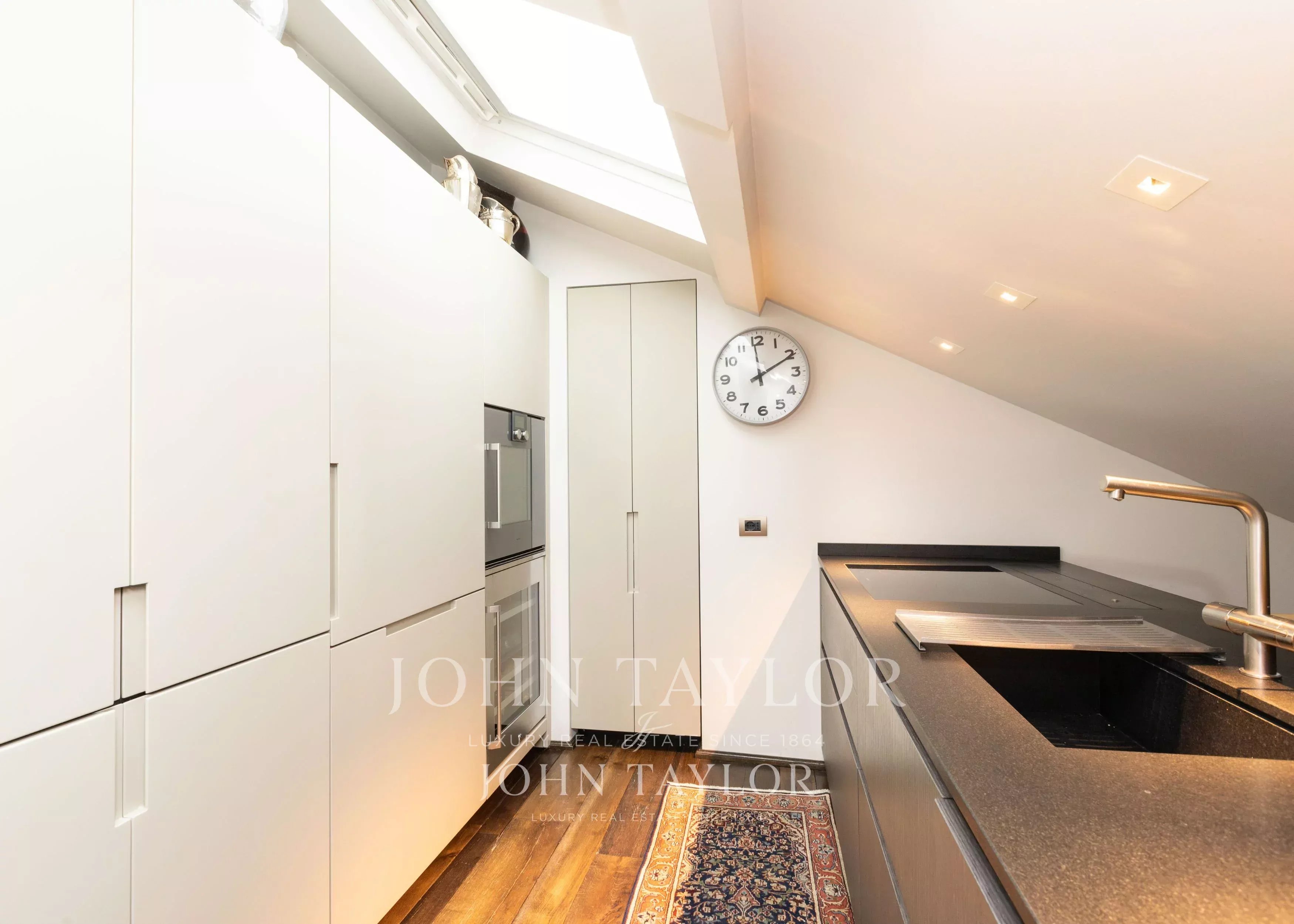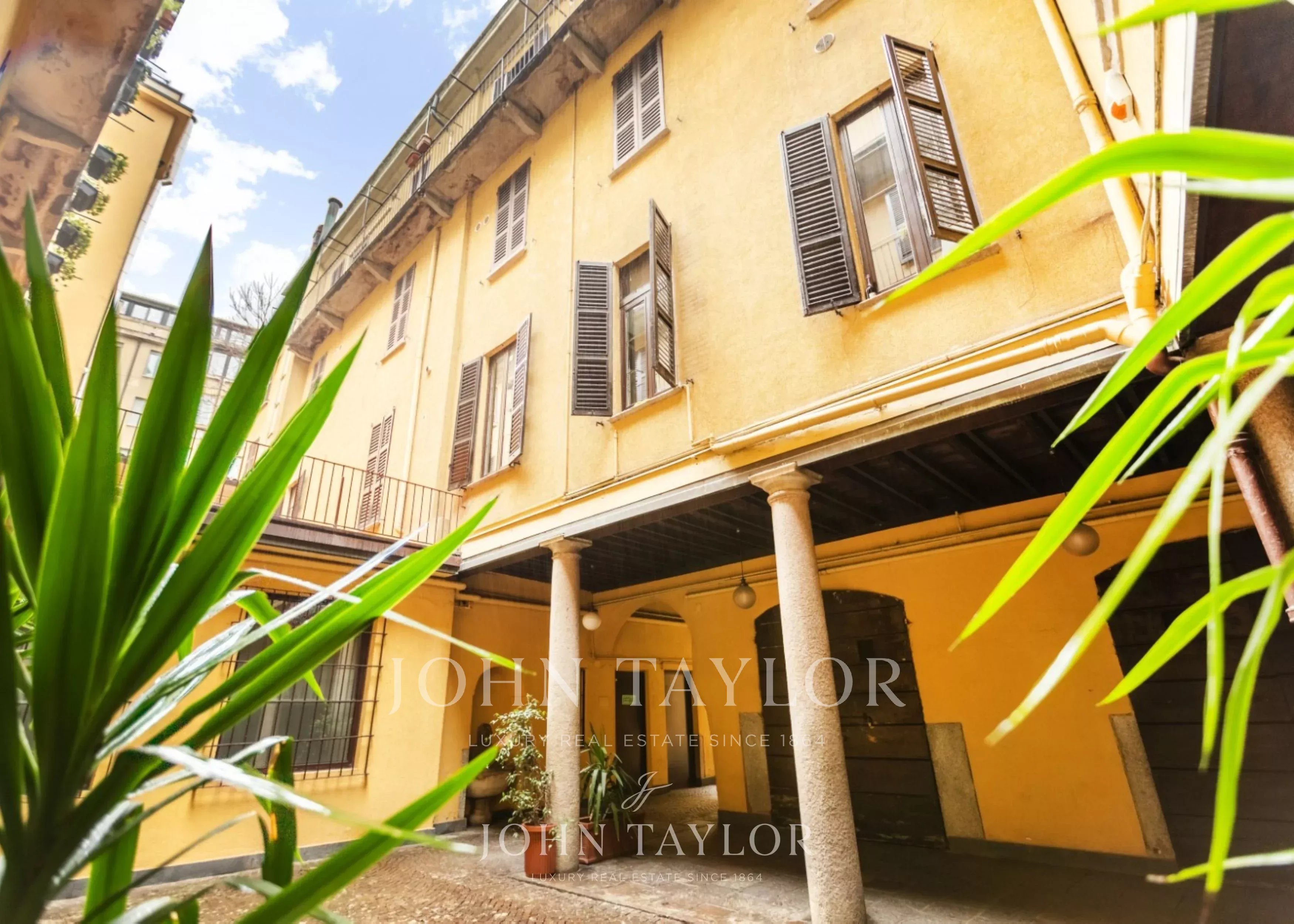 In the most exclusive heart of Milan, in a splendid setting of great historical value, prestigious and exclusive penthouse of approximately 200 sqm, full of charm, set in a context of absolute privacy and silence. A representative property, very bright and quiet, featuring a wonderful and large planted and furnished terrace. The residence consists of two entrances, a large double living room with fireplace, an elegant dining room, a kitchen with valuable custom-made furnishings, two spacious double bedrooms both with fireplace, a study, two walk-in closets, a laundry room, and two bathrooms. The penthouse has undergone a refined renovation with finishes of the highest quality, enchanting original exposed beams, parquet flooring in planks made from Venetian “briccole” wood, a lighting system, splendid boiserie, and an advanced home automation system. The project, curated by a renowned Milanese architecture studio, enhances every space through interior design choices and built-in furnishings from the most prestigious international brands. € 6.500 monthly. Possibility of a parking space in the immediate vicinity. Energy class C.
