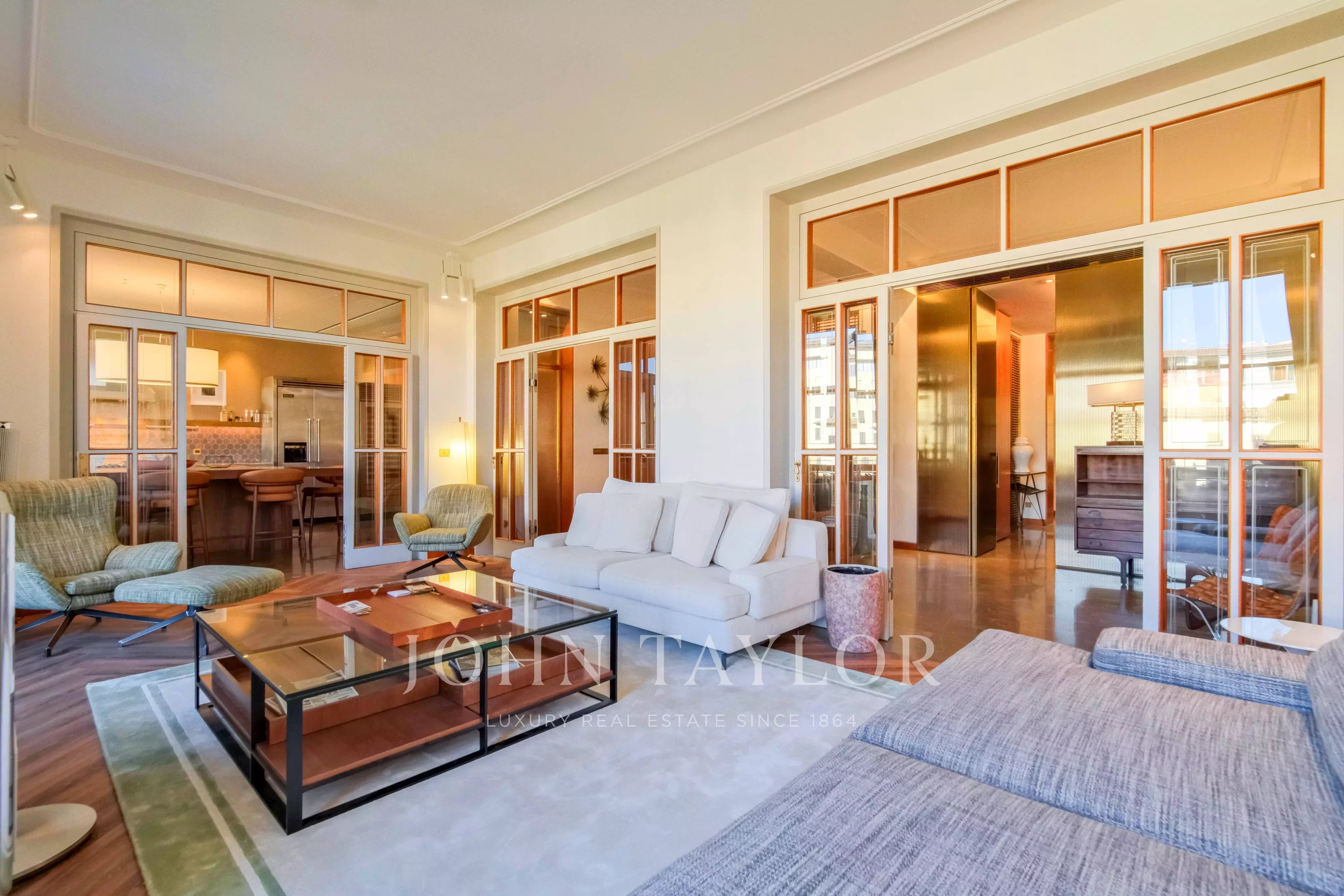 The kitchen is distinguished by a bespoke brass and teak booth embracing the breakfast table, perfectly positioned to capture captivating views of the Uffizi Gallery — transforming everyday living into a uniquely atmospheric experience.
