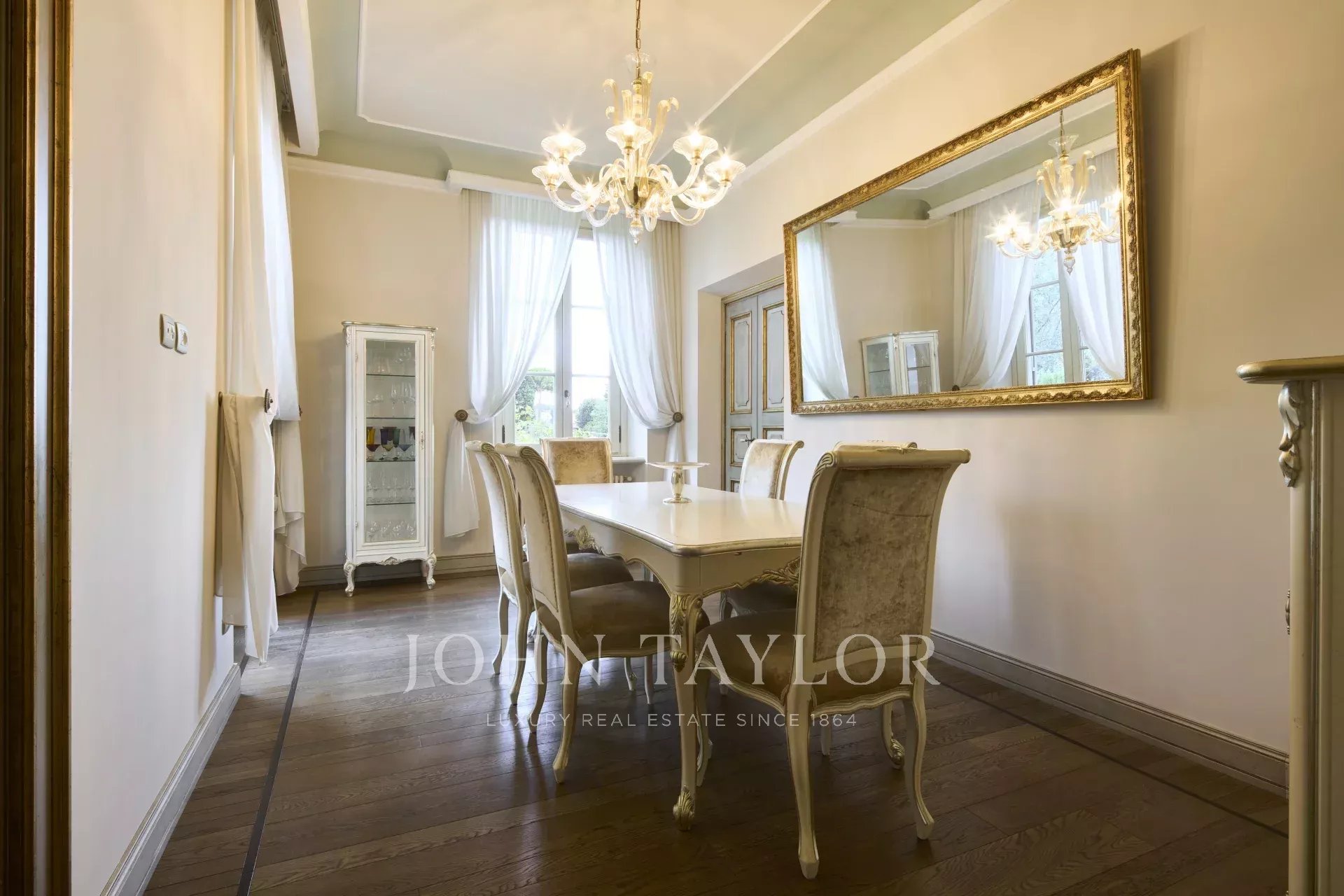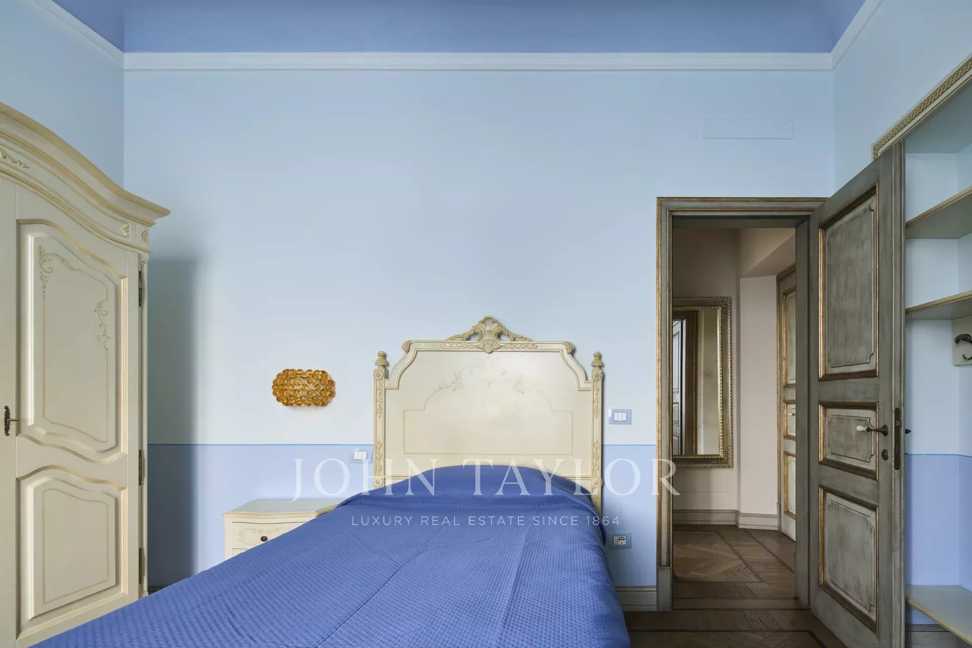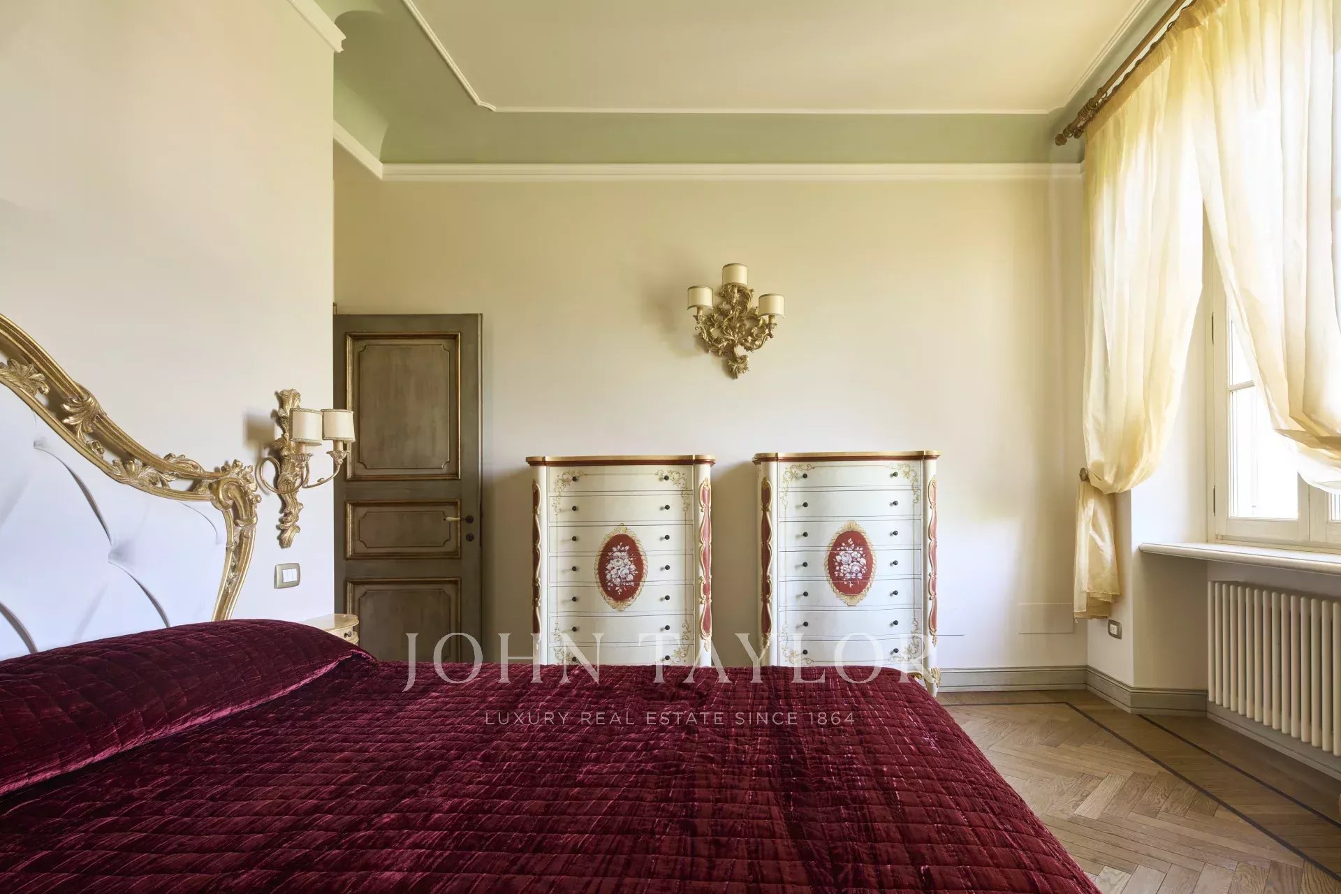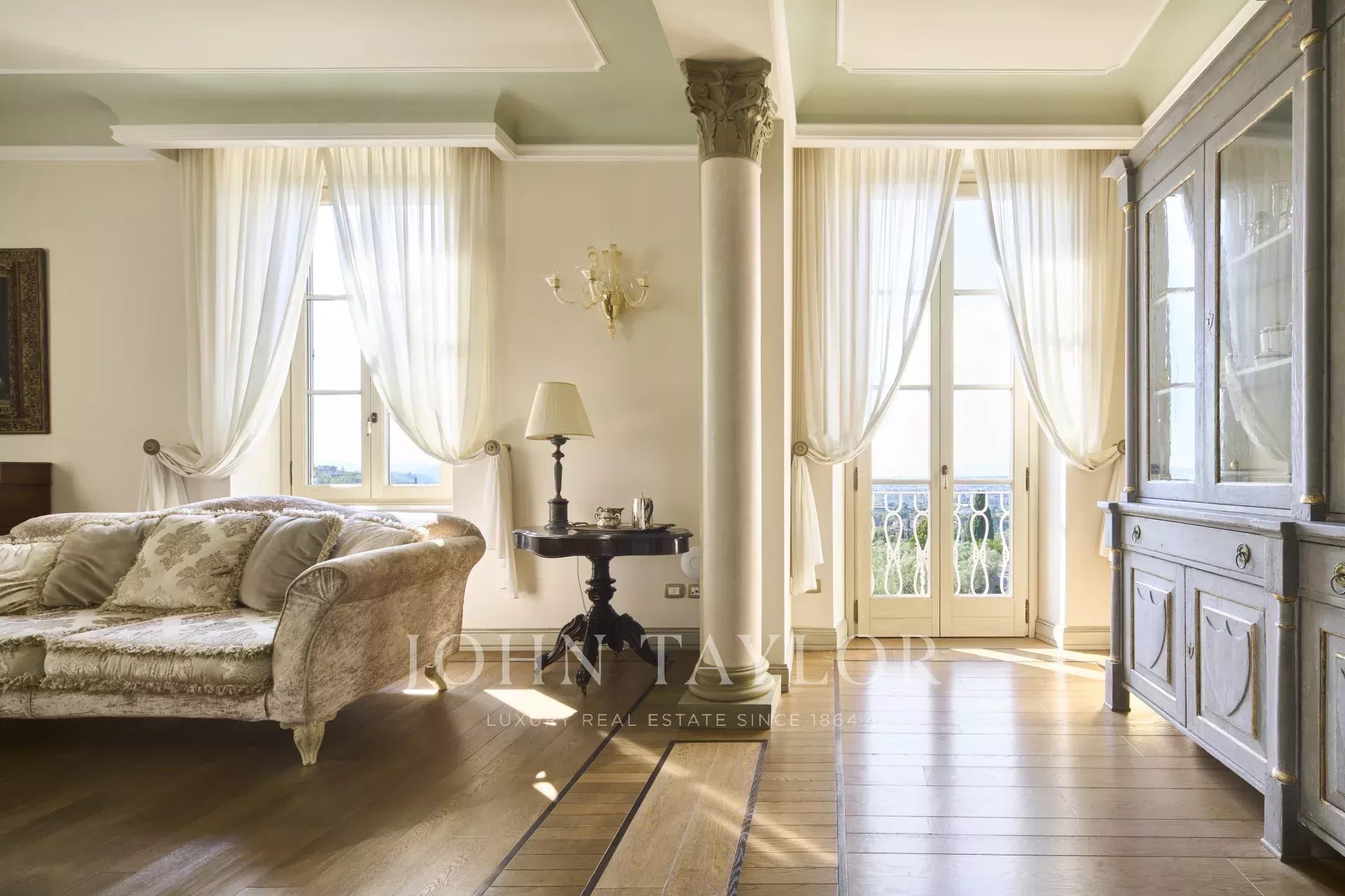 The interior is enhanced with wooden floors and frescoed walls and ceilings, showcasing antique details.