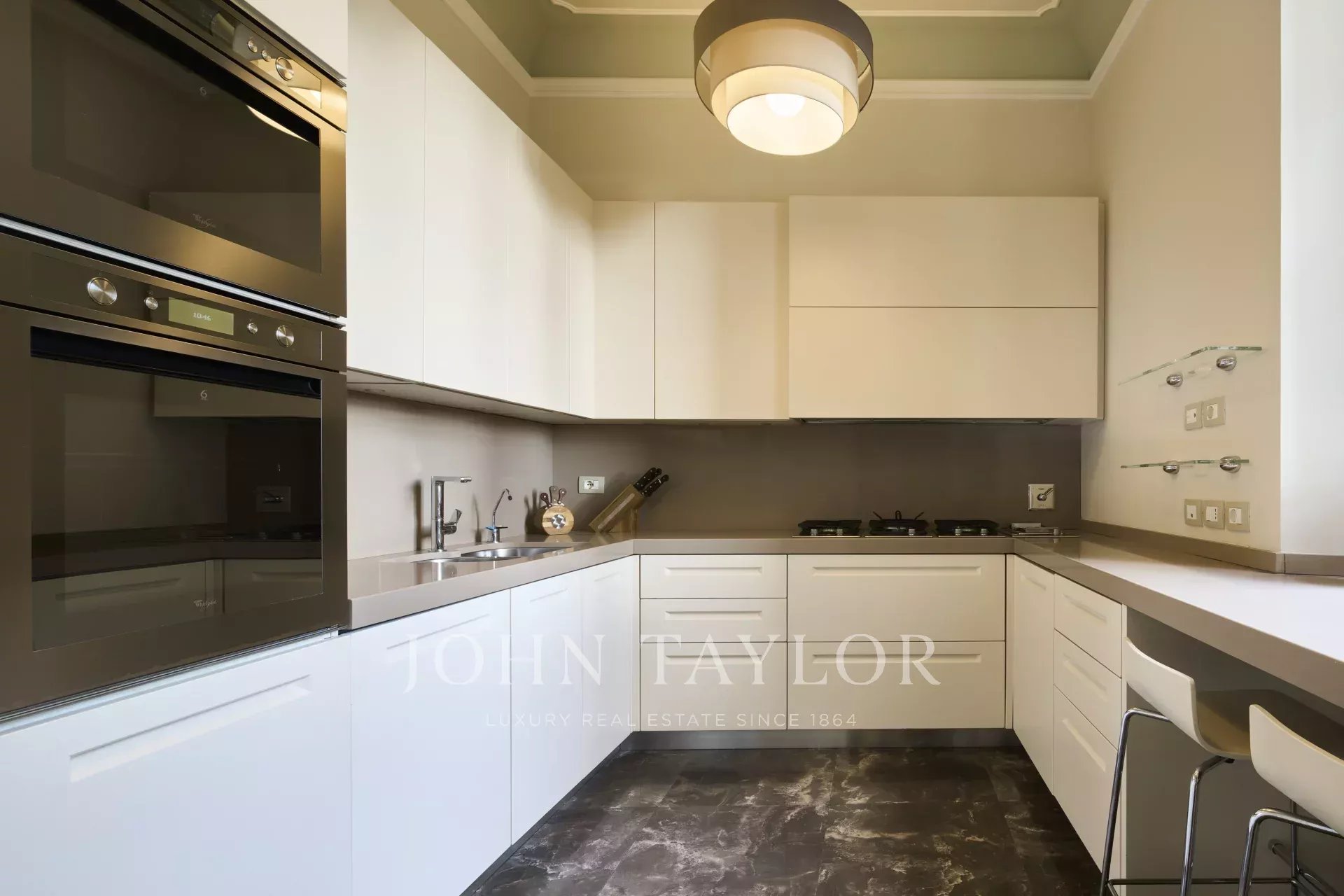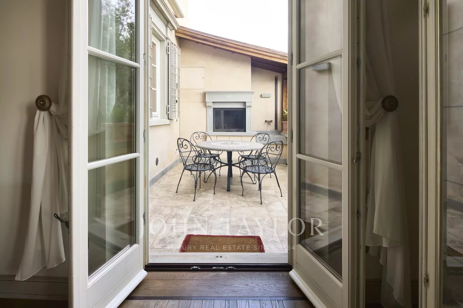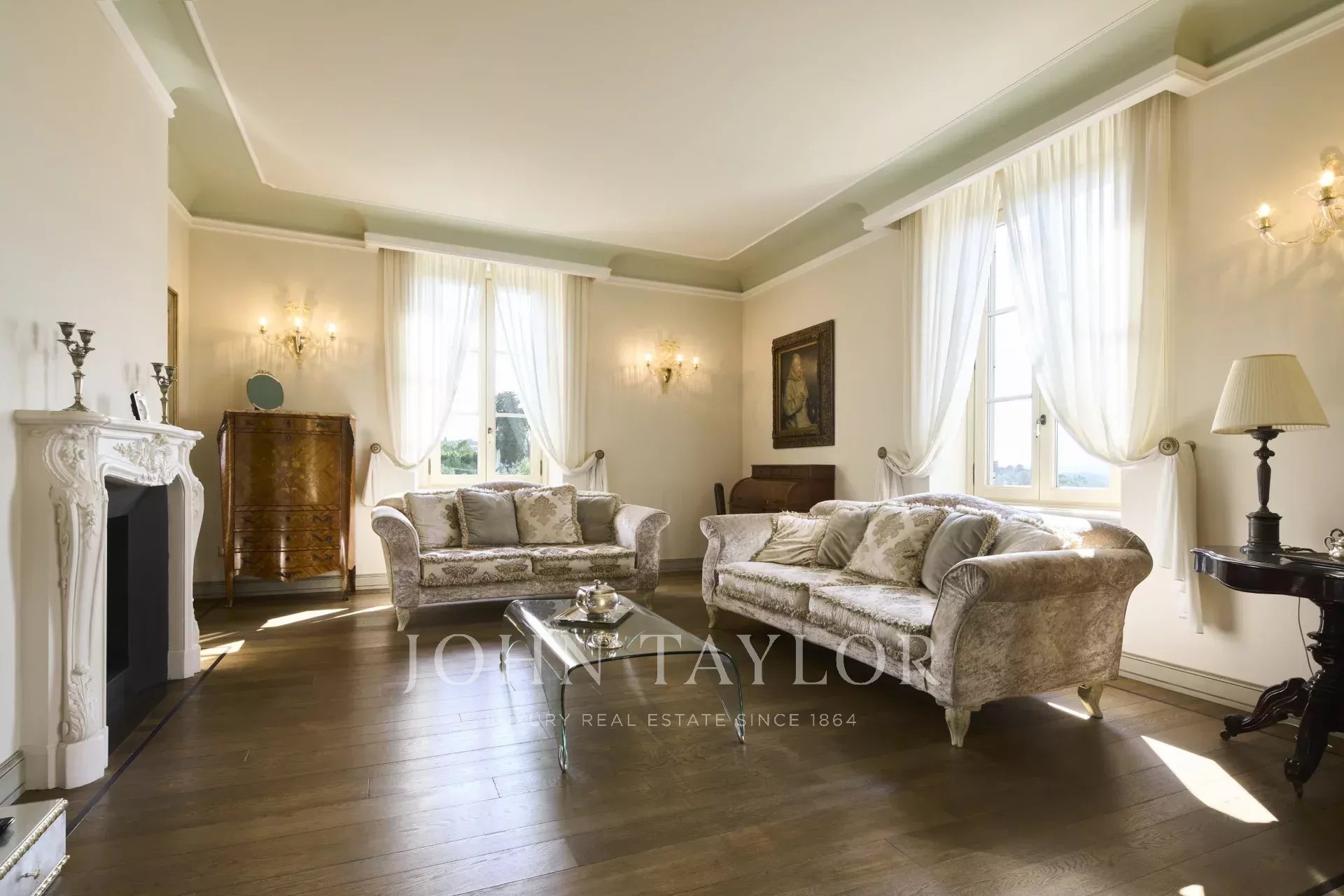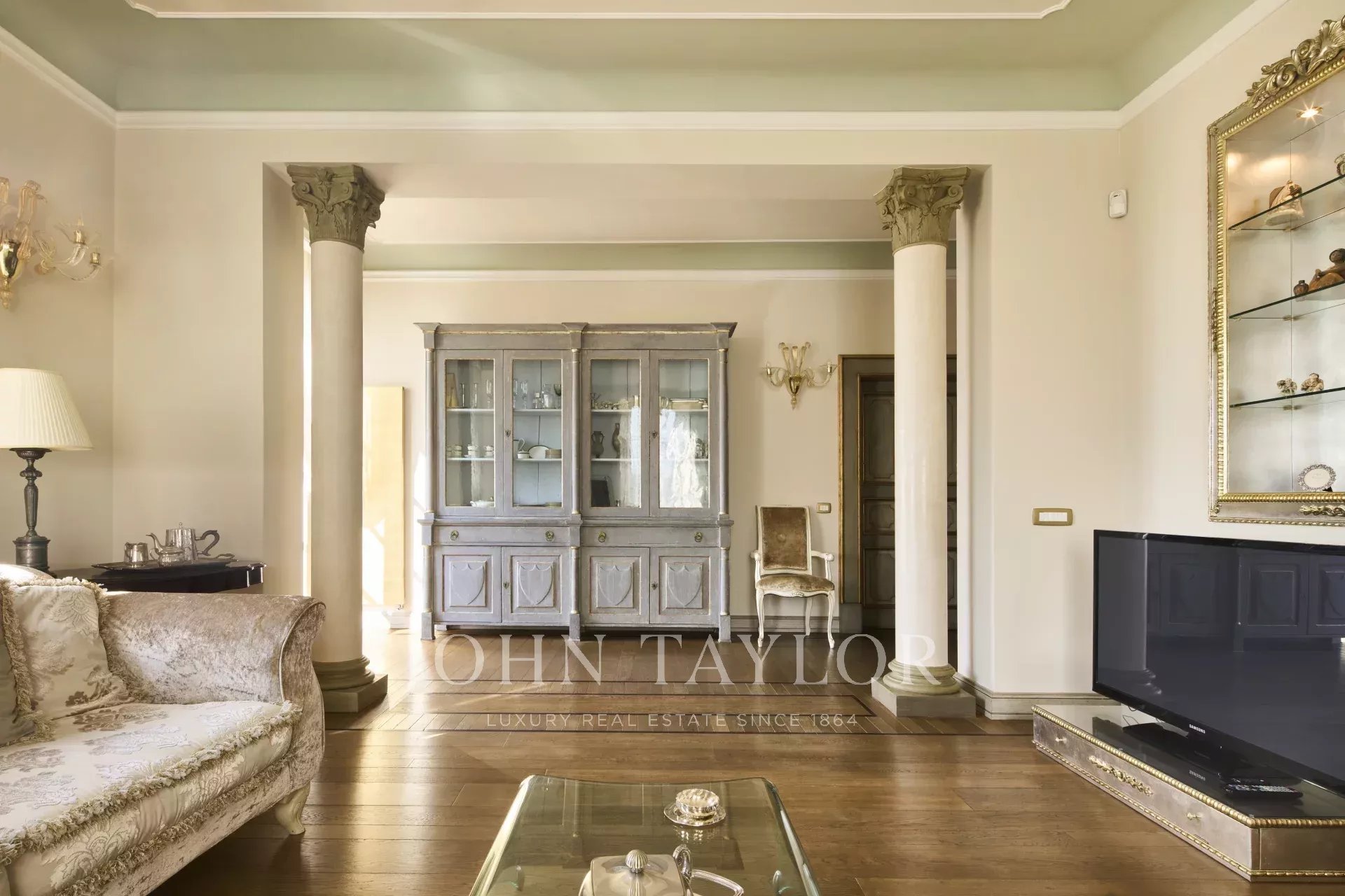 The property also includes a lift, internal access to the garage, and private garden terraces. Set within a 20,000 sqm fenced and video-guarded estate, this apartment combines historical charm with modern comforts.