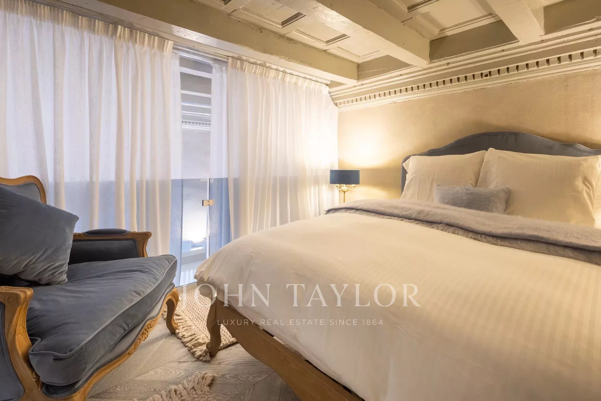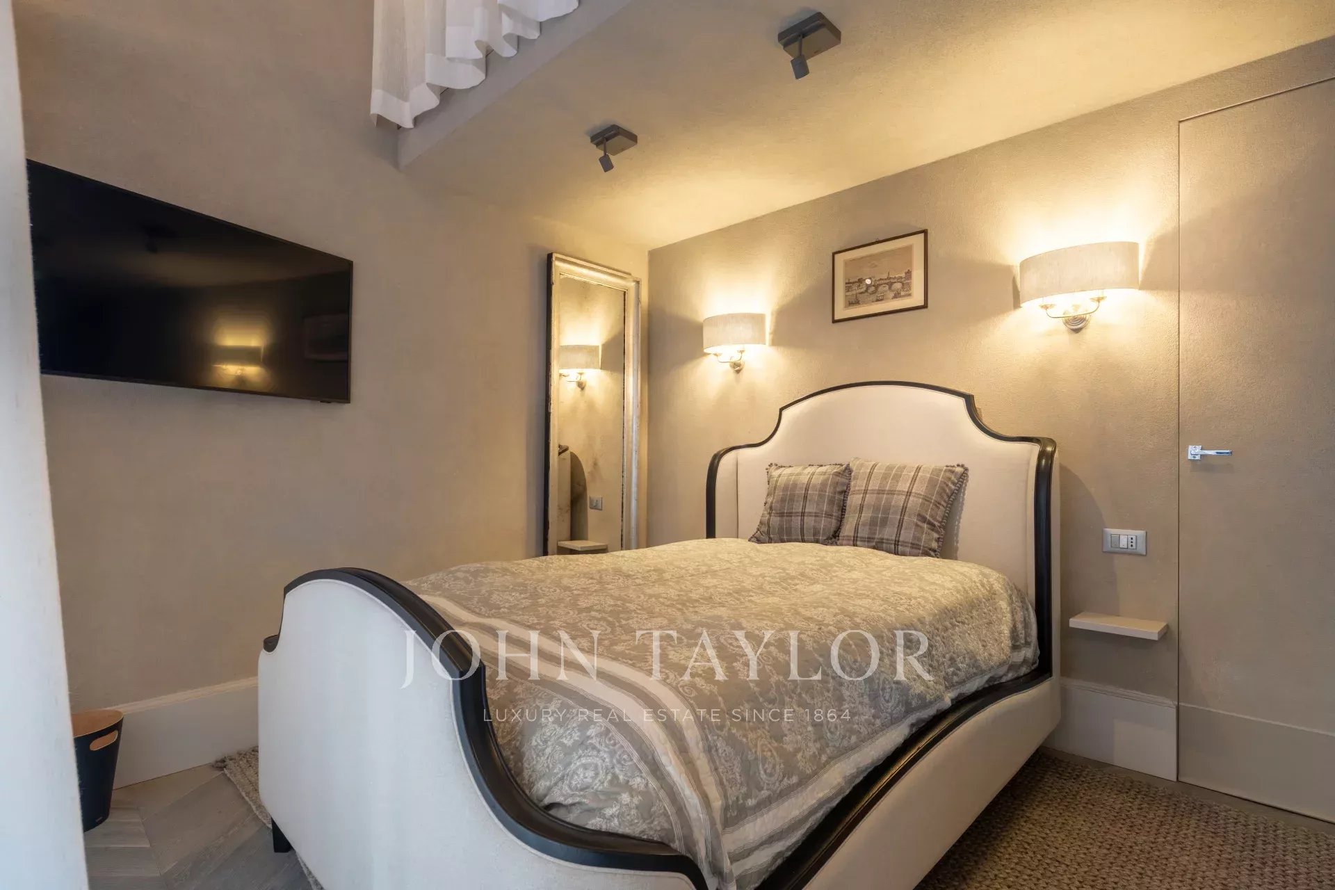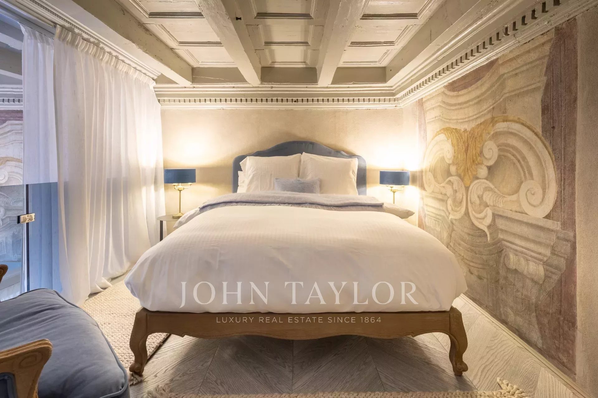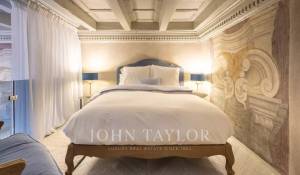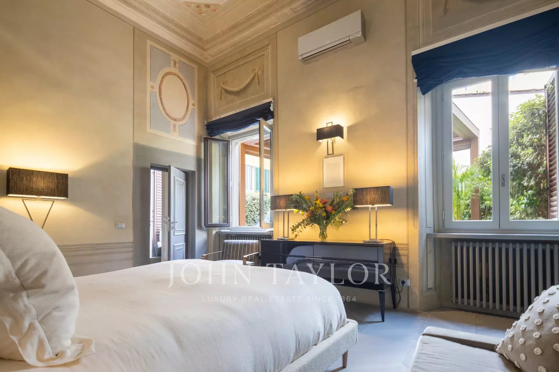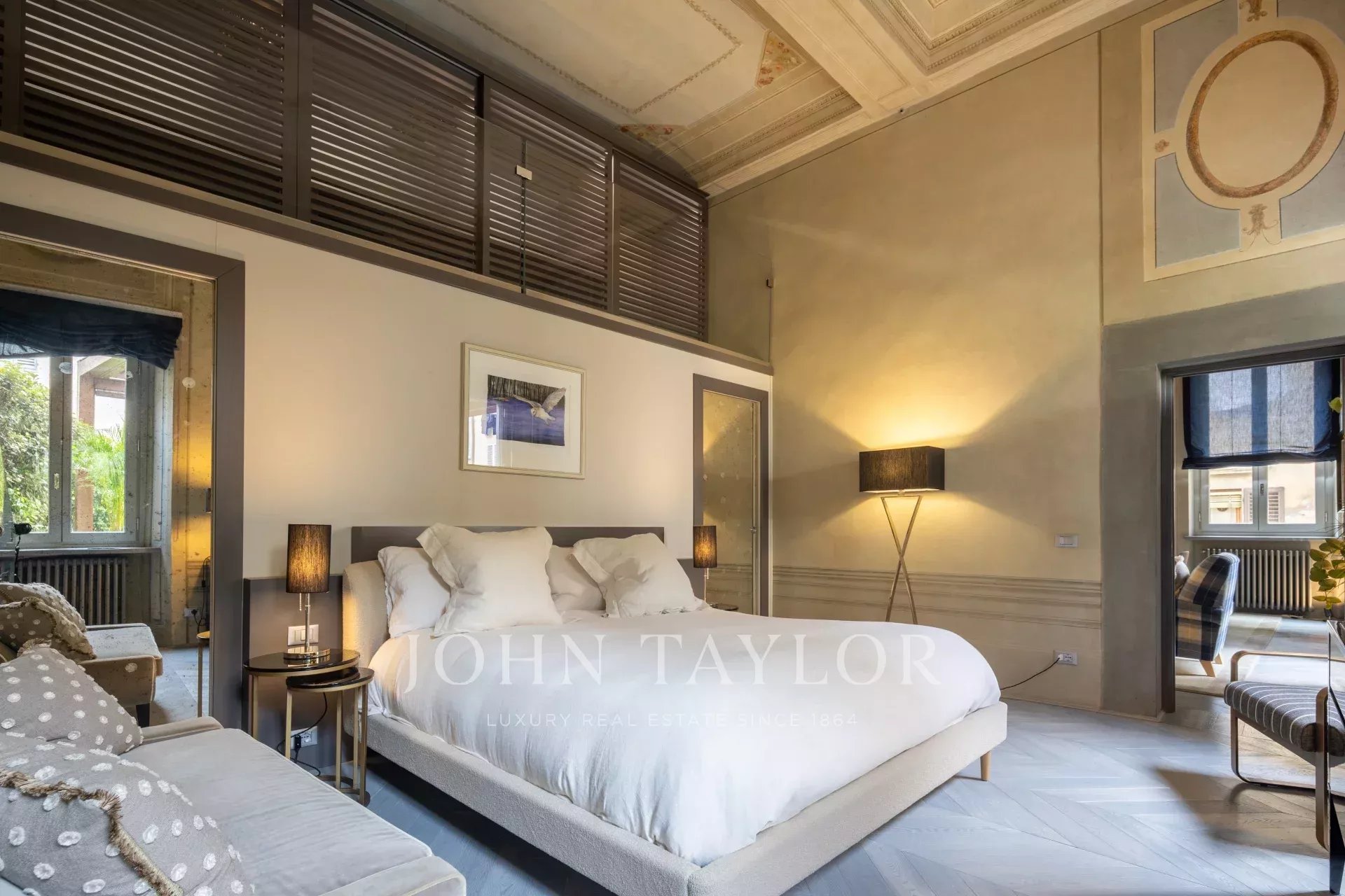 The apartment features a spacious master bedroom, elegantly adorned with double windows and frescoes.