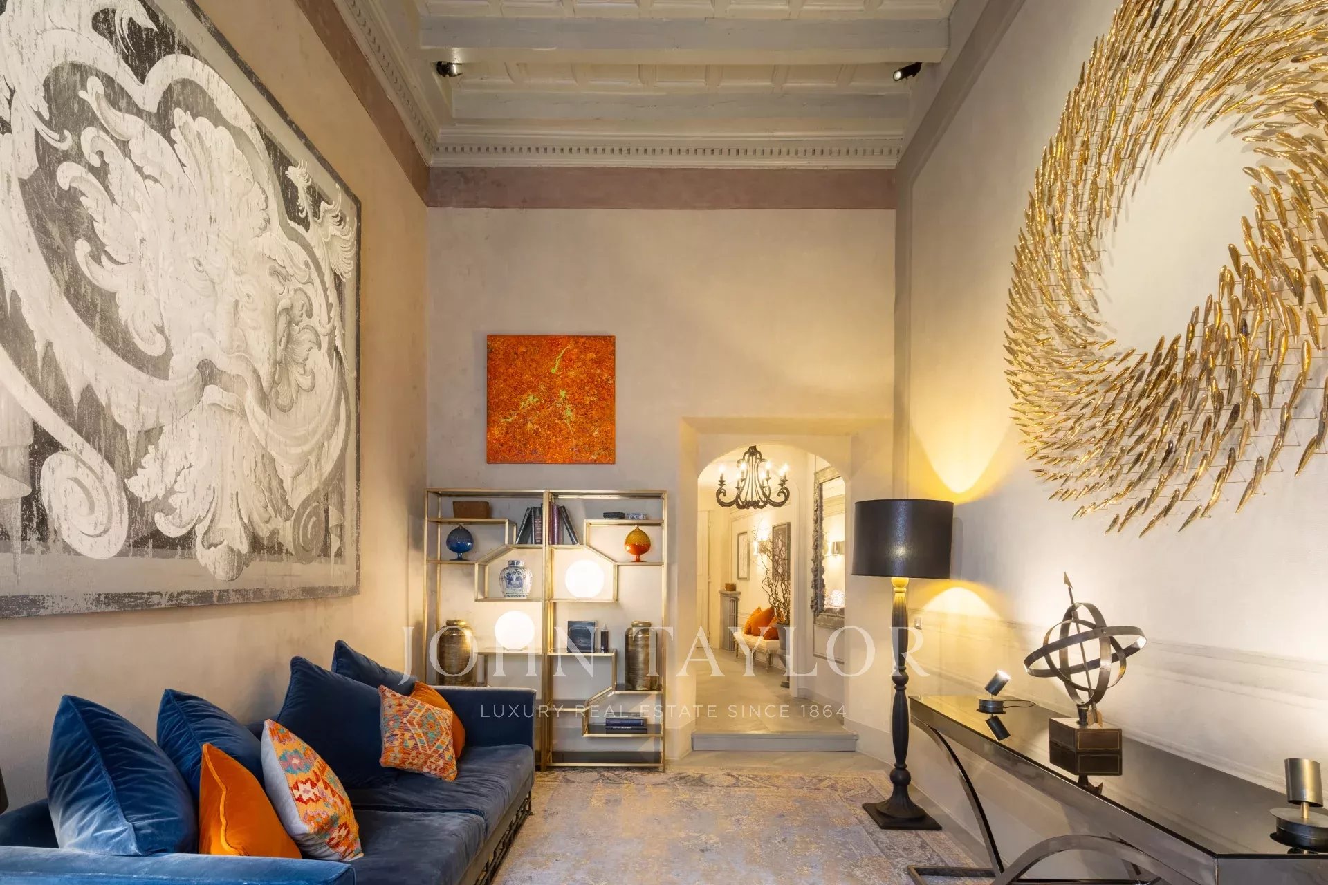 The grand entrance welcomes you with a decorated ceiling, leading to an expansive living room with high coffered ceilings and frescoes. The main living area seamlessly combines an open-plan living and dining space with a fully equipped kitchen that features a central island.
