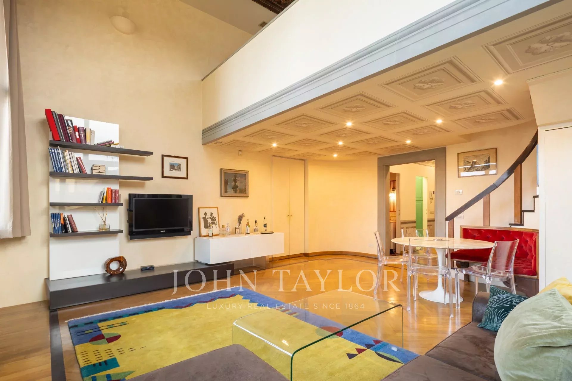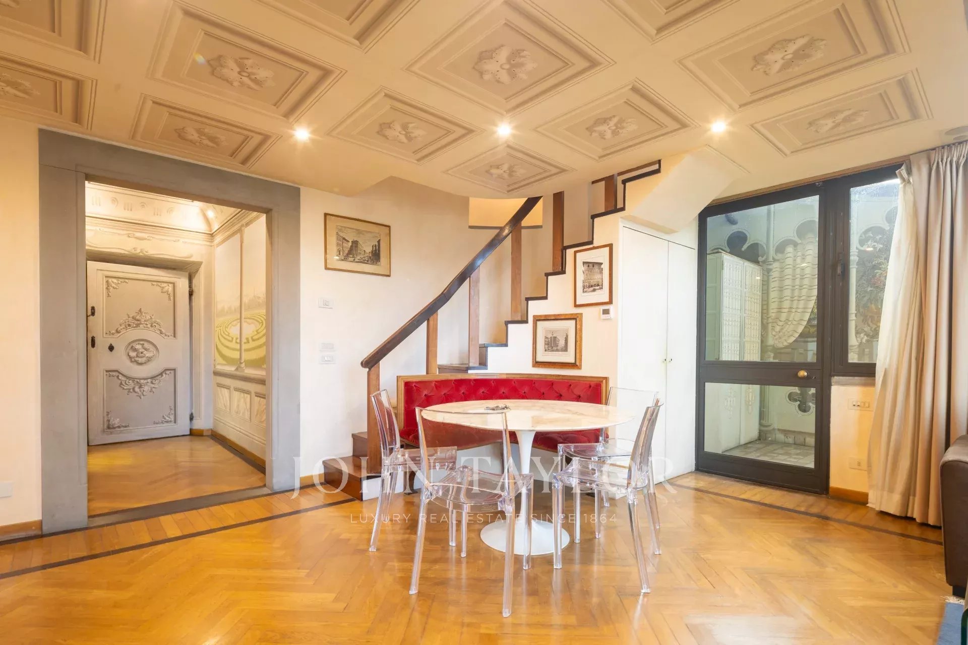 Located in a refined palazzo in the prestigious Tornabuoni street, this third-floor apartment offers a bright, open layout with high-impact design features. Floor-to-ceiling windows flood the space with natural light, while original coffered ceilings add historic character.