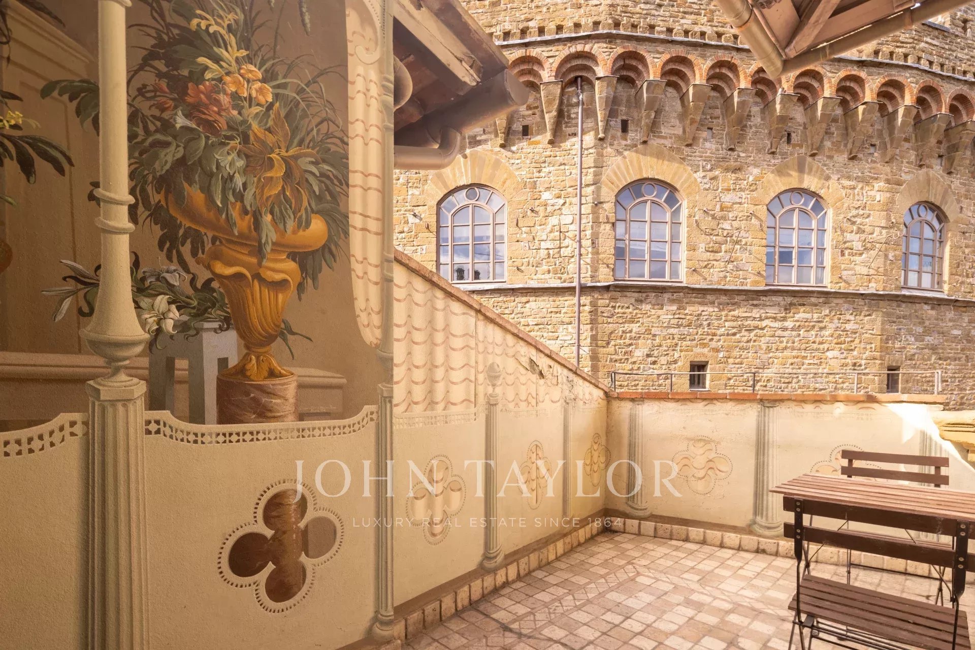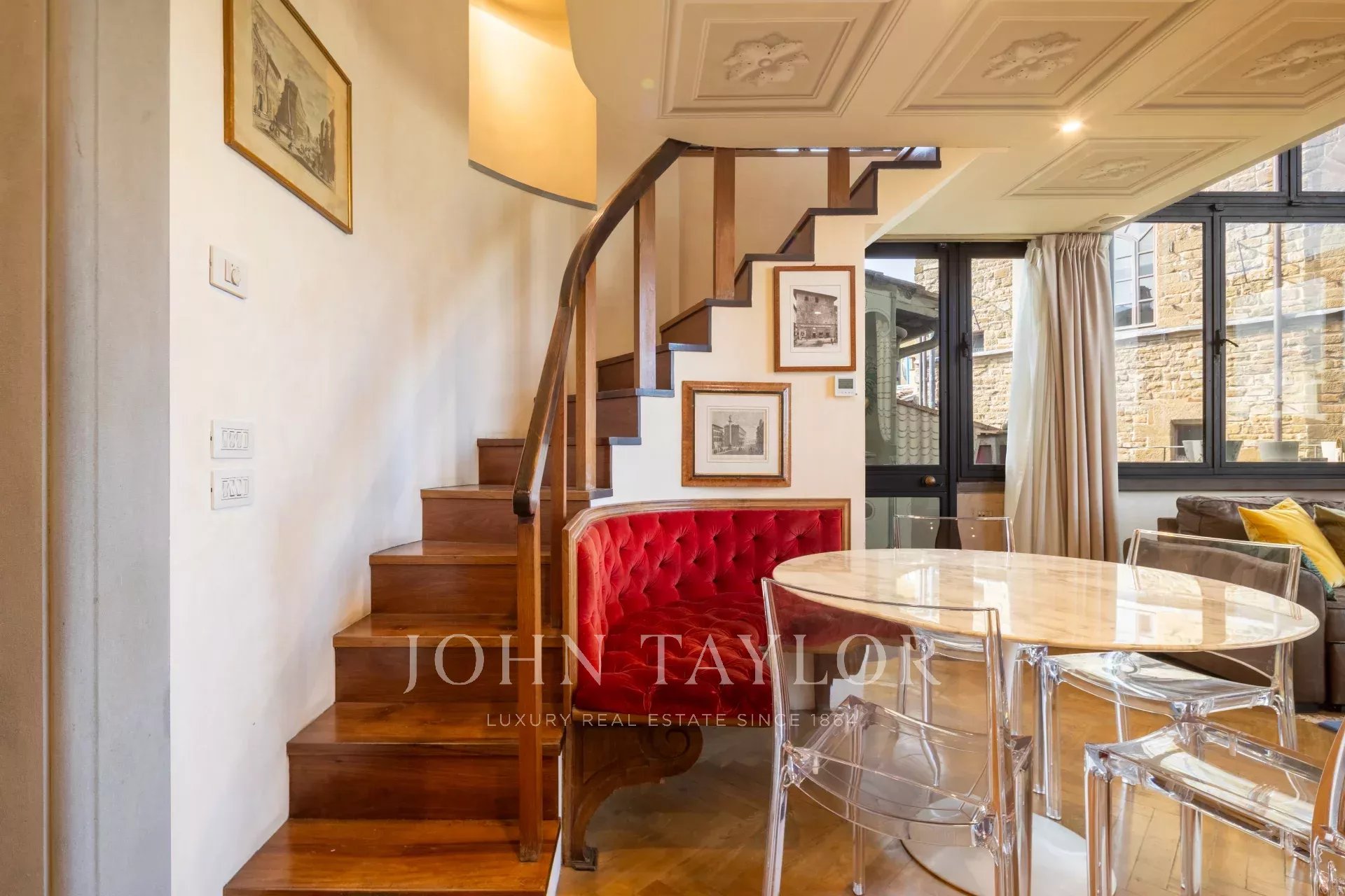 The apartment includes a mezzanine-level bedroom, one bathroom, and an open-plan living and dining area. A private terrace offers panoramic views over Florence, perfect for relaxing or entertaining.