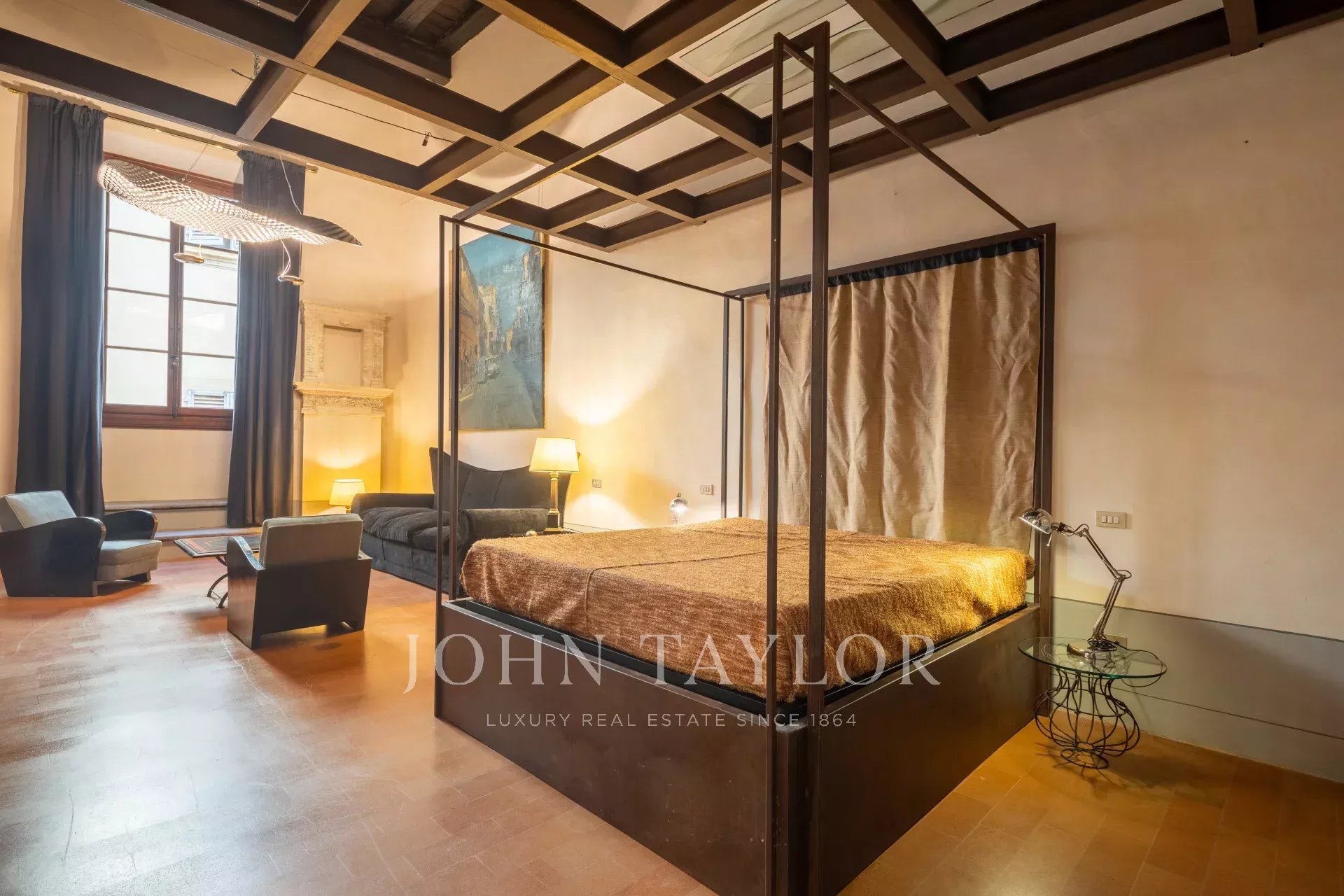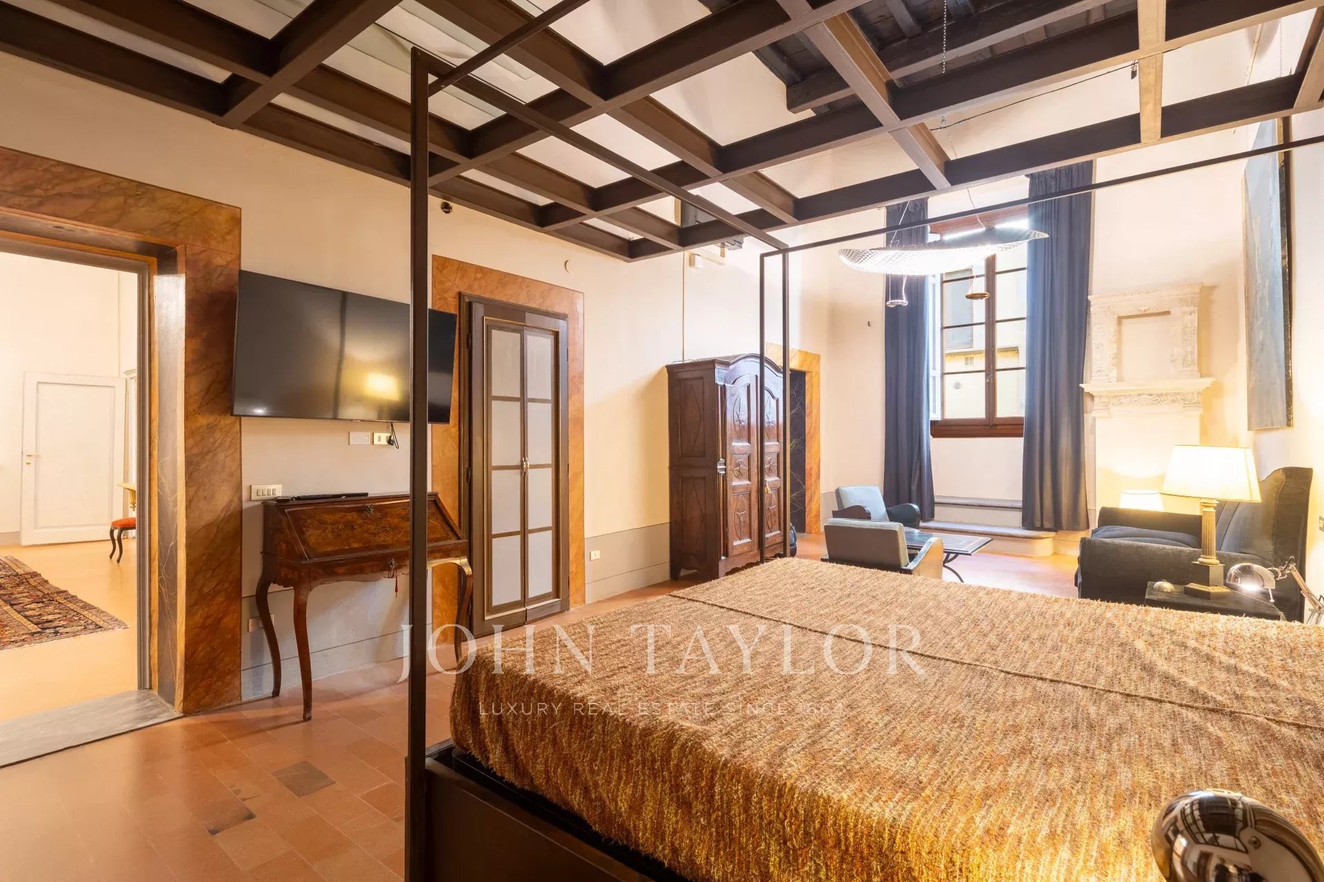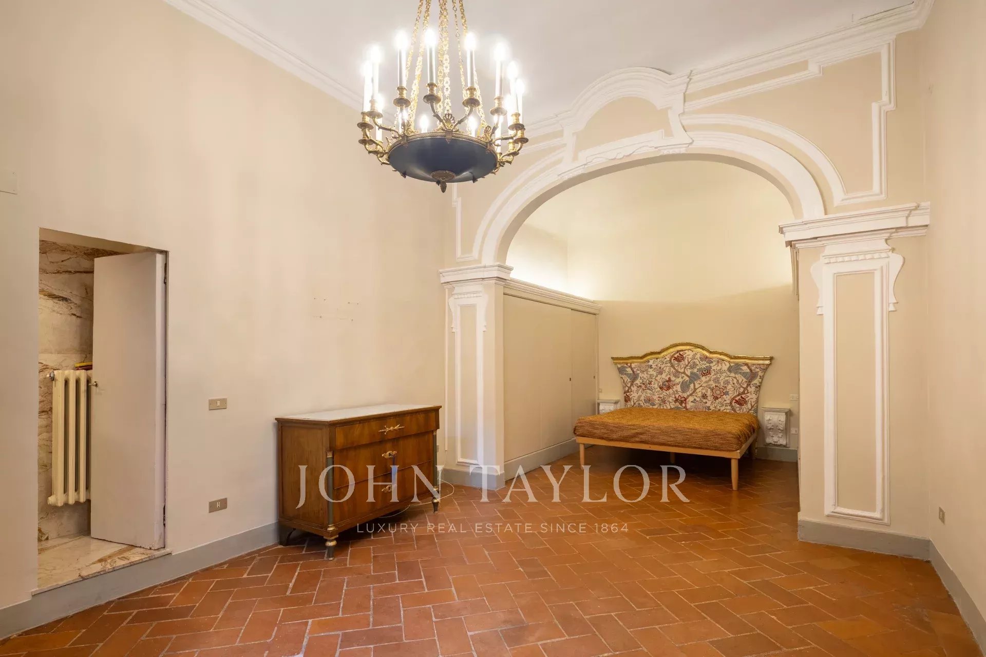 The apartment, partially furnished, is fully air-conditioned, and consists of a large reception hall from which one enters a spacious a living room with an antique fireplace and overlooking a courtyard, the dining room has large windows overlooking Via Santo Spirito.