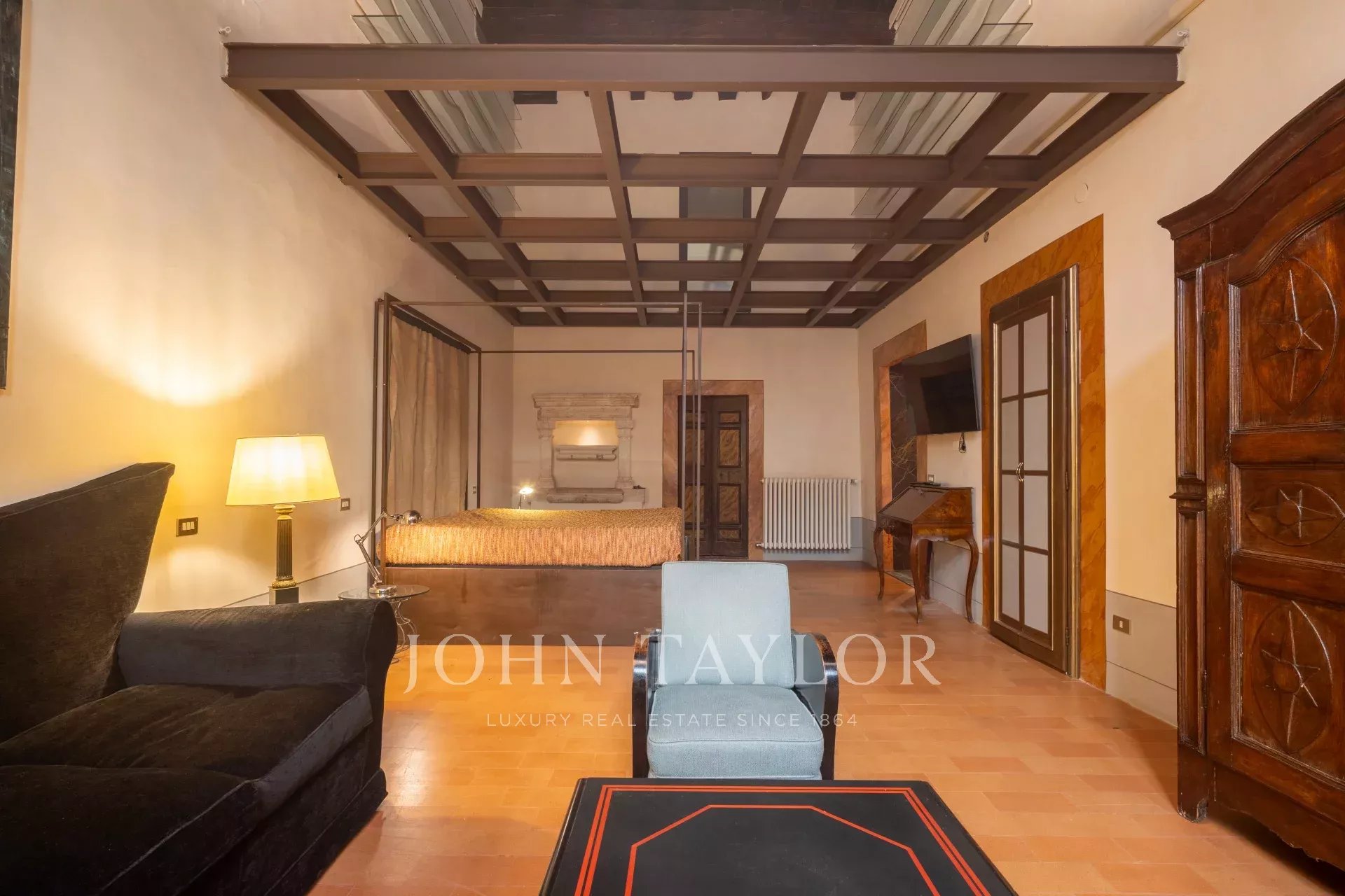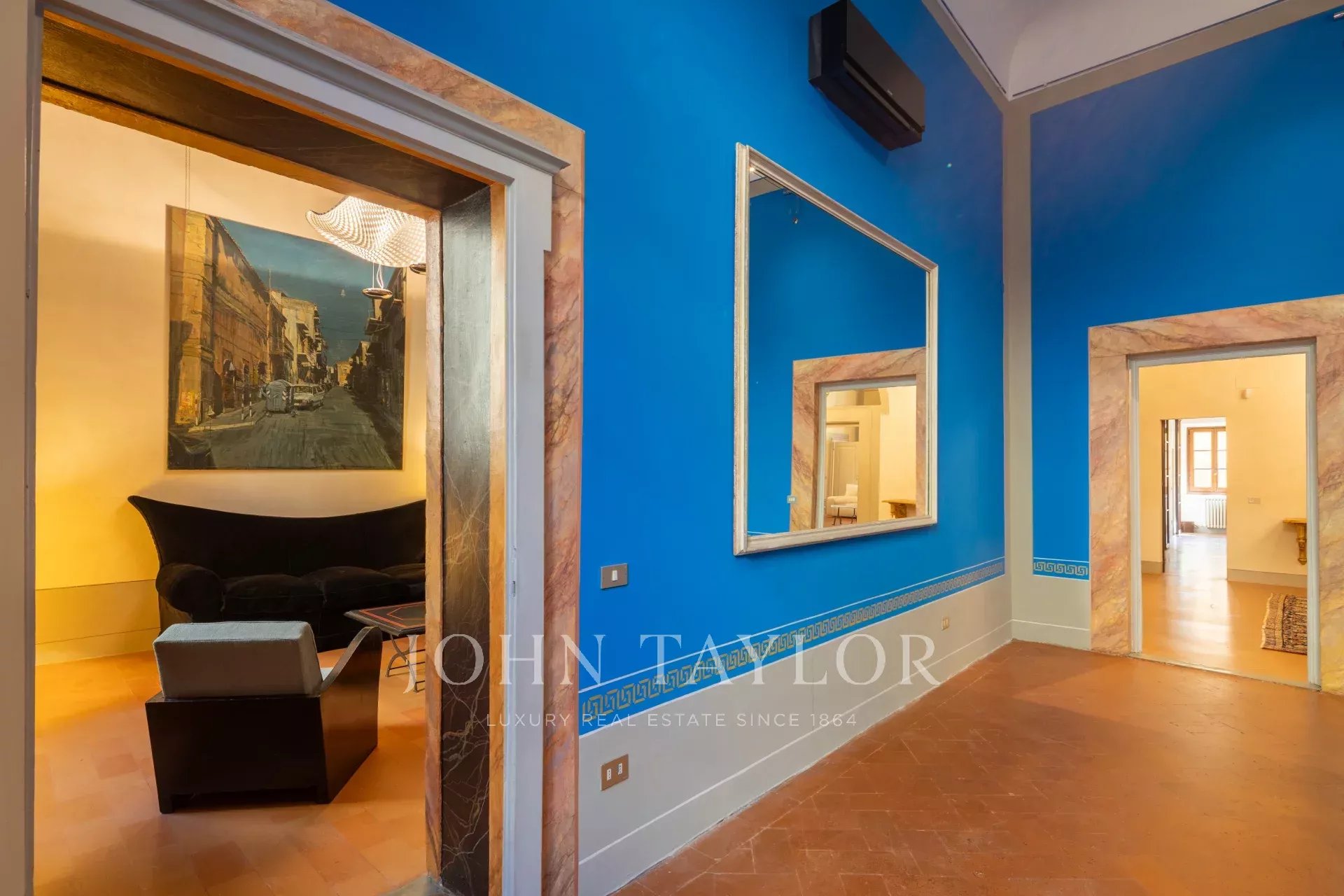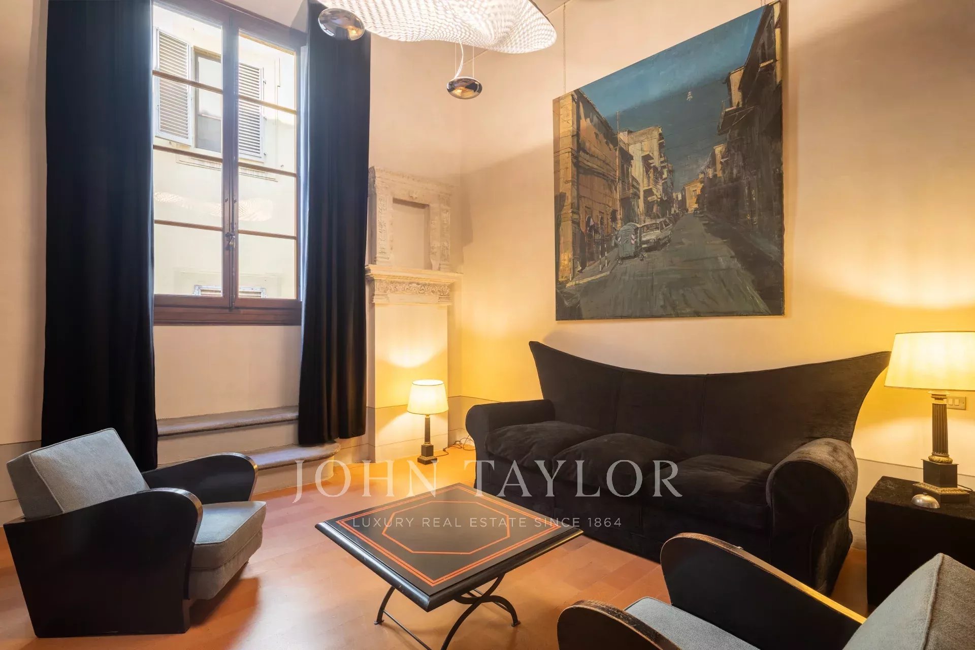 The apartment, partially furnished, is fully air-conditioned, and consists of a large reception hall from which one enters a spacious a living room with an antique fireplace and overlooking a courtyard, the dining room has large windows overlooking Via Santo Spirito.
