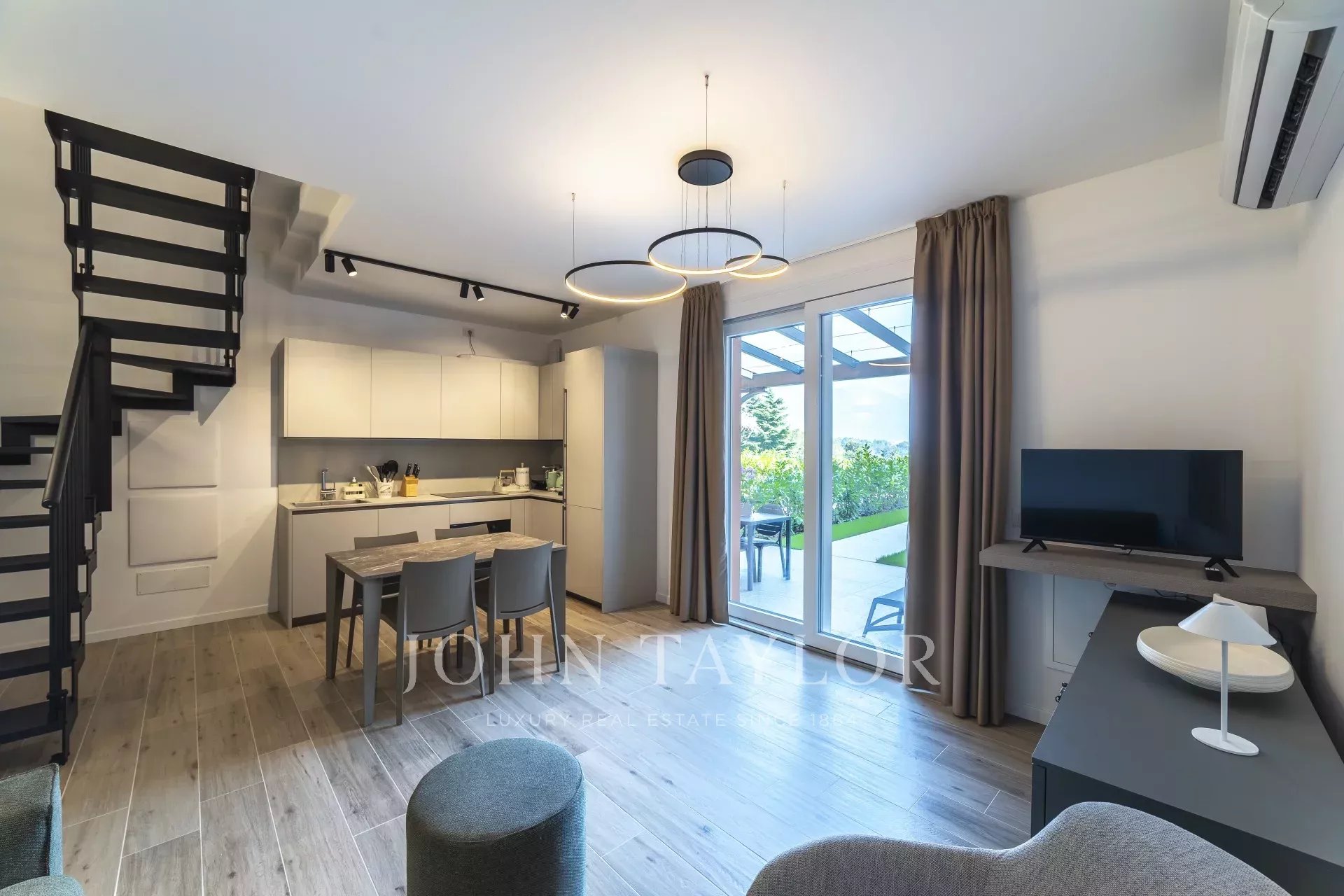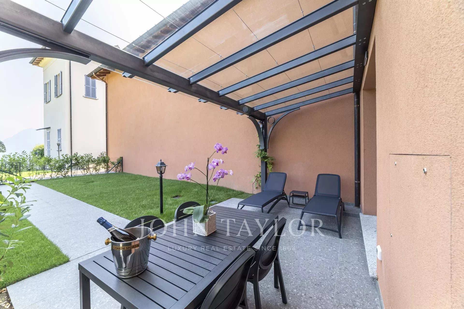 New Panoramic Area in an elegant complex resulting from a refined restoration of a historic residence immersed in greenery, with swimming pool and tennis court, just a short distance from the historic center. Splendid lake view. Dwelling of approx. 100 sqm with independent entrance, composed of: large living room with kitchen area, double bedroom, and bathroom. The property is completed by a well-kept, planted and furnished private garden, cellar, and exclusive parking space. Equipped with every comfort and cutting-edge technology. Class A.