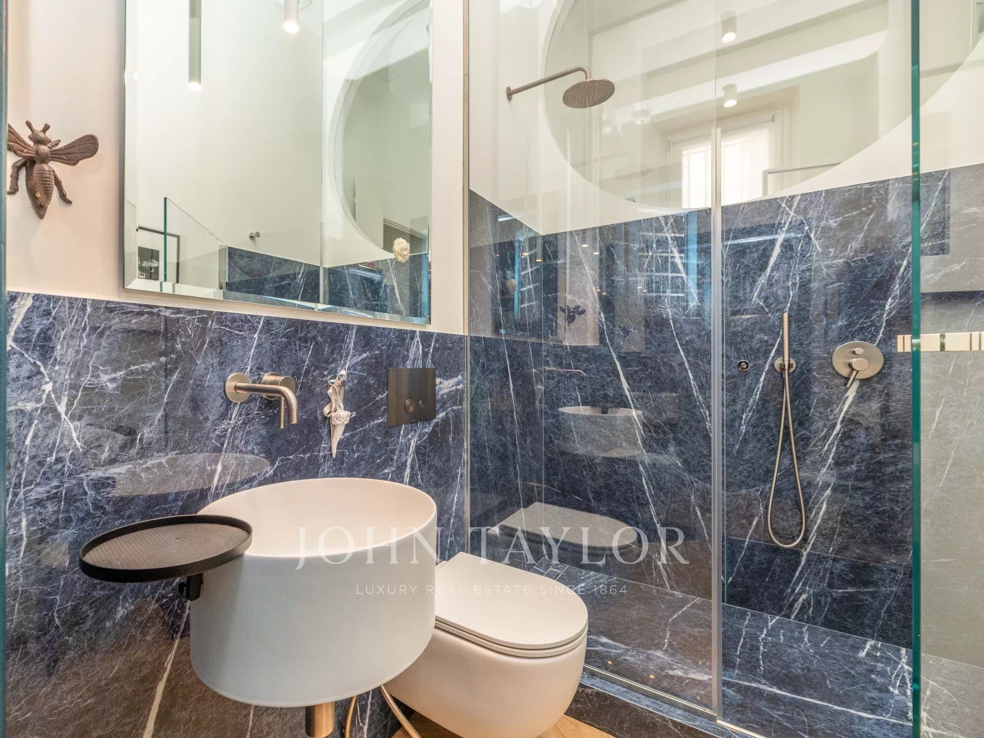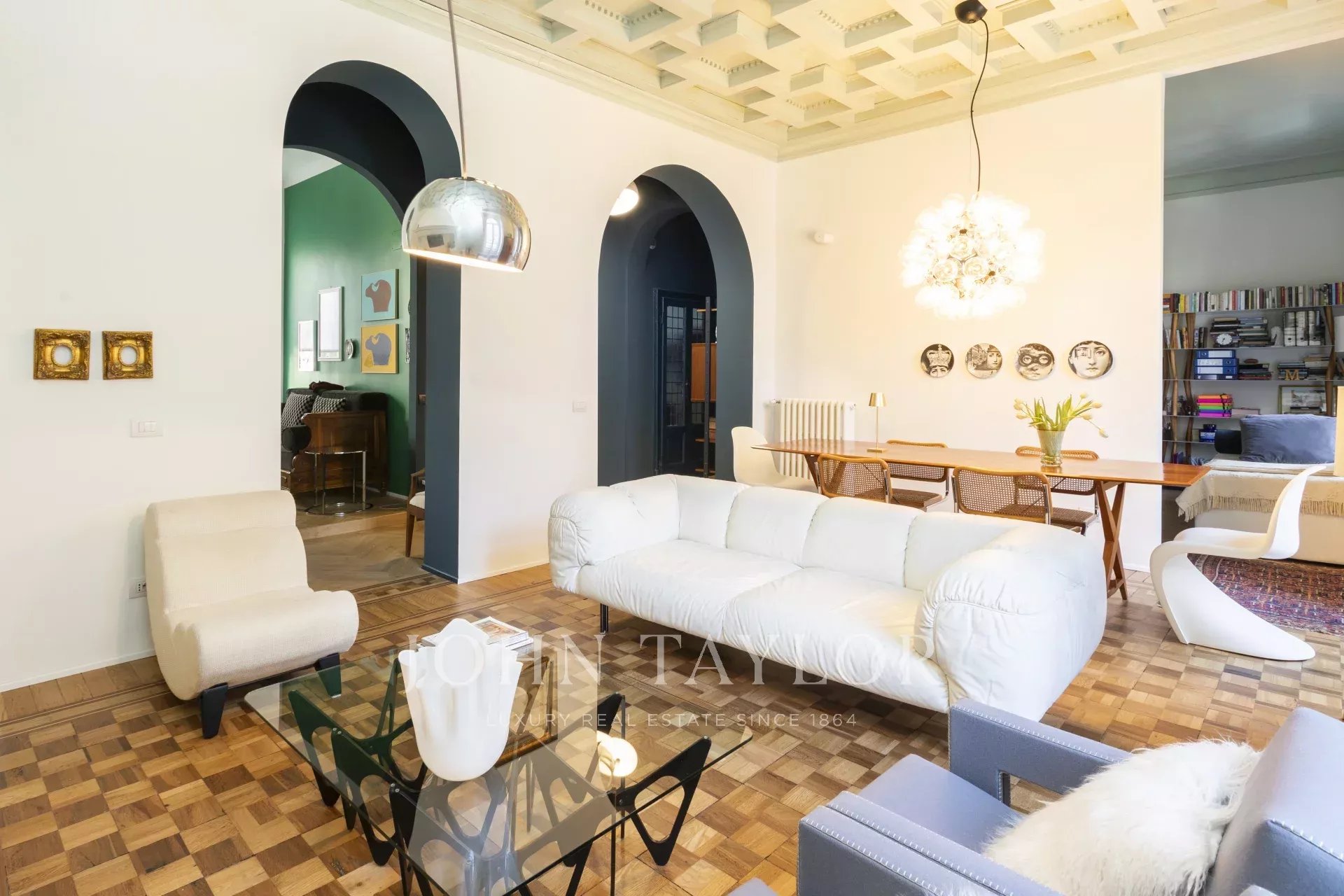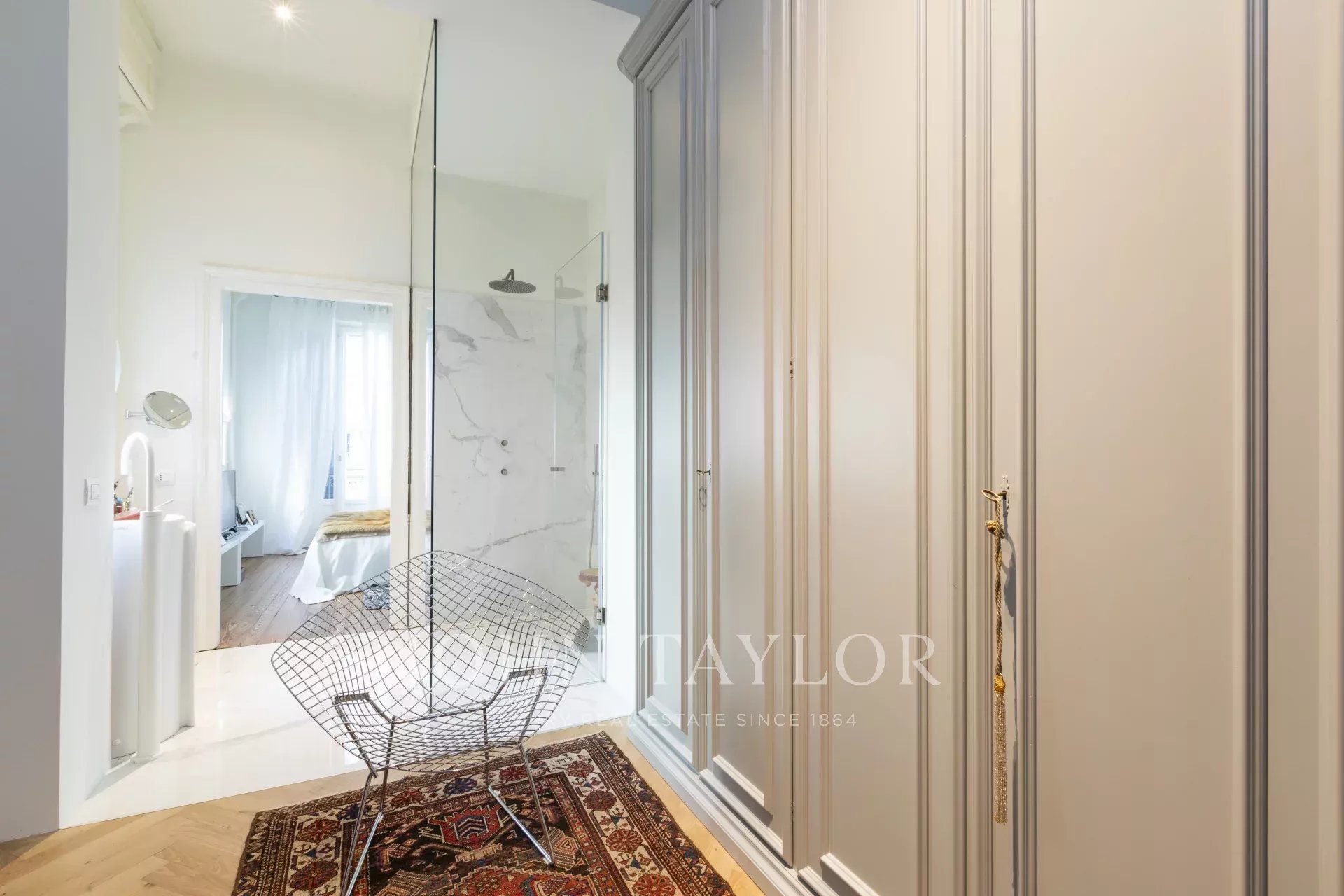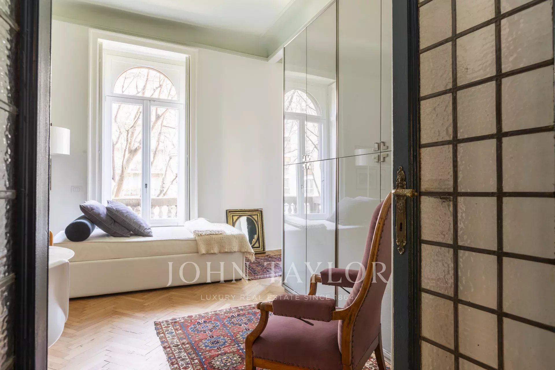 Rich in contemporary decorative elements. Tha apartment is of 160 sqm, exceptionally bright and quiet with a spacious entrance, a triple living room opening onto a characteristic balcony, a large kitchen, and a night area with two double bedrooms, including a master suite. The suite boasts an expansive dressing room with a vanity area, and two exquisite bathrooms. The property retains precious period details while offering an excellent interior layout, blending historical charm with a refined contemporary atmosphere. Equipped with the newset technology and state-of-the-art systems, the apartment is fully furnished with exclusive custom-made furniture and renowned contemporary design pieces and high-level finishes throughout. € 1,650,000.00