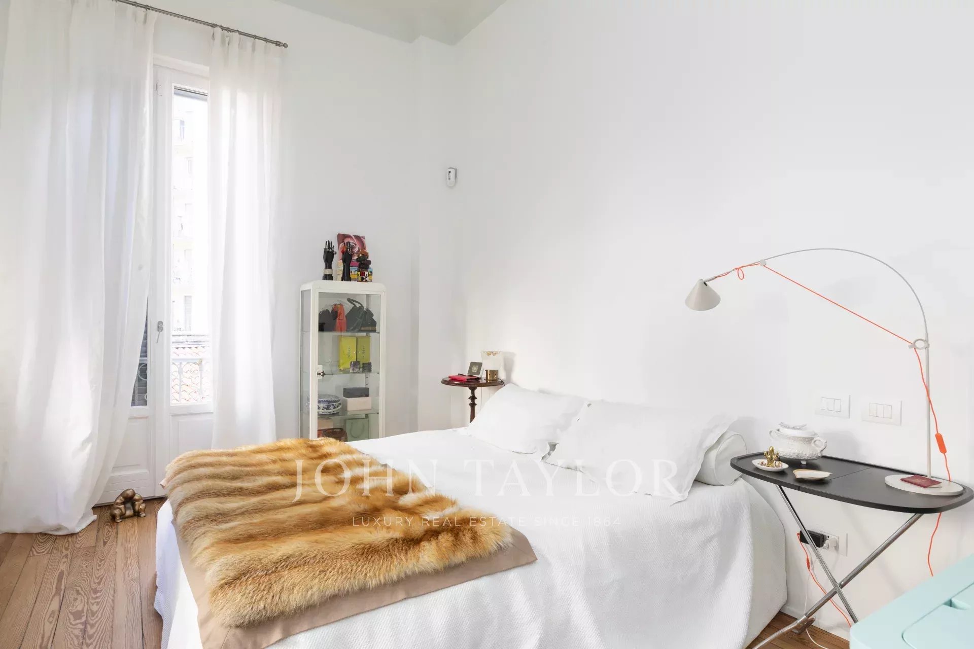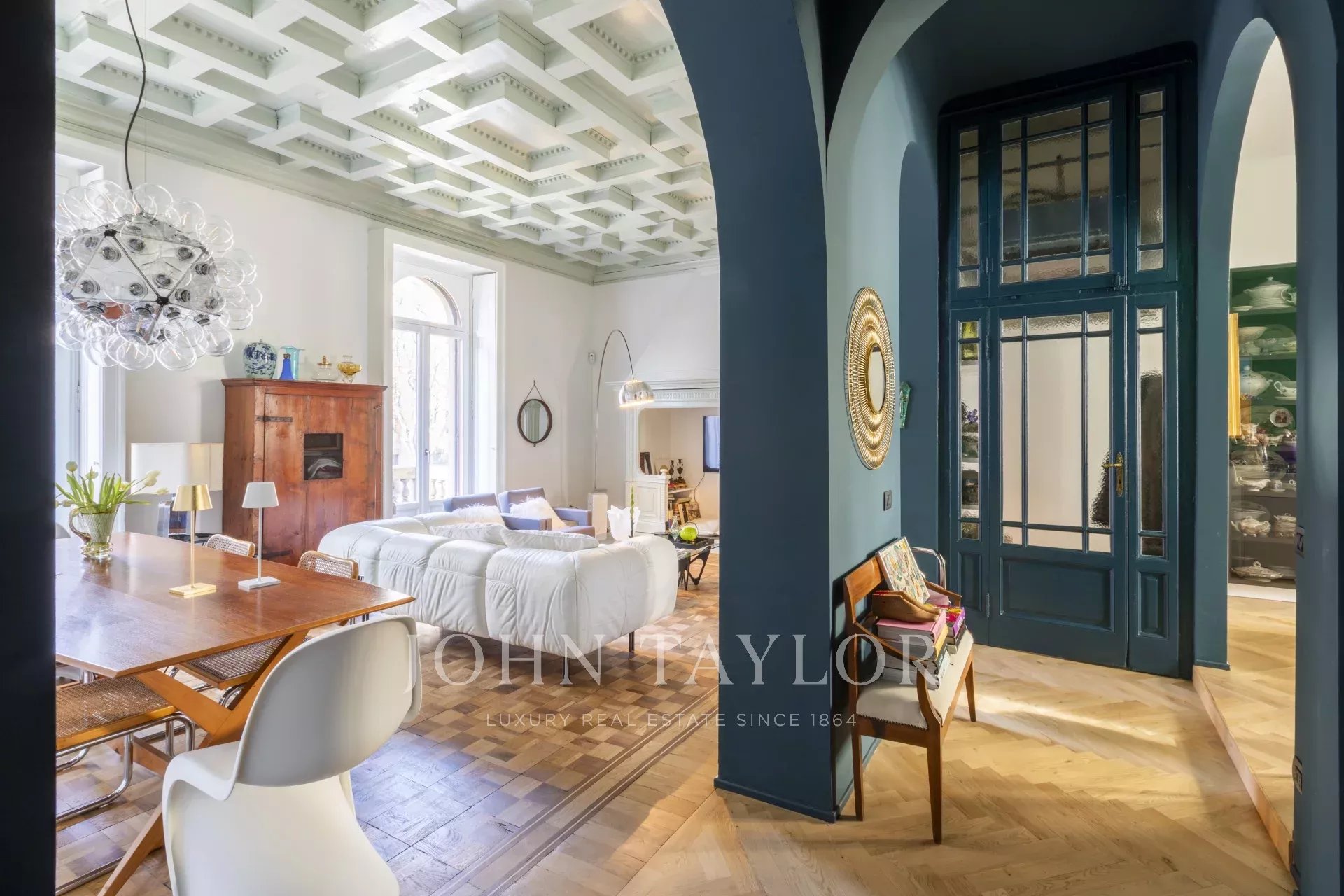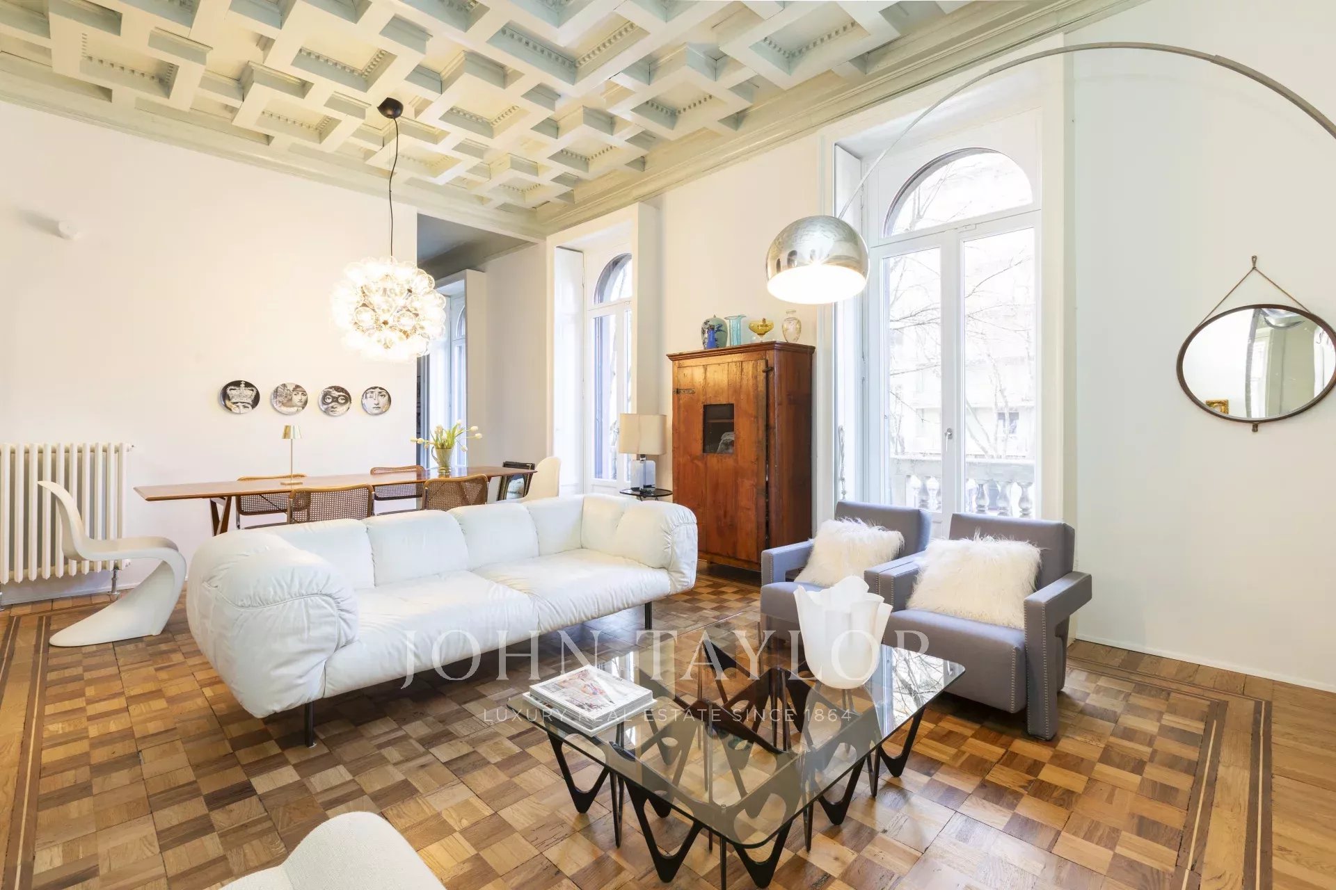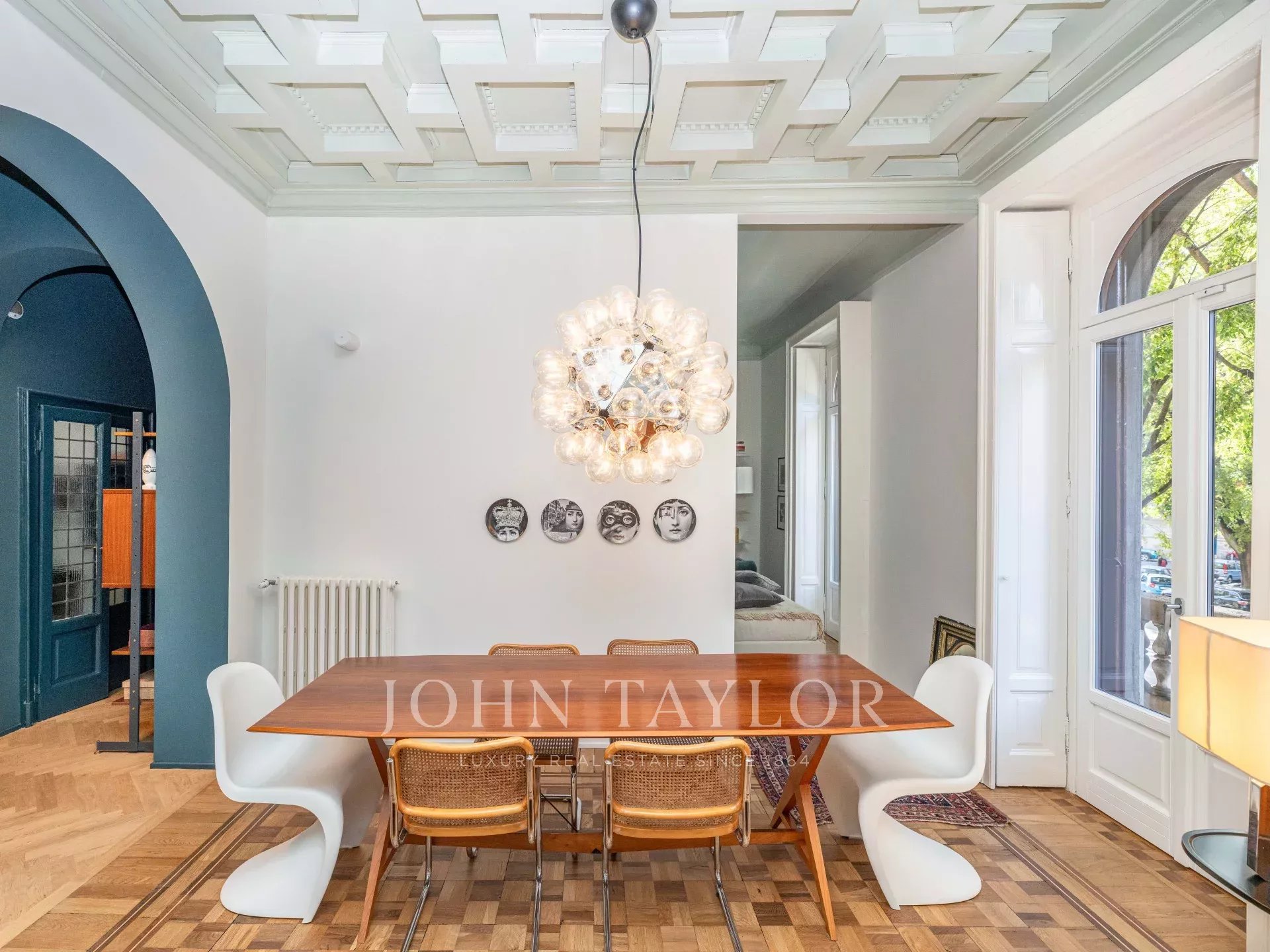 Rich in contemporary decorative elements. Tha apartment is of 160 sqm, exceptionally bright and quiet with a spacious entrance, a triple living room opening onto a characteristic balcony, a large kitchen, and a night area with two double bedrooms, including a master suite. The suite boasts an expansive dressing room with a vanity area, and two exquisite bathrooms. The property retains precious period details while offering an excellent interior layout, blending historical charm with a refined contemporary atmosphere. Equipped with the newset technology and state-of-the-art systems, the apartment is fully furnished with exclusive custom-made furniture and renowned contemporary design pieces and high-level finishes throughout. € 1,650,000.00