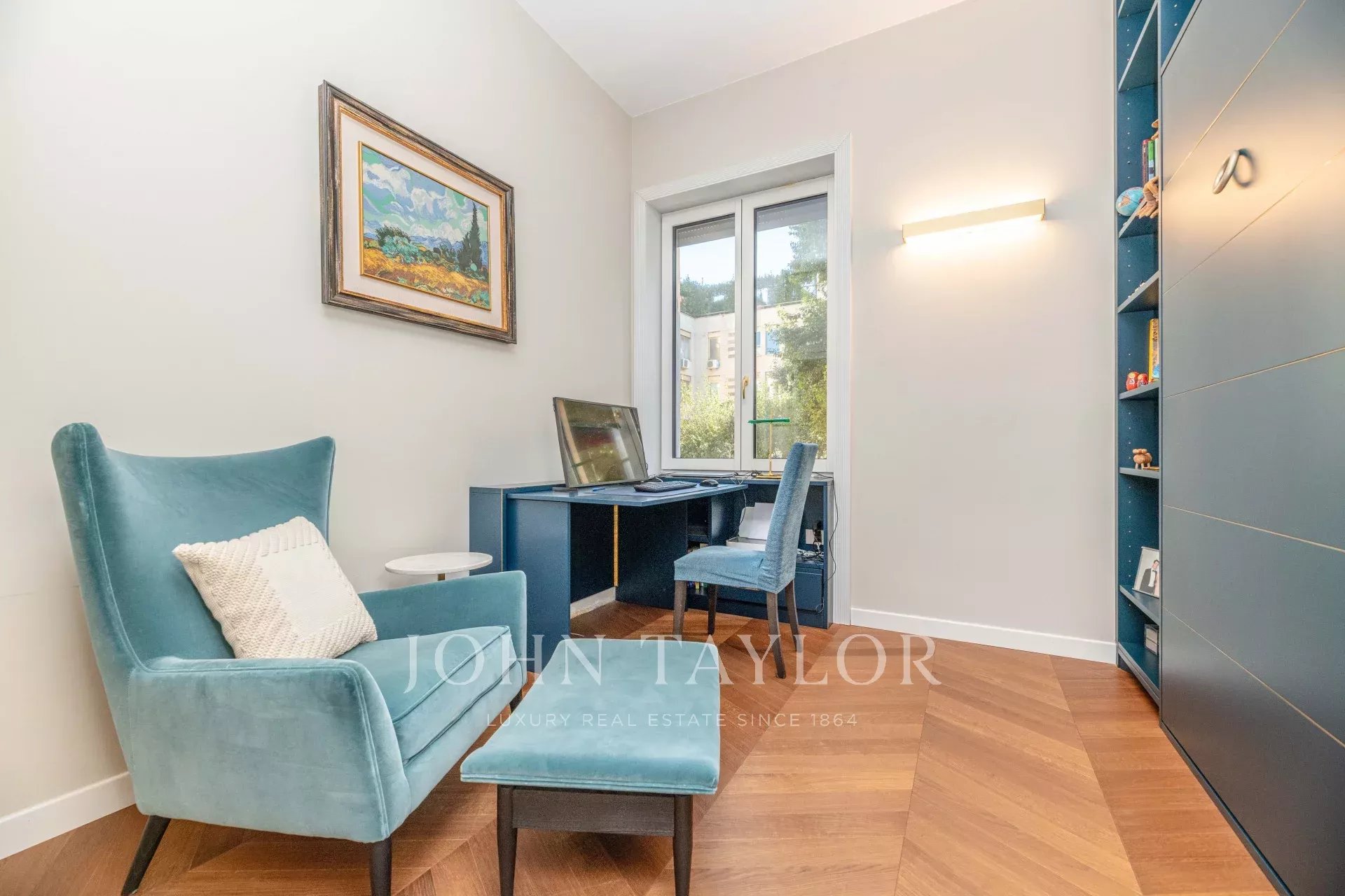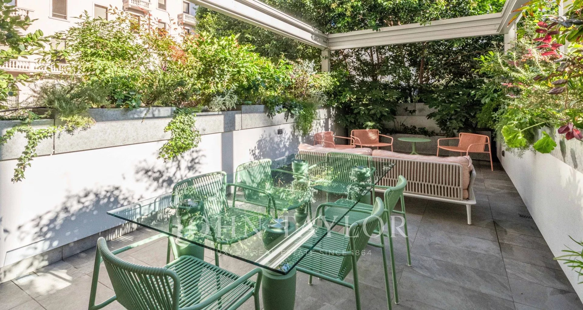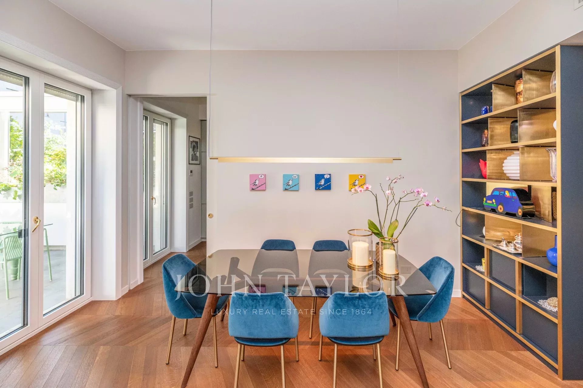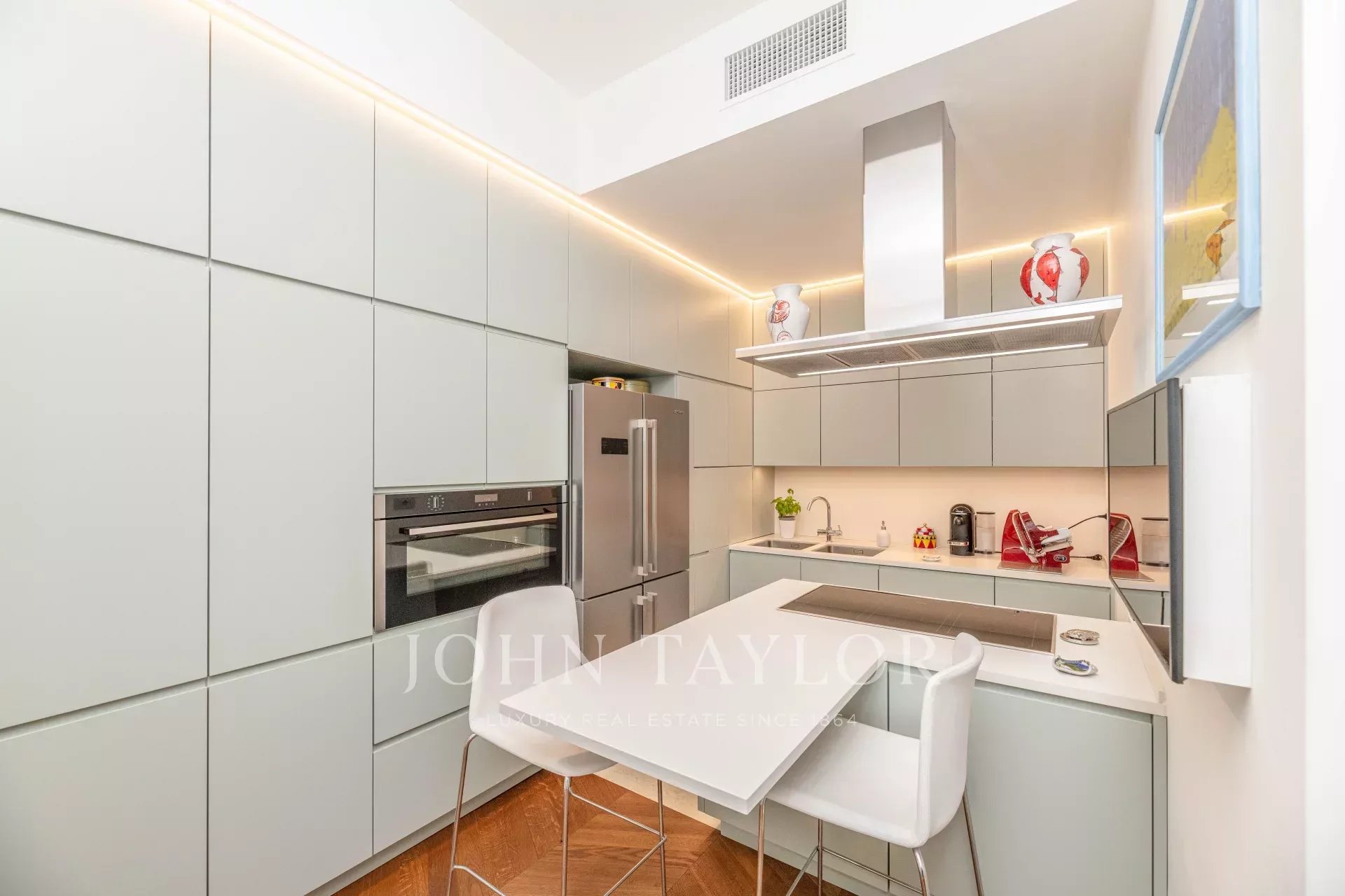 NEW in an exclusive context, prestigious building with full time concierge and video surveillance, splendid, highly presentable apartment of approx. 160 sqm., very bright and quiet, of great charm, with two entrances, elegant living area, very versatile environment, project by a well-known Milanese studio of architecture, with double living room with dining room overlooking spacious terrace with exclusive furnishings and fully planted and habitable kitchen. Sleeping area with large master suite, vast wardrobe room, another spacious bedroom with study area, three precious bathrooms, storage closet. Large service area complete with laundry room with independent access; completely furnished with custom-made boiserie and designer furniture, finishes of the highest level. Latest technical equipment and systems. Possibility of parking space. Energy class F