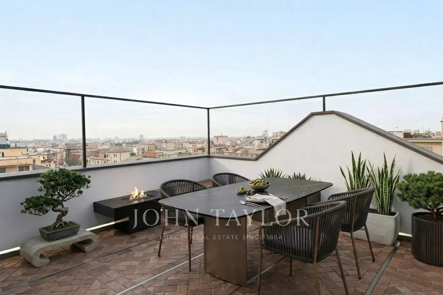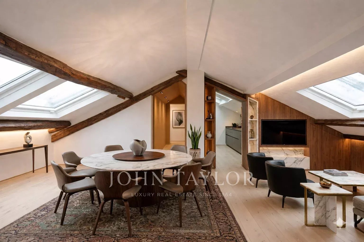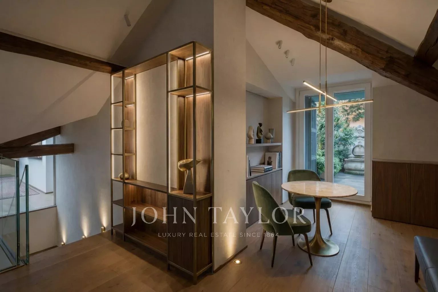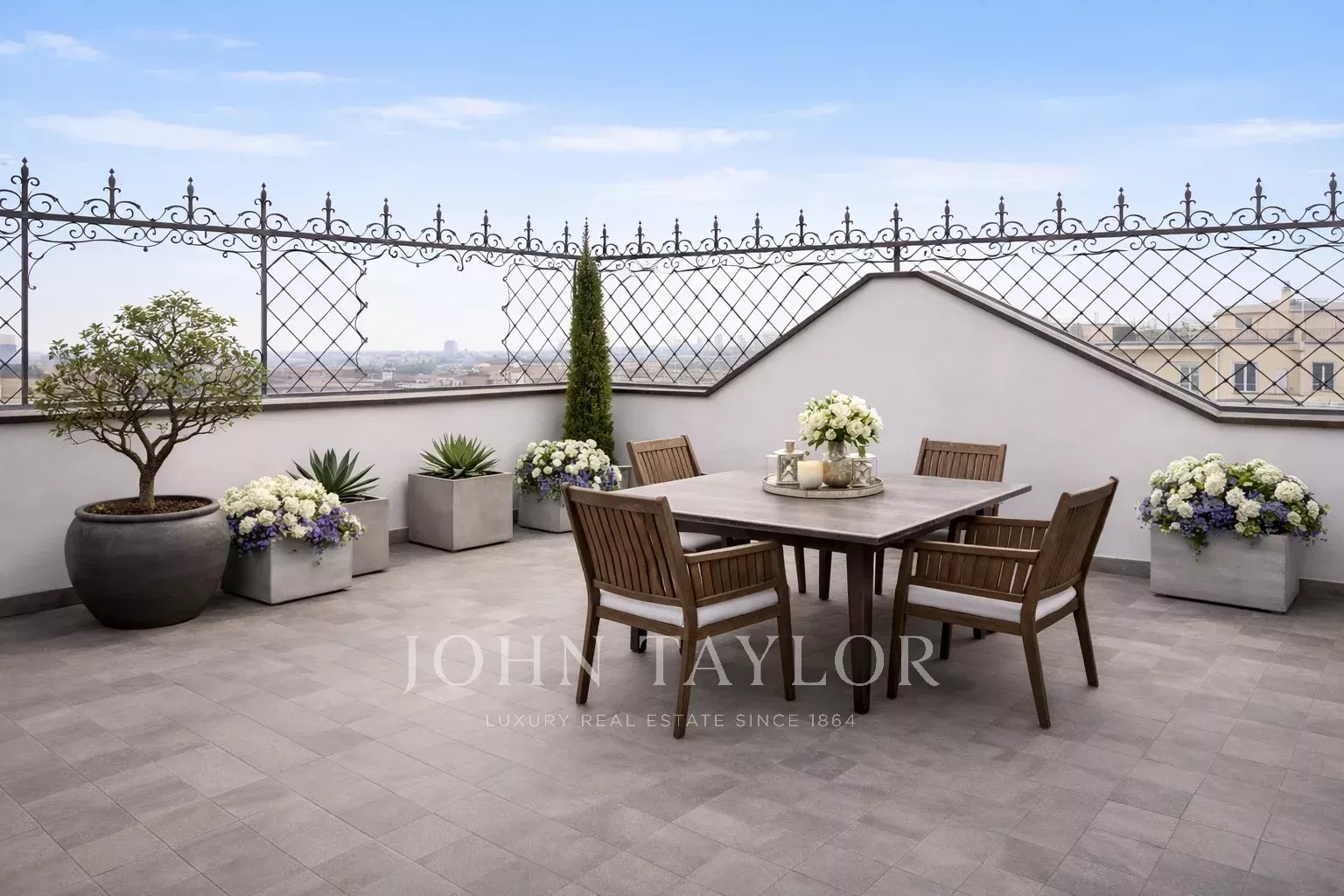 John Taylor Exclusive - In the most exclusive heart of Milan, in a splendid setting of great historical value, prestigious and exclusive penthouse of approximately 200 sqm, full of charm, set in a context of absolute privacy and silence. A representative property, very bright and quiet, featuring a wonderful and large planted and furnished terrace. The residence consists of two entrances, a large double living room with fireplace, an elegant dining room, a kitchen with valuable custom-made furnishings, two spacious double bedrooms both with fireplace, a study, two walk-in closets, a laundry room, and two bathrooms. The penthouse has undergone a refined renovation with finishes of the highest quality, enchanting original exposed beams, parquet flooring in planks made from Venetian “briccole” wood, a lighting system, splendid boiserie, and an advanced home automation system. The project, curated by a renowned Milanese architecture studio, enhances every space through interior design choices and built-in furnishings from the most prestigious international brands. Possibility of a parking space in the immediate vicinity. Energy class C.