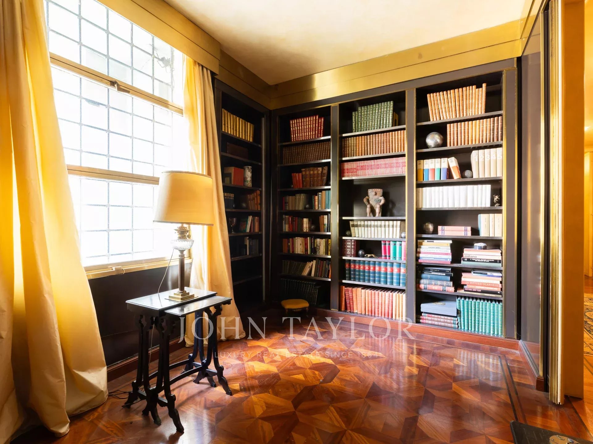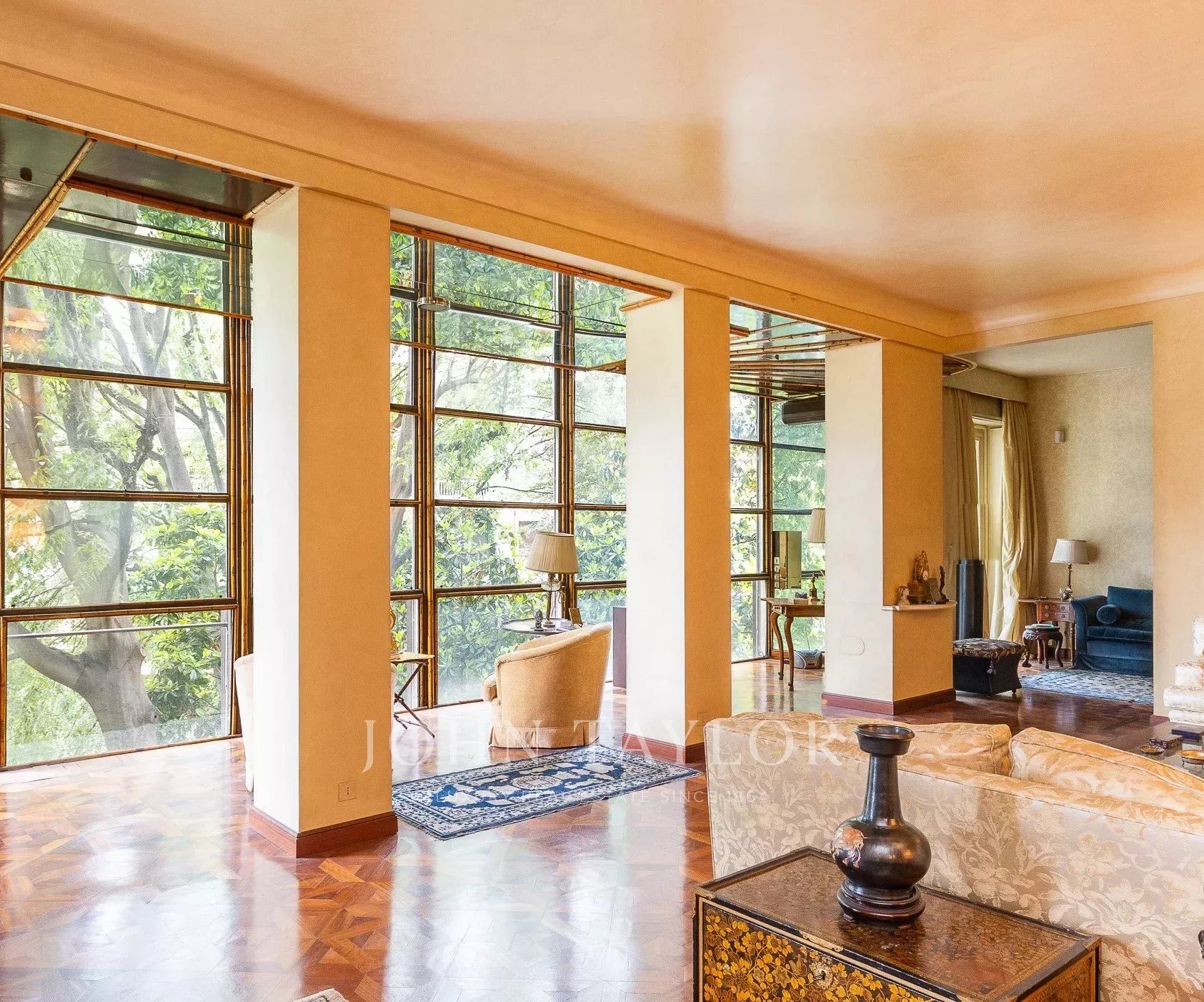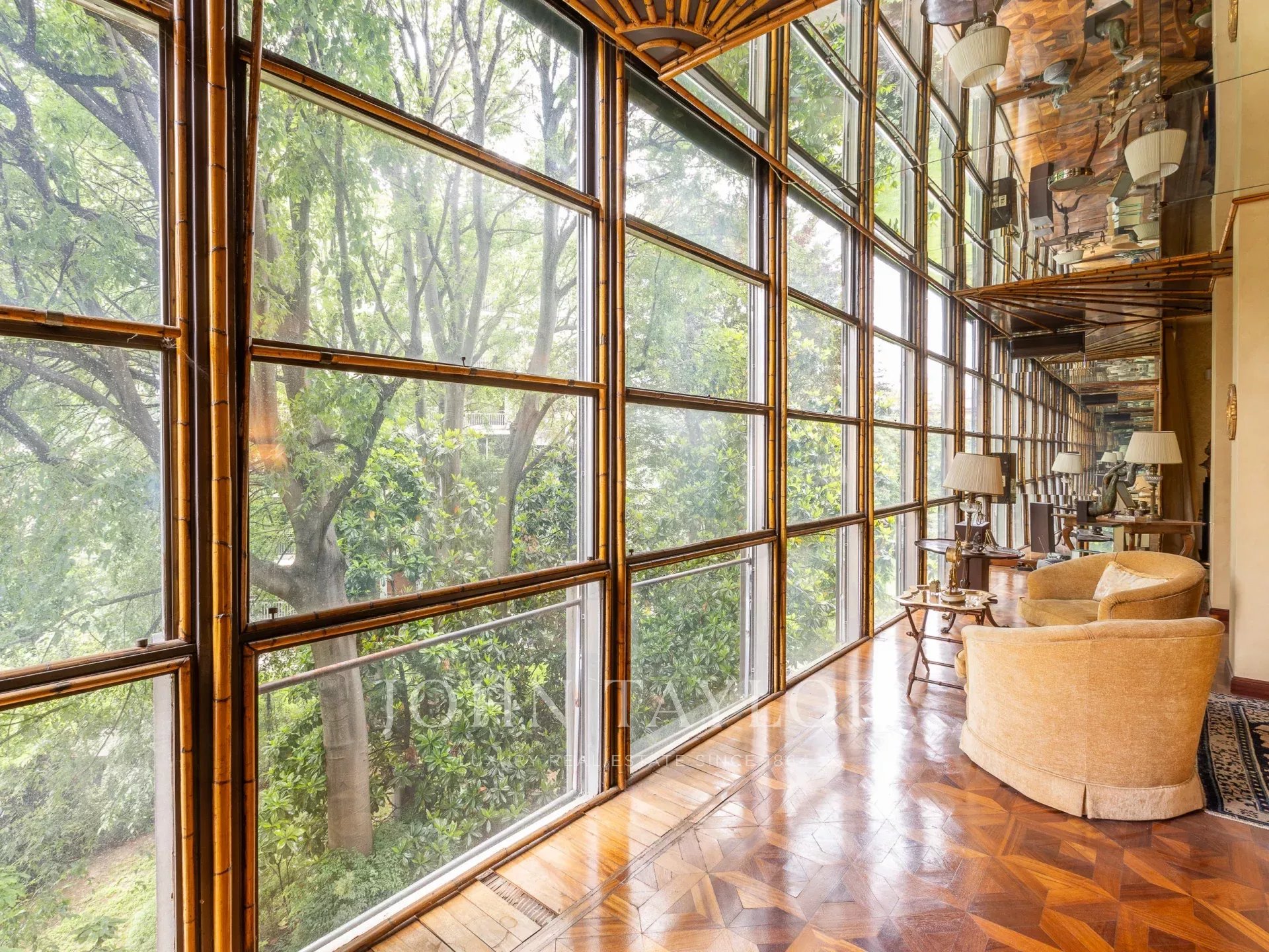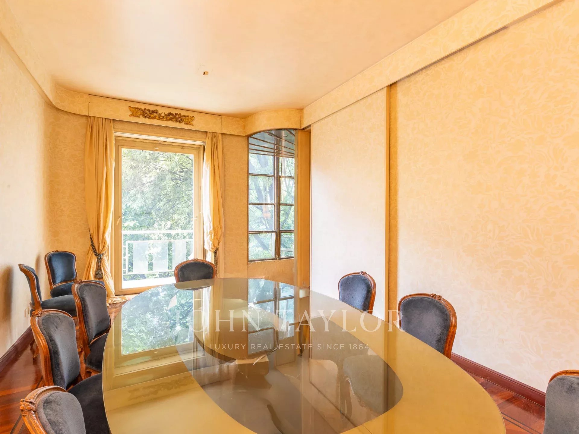 In an exclusive context with full time concierge, maximum security. Prestigious residence of approx. 480 sqm, with great charm and unique on the floor with two entrances. Large beautifully presentable recieving area with splendid views of greenery, very bright and quiet, with very high ceilings. Comprising a large entrance hall, spacious living room, large dining room, TV lounge, 5 bedrooms, library, walk-in closets, study, 5 bathrooms. Vast eat-in kitchen with more cupbard space adjacent, laundry room, ironing and housekeeping area, spacious storage room, houskeeper’s bedroom. Highest quality finishes. Large cellar. This beautiful property is completed by 2 large garages in the building. PRIVATE INFORMATION IN OFFICE.