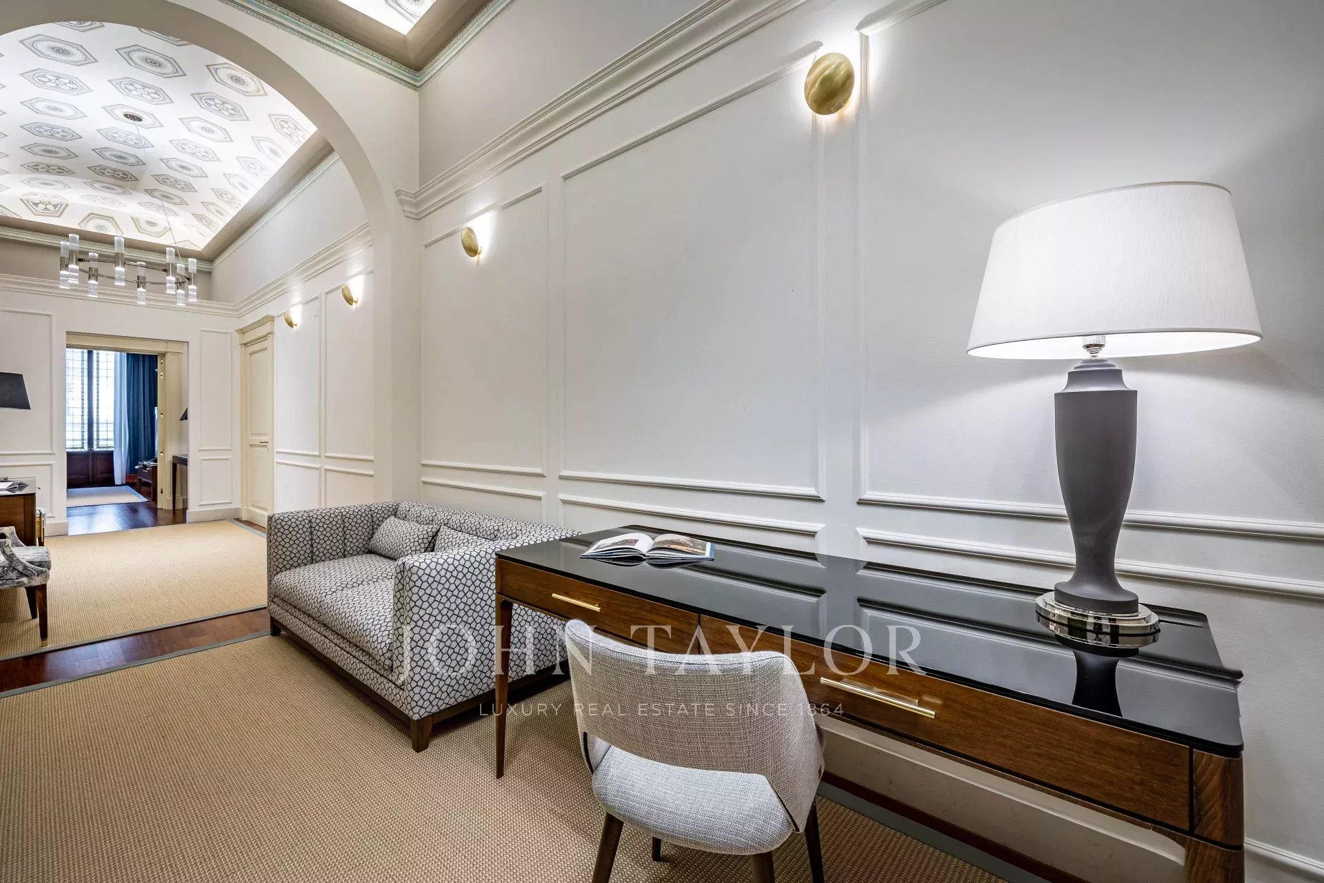 Inside, the spacious living area showcases original frescoes and majestic coffered ceilings. The modern kitchen provides direct balcony access, complemented by two large bedrooms, four bathrooms, and a convenient laundry room.