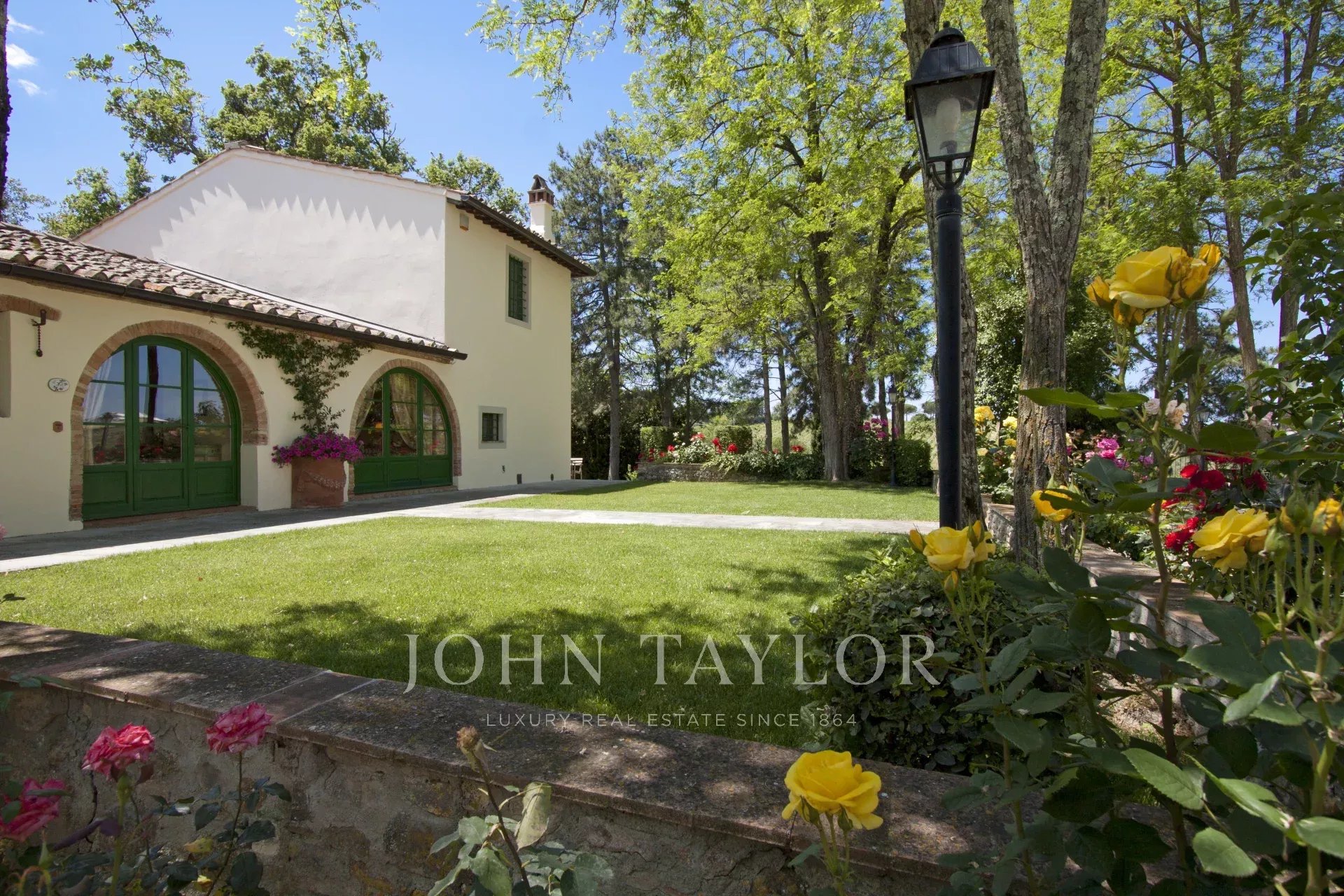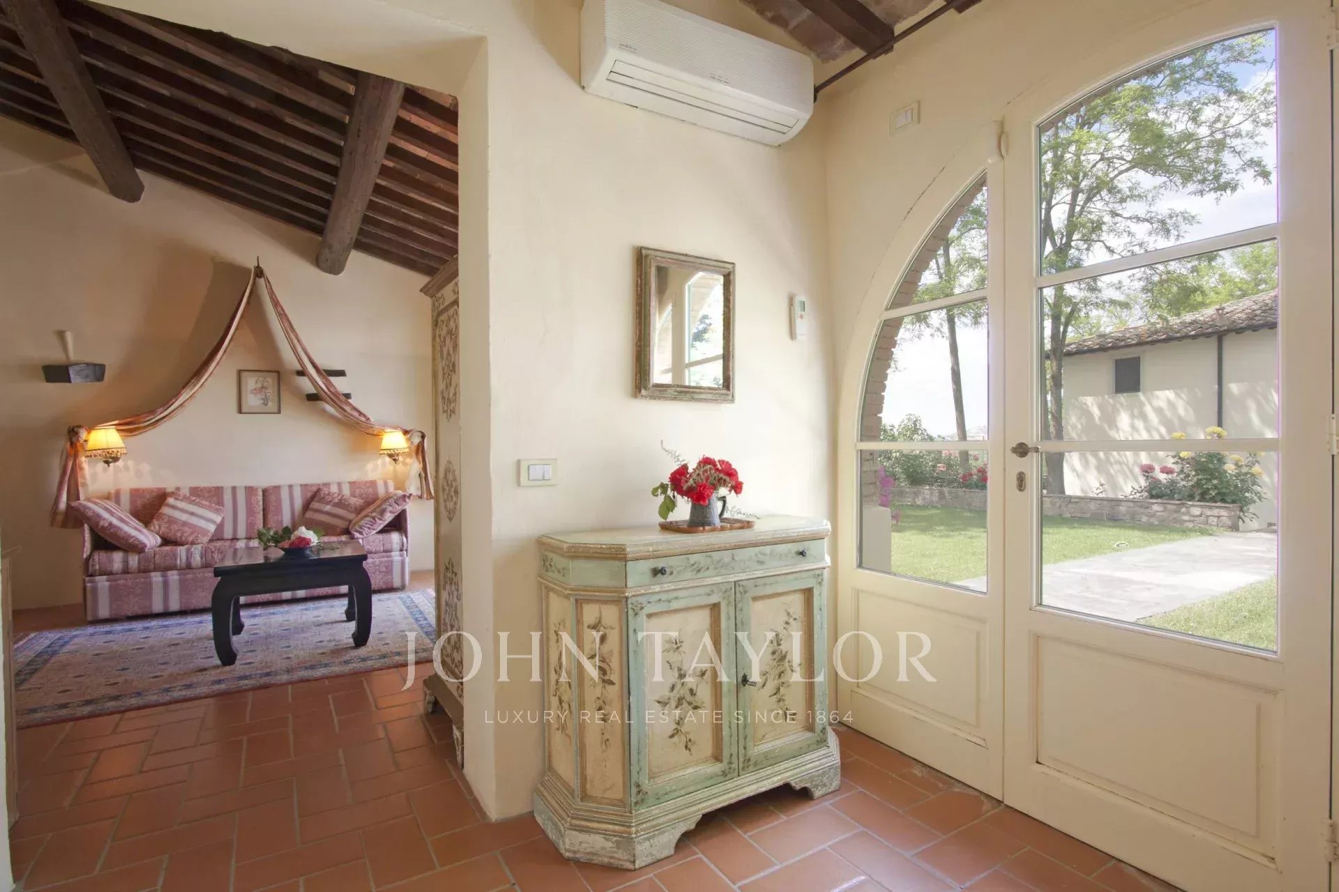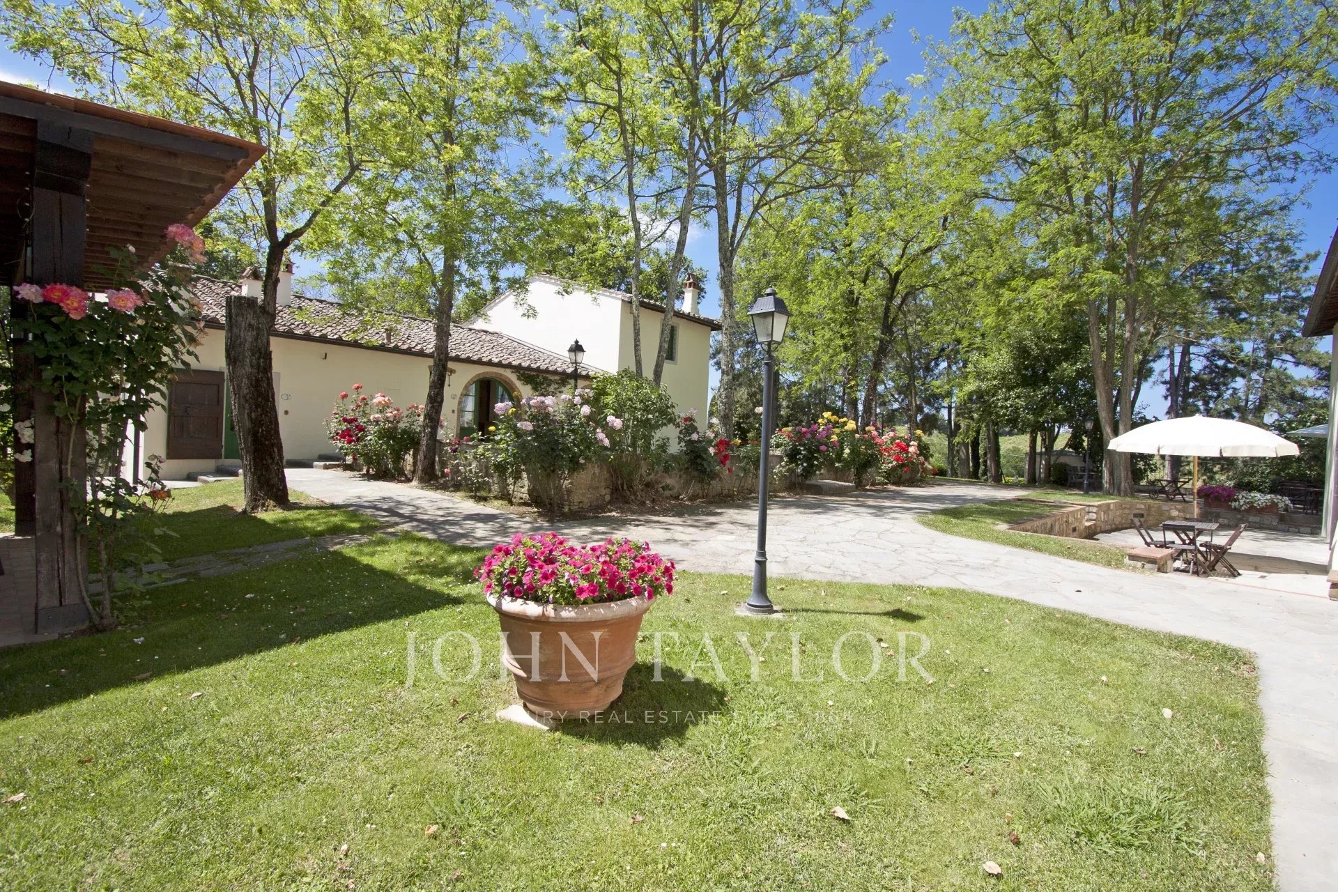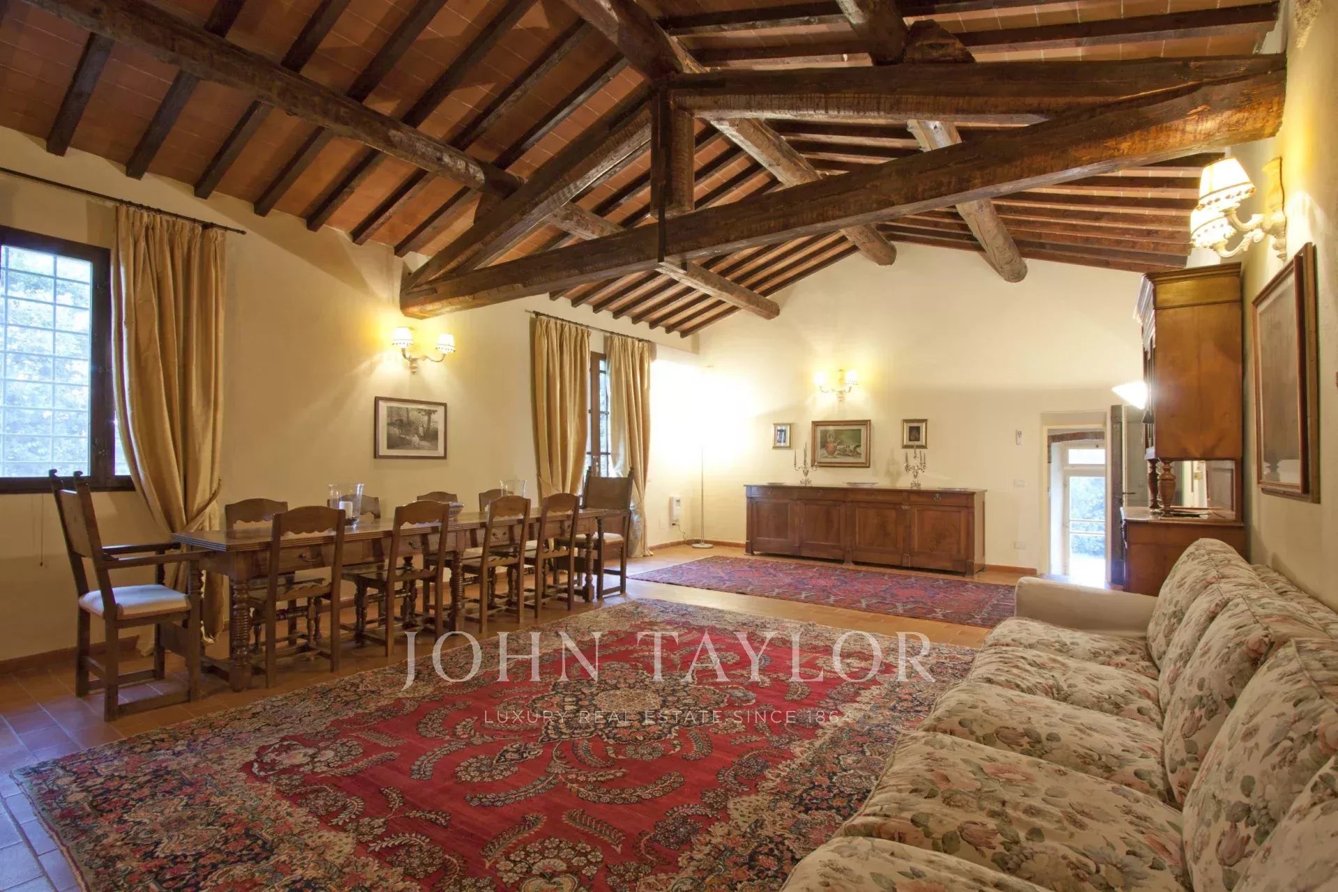 Located halfway between Florence and San Gimignano, on the road to Siena, the property is reached via approximately 1.5 km of a well-maintained gravel road. The estate extends over 13 hectares of fields and woodland, including a beautifully maintained garden of about 1,000 sqm with a swimming pool and a one-hectare vineyard.