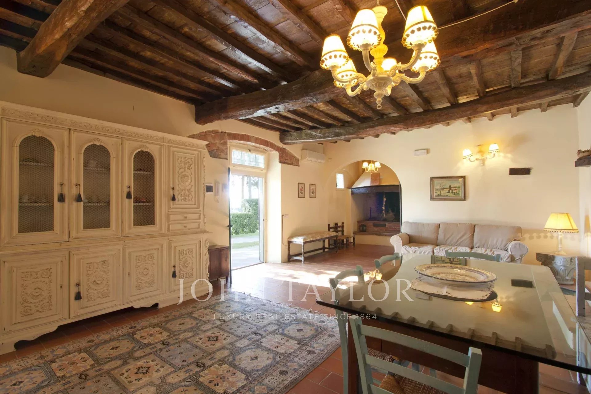 The property, measuring around 250 sqm is arranged over two levels: on the ground floor, there are two kitchens, two living rooms with fireplaces, a spacious reception hall with an impressive fireplace, and two bedrooms, along with service areas. On the first floor, you will find two large bedrooms and two bathrooms.