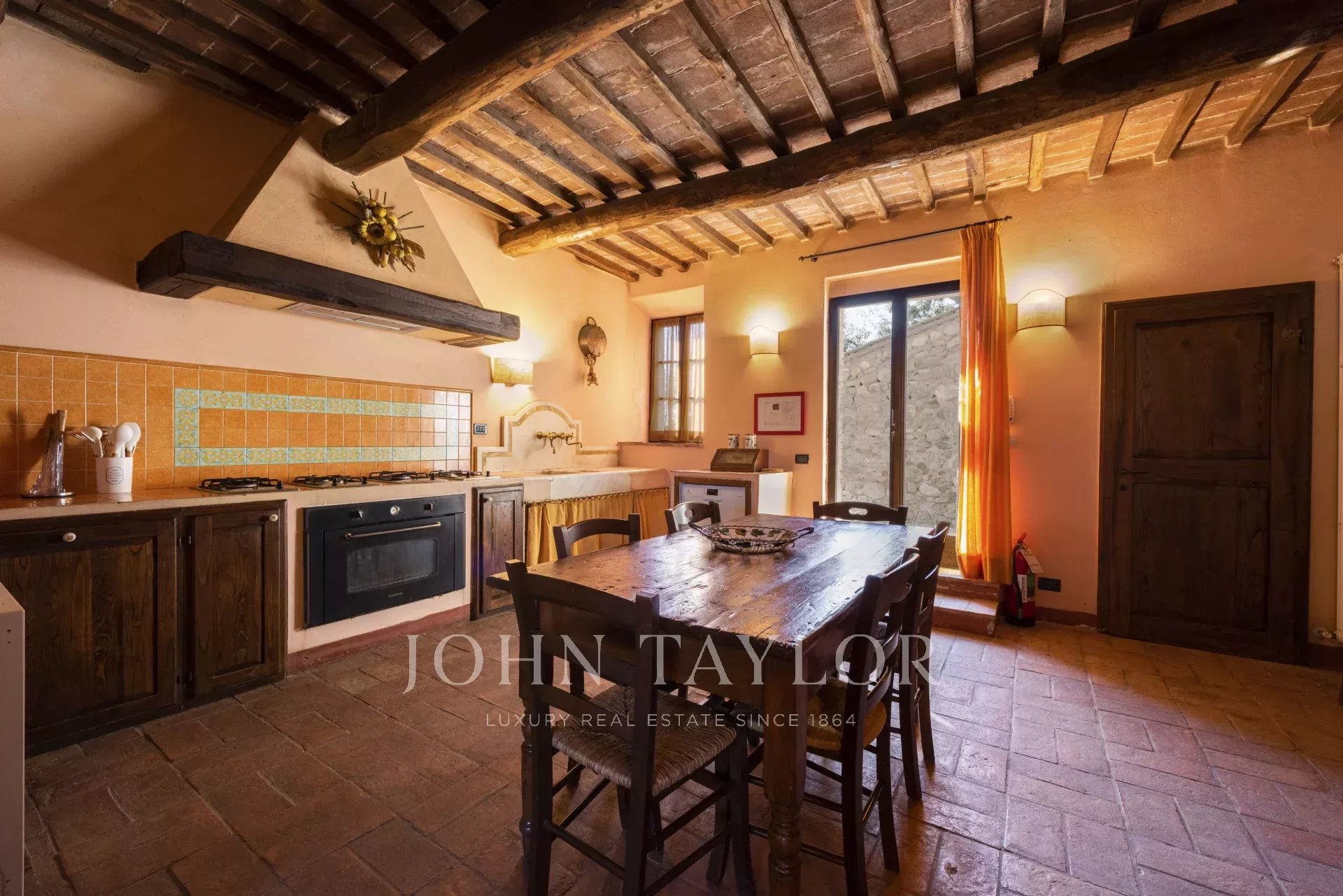 Adjacent to the main building is a guesthouse of approximately 290 sqm, featuring a living room with fireplace, kitchen, two double bedrooms with en-suite bathrooms, and private outdoor areas. The interiors showcase exposed wooden beams, terracotta floors, and natural stone details, all carefully restored to preserve the authentic character of traditional Tuscan rural homes.