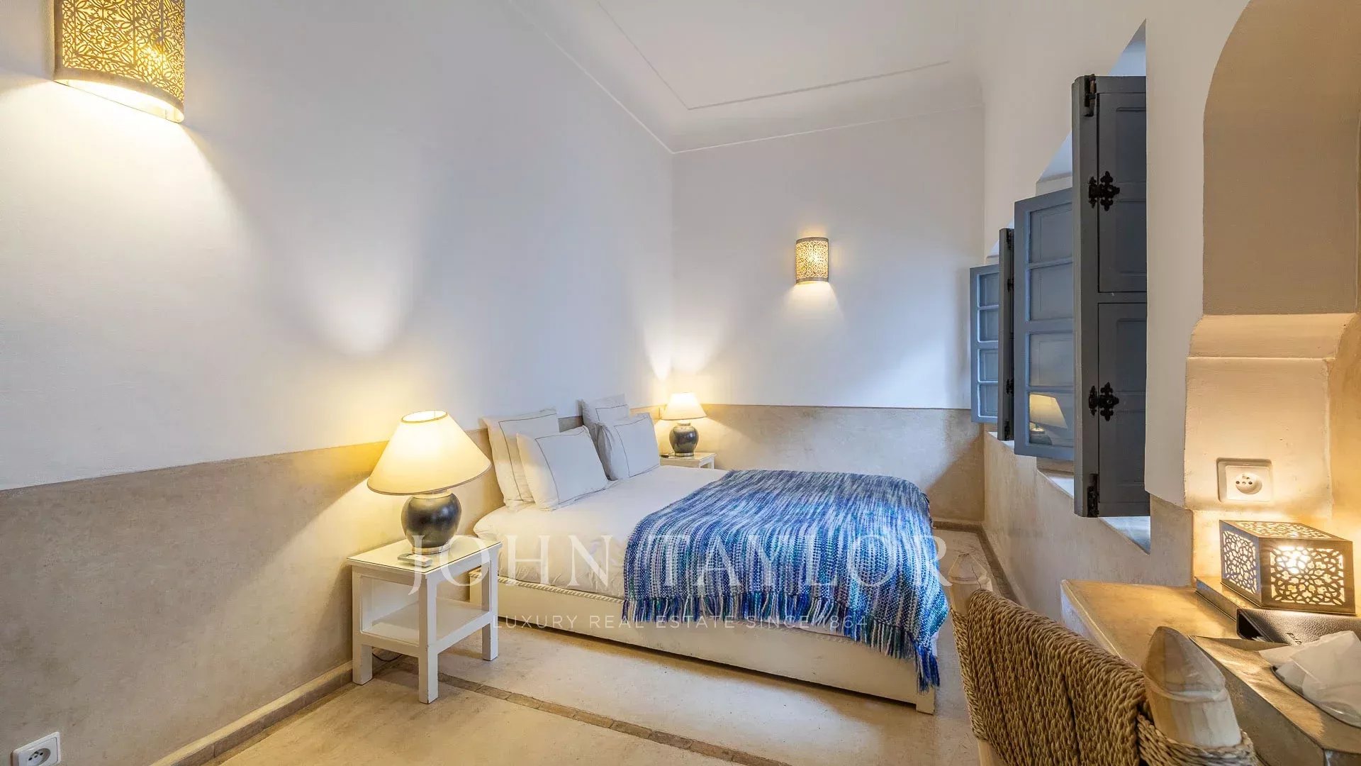With two traditional courtyards, this titled property features a jacuzzi, Moroccan hammam, several lounges with fireplaces, a fitted kitchen, and staff quarters. The riad includes a stunning roof terrace with a solarium, dining space, and a luxurious suite offering panoramic views of the Medina and the Atlas Mountains.