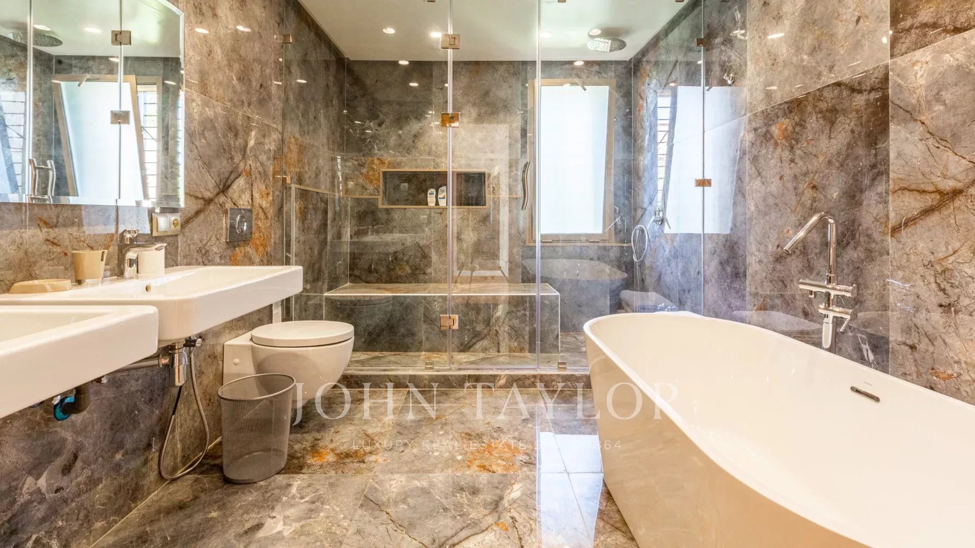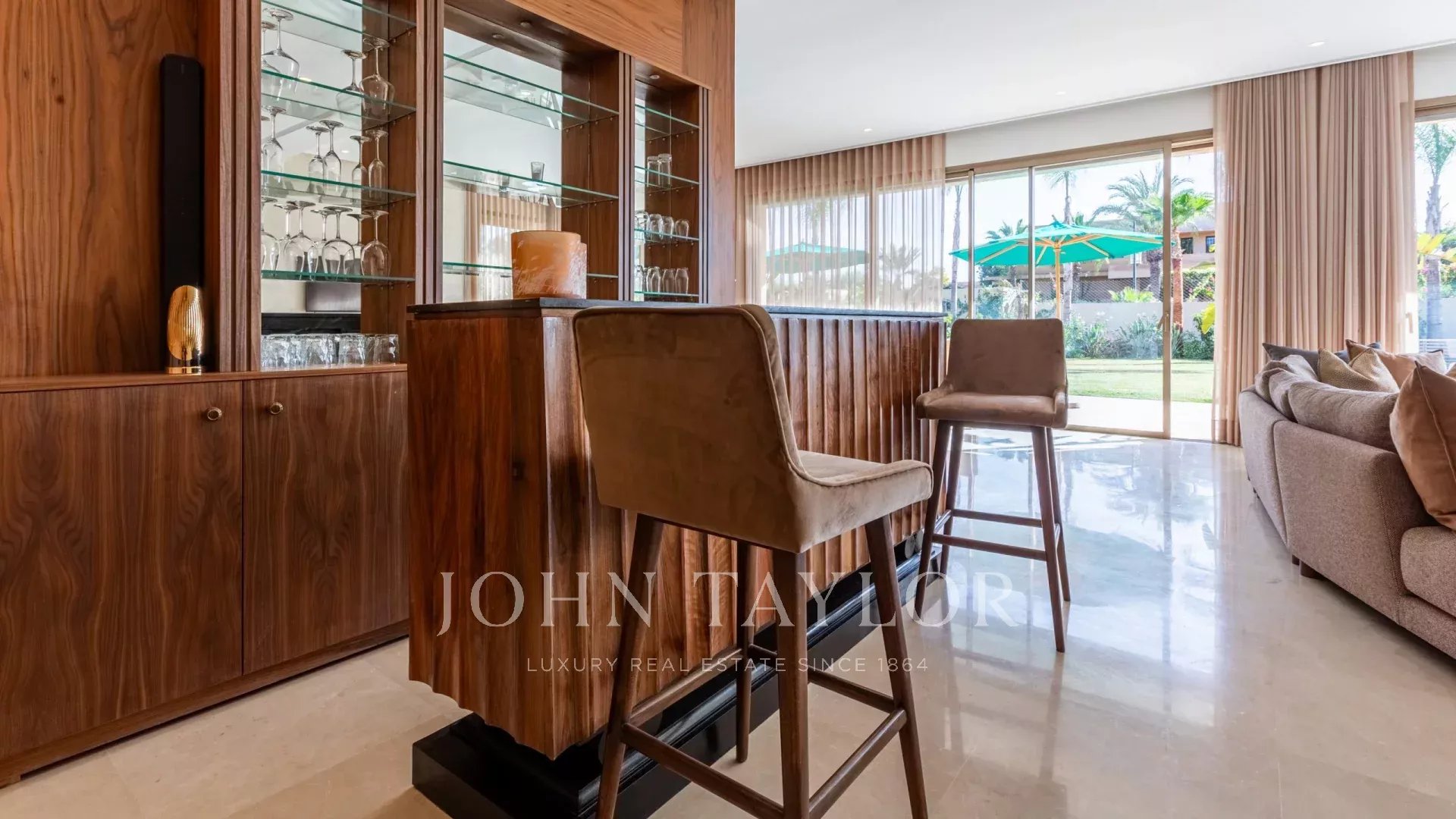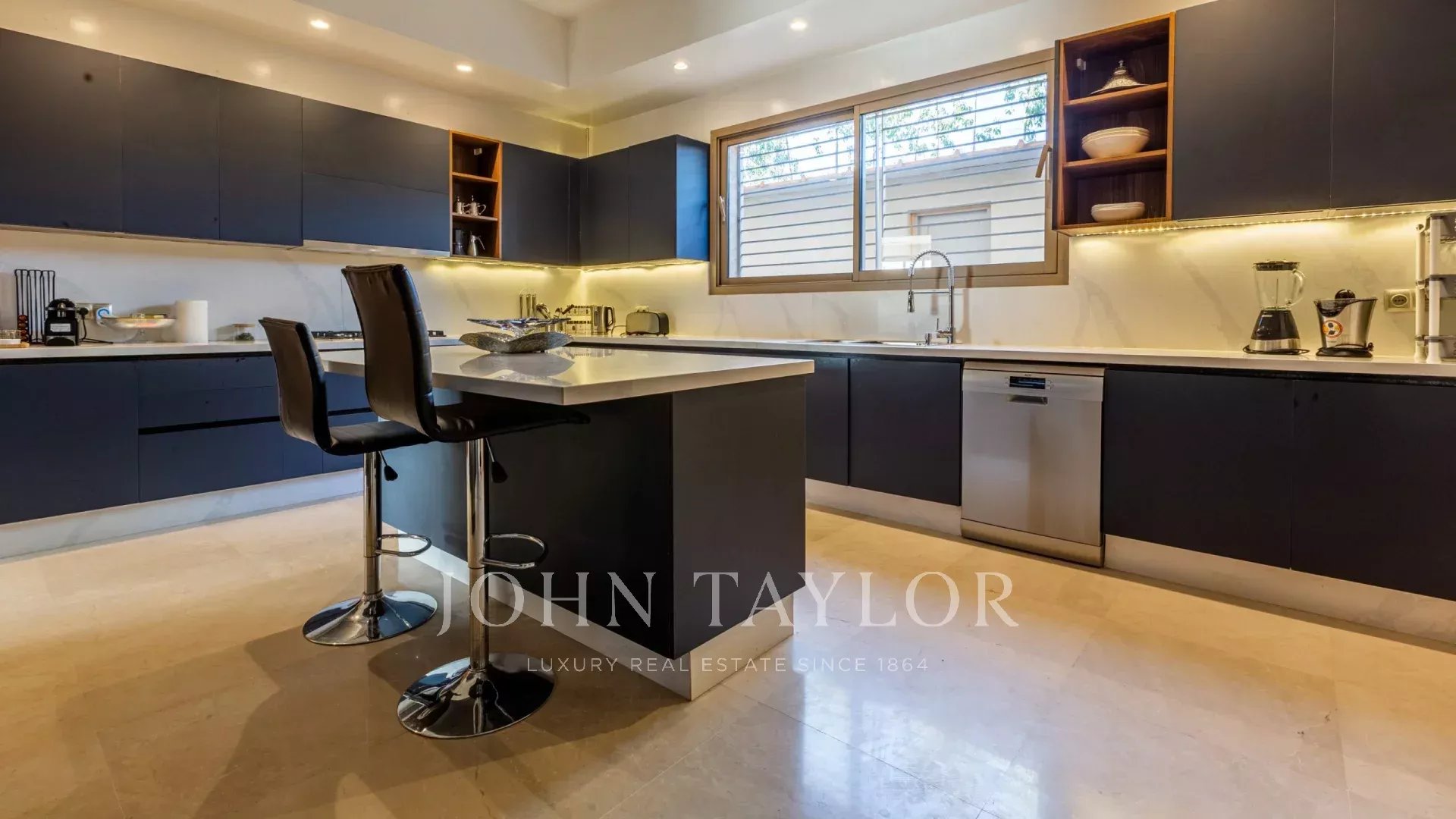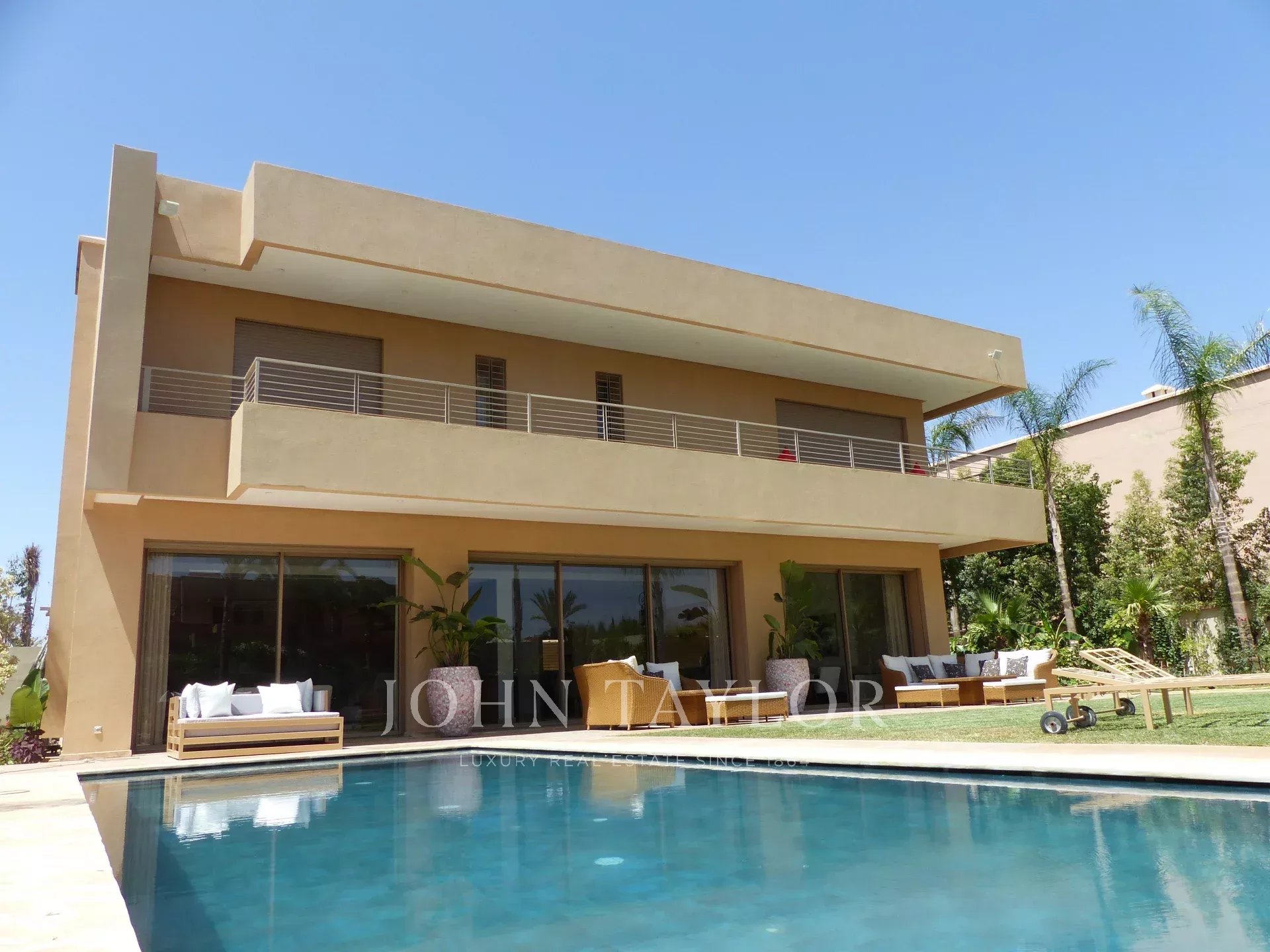 Recently built with high quality standards of materials and finishings, the villa with pure lines is nestled in a 1 200 sqm landscaped garden hosting a heated swimming-pool and a shaded parking.