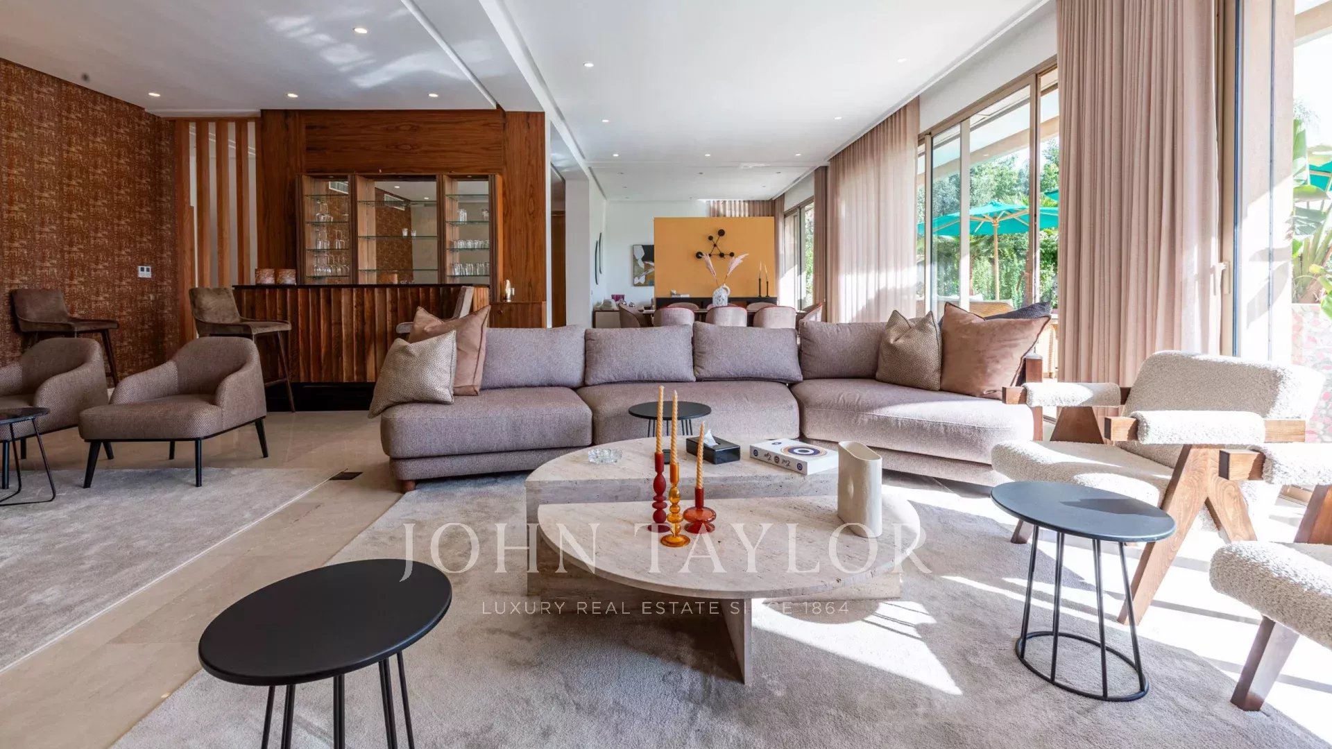 Boasting a 550 sqm internal size over 2 levels, it comprises on the ground floor: an entrance hall, a guest loo, a spacious fitted kitchen with technical area, a first ensuite bedroom as well as a large and airy reception room opening onto the shaded terrace and the pool and including a dining area and 2 lounges, one of them with a bar.