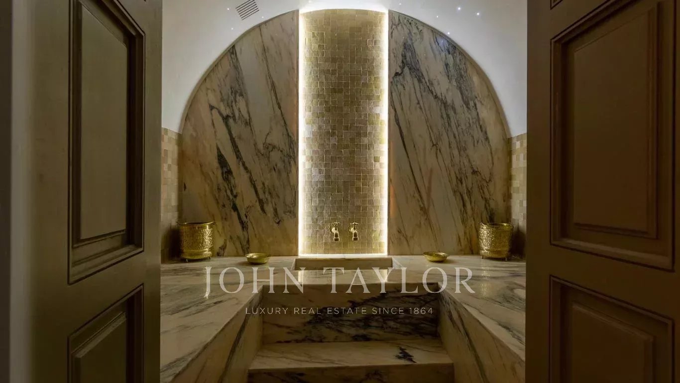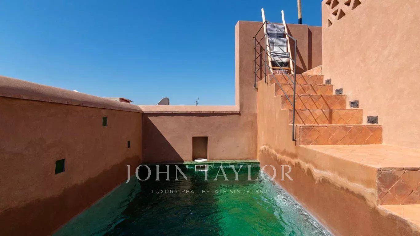 On the upper level, the roff-terrace hosts a solarium, a shaded dining, a pool (4mx3m) and an upper platform with panoramic views over the surround Medina and the Atlas mountains.