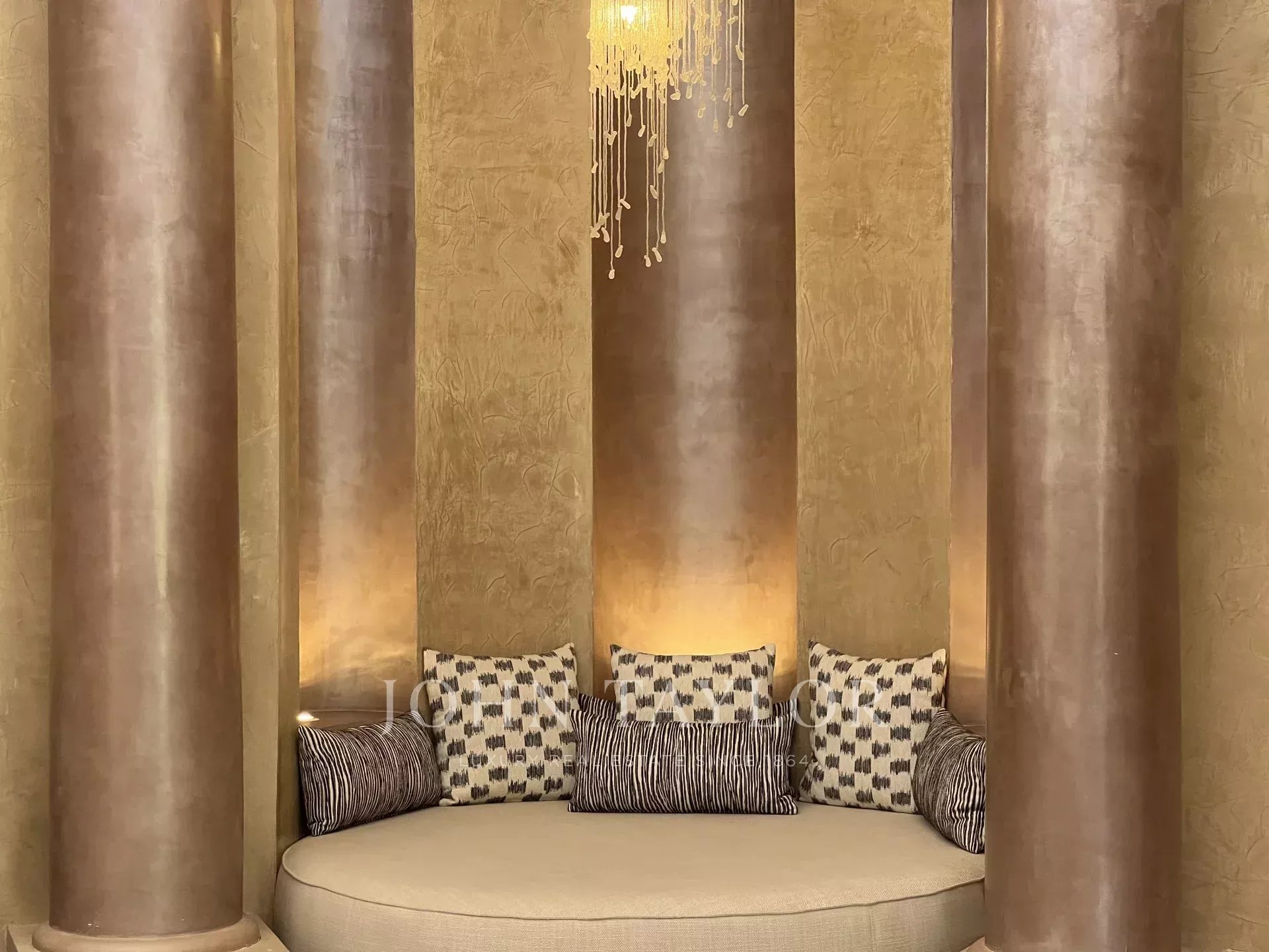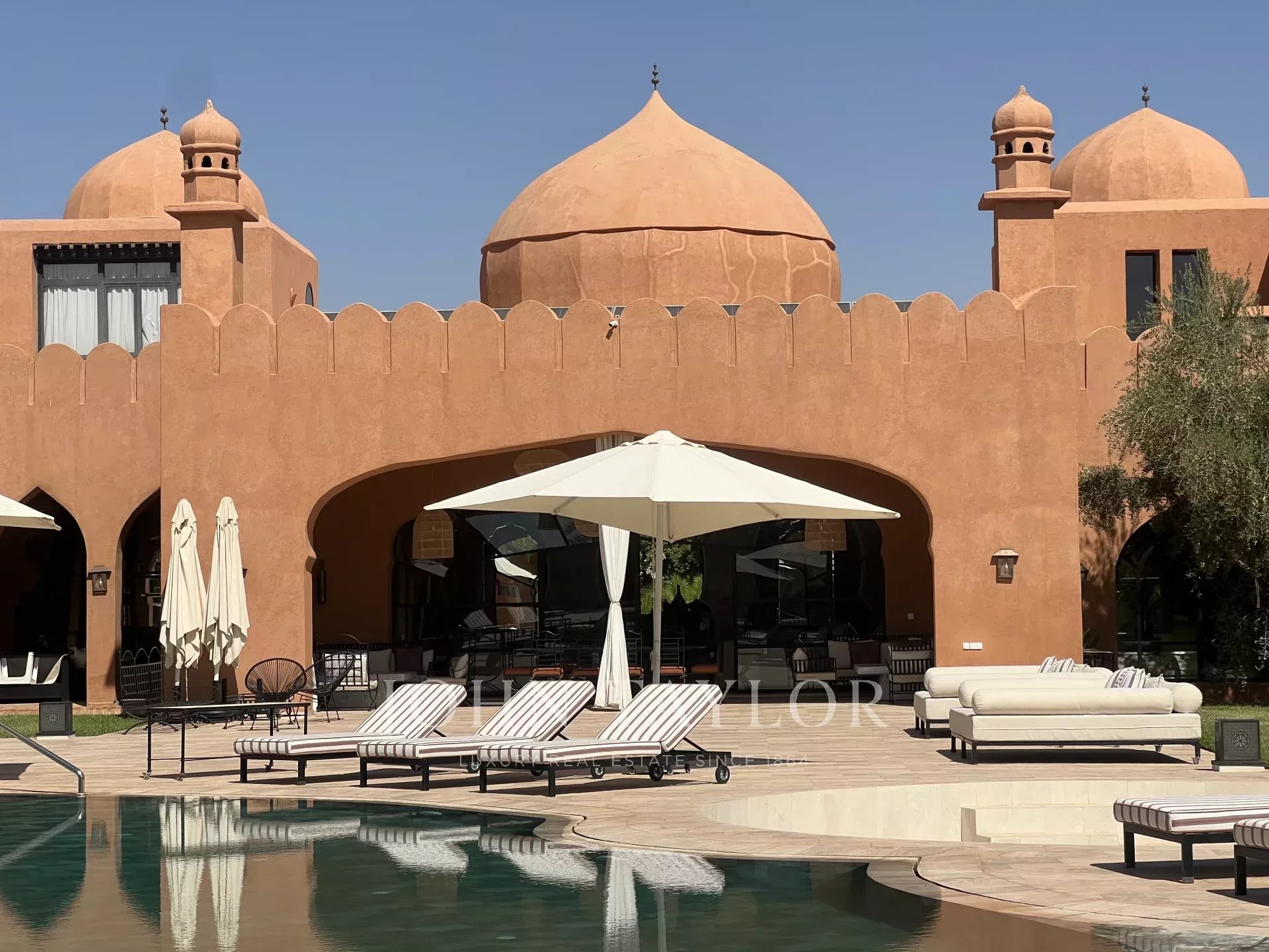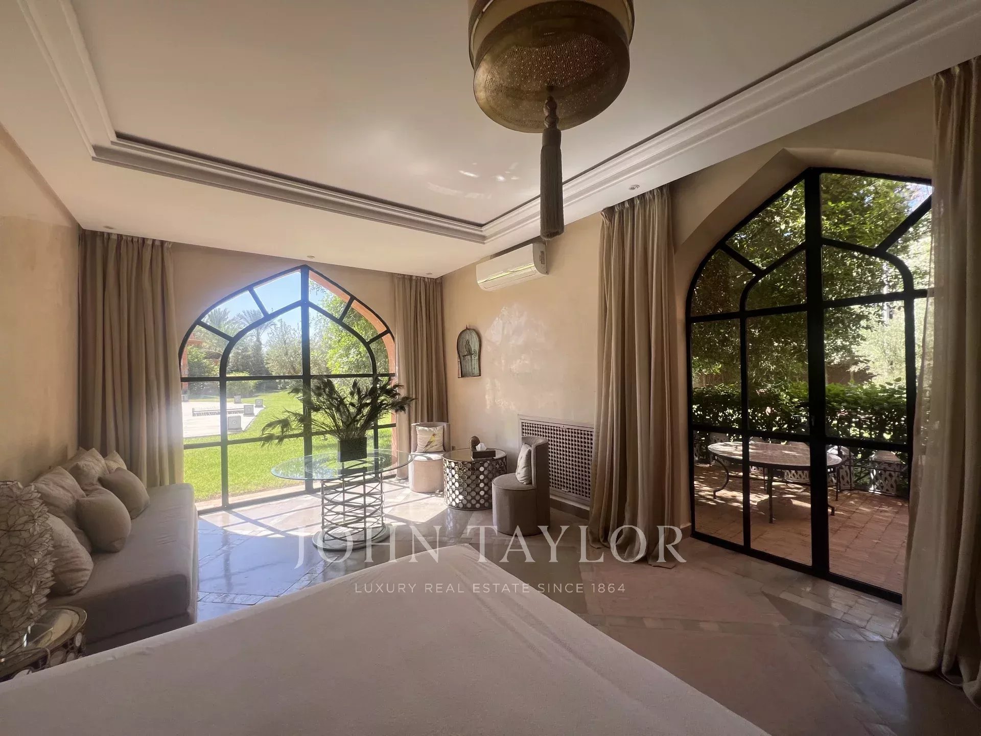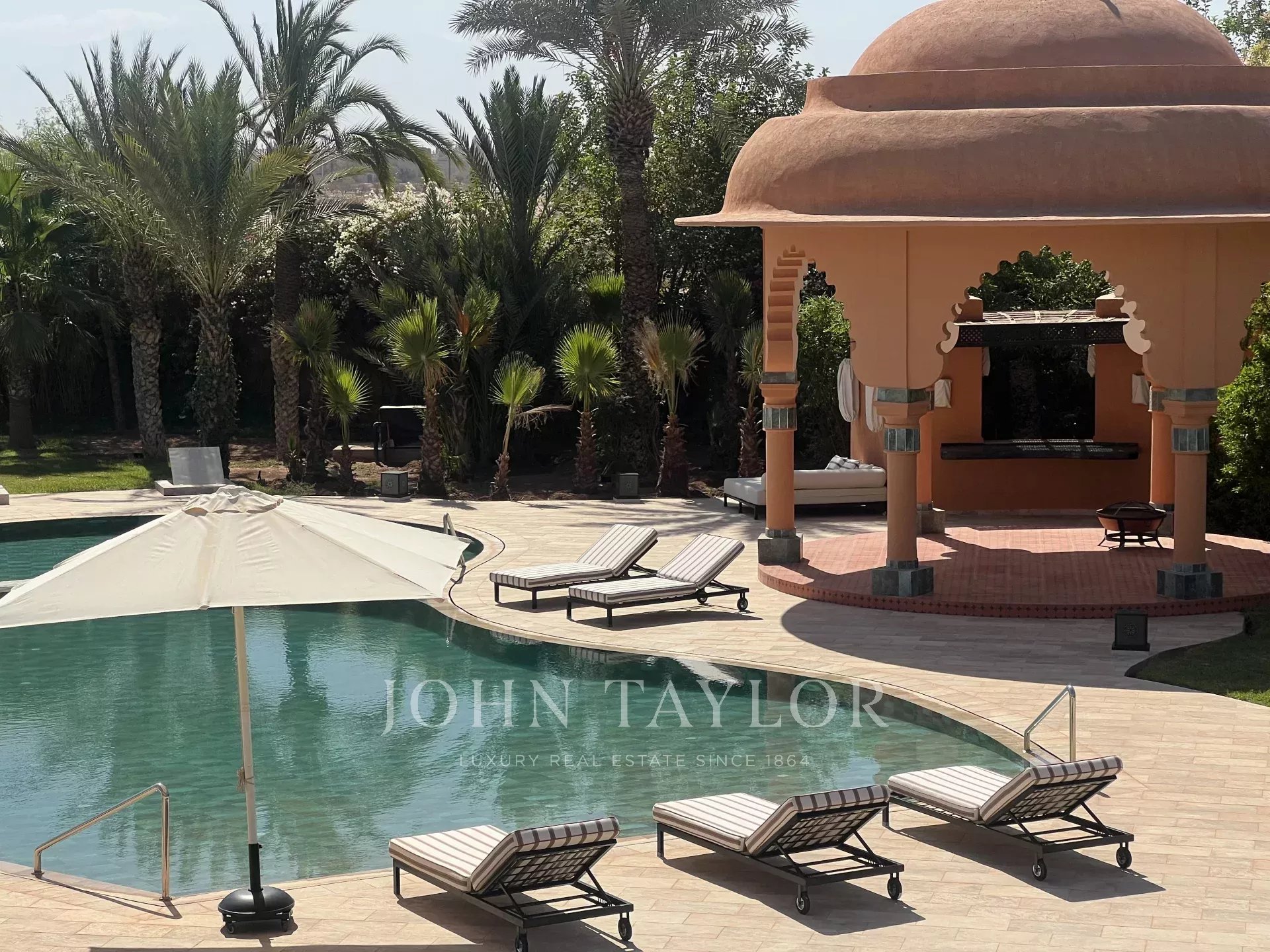 This prestigious, light-filled property is set in 1 ha of splendid landscaped grounds in a sought-after area of the Palmeraie, 20 minutes from downtown Marrakech.
